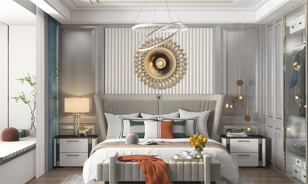 本案为130平米的户型南北通透,入户有玄关。主卧的门占用了电视背景墙,设计上做了隐形门处理。卧室的床头以硬包加金属线条为背景,呼应了客厅的灰色系,对称的床头柜与台灯,为卧室带来奢侈而时尚的现代气息。U型的橱柜在右侧设计了冰箱加上定制高柜嵌入蒸箱烤箱,美观的同时增加了西厨的功能。配色上采用了深色夹一些金属线条边框来增加光泽感。餐厅布置上多人位的餐桌,摆上大理石台面的餐桌,有些跳跃色彩的皮质餐椅搭配金属脚凳,侧边餐边柜的设计增加储物的同时让空间更加富有层次。本套设计案例对于功能和色彩方面以冷灰的色调为基准,后期通过地面斜铺处理,把空间视觉做到最大化的扩容,顶面由于中央空调的使用,增加顶面设计的多样性,可以把房屋整体的层次美做到最合理的展现,护墙板的运用无疑是整体家具色调的一种融合,深中浅色调的比例调配,使后期居住起来色彩更丰富趣味化。