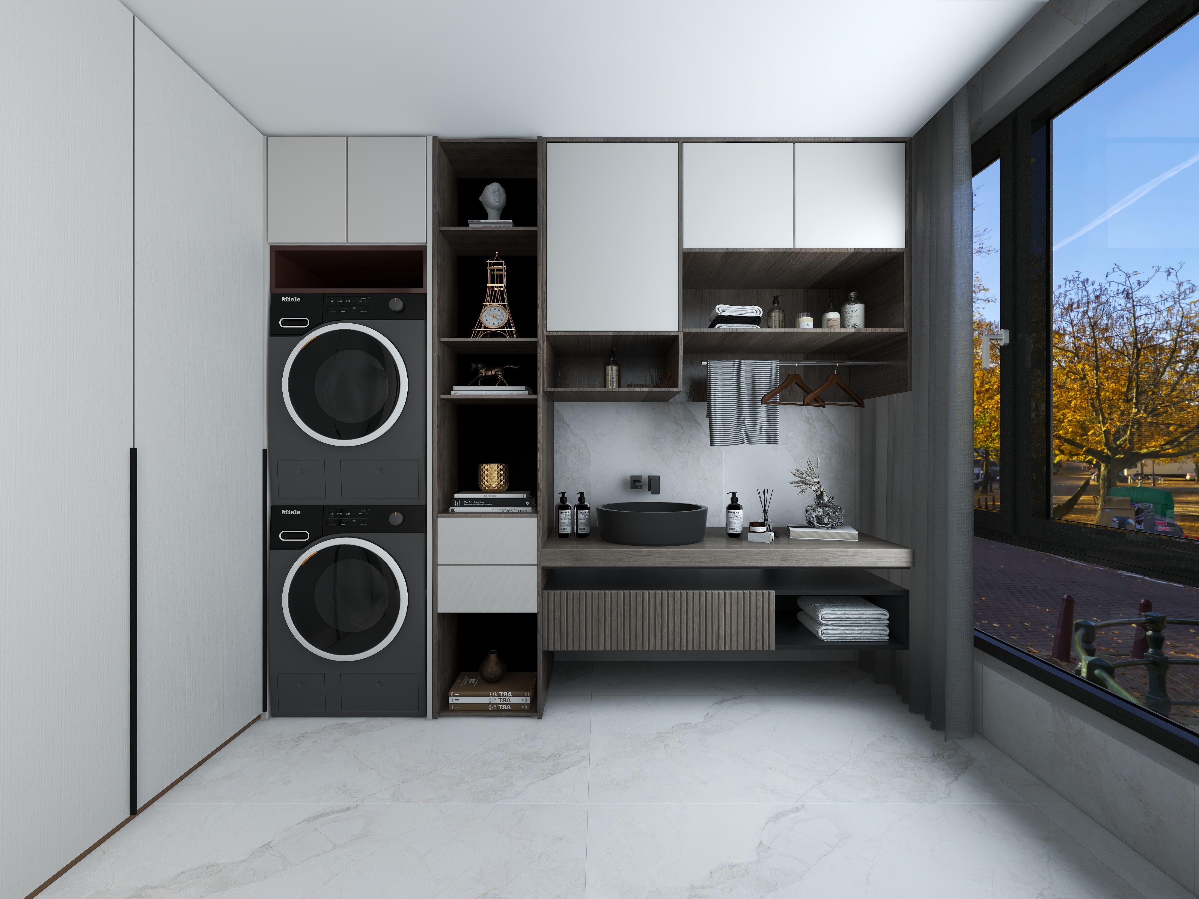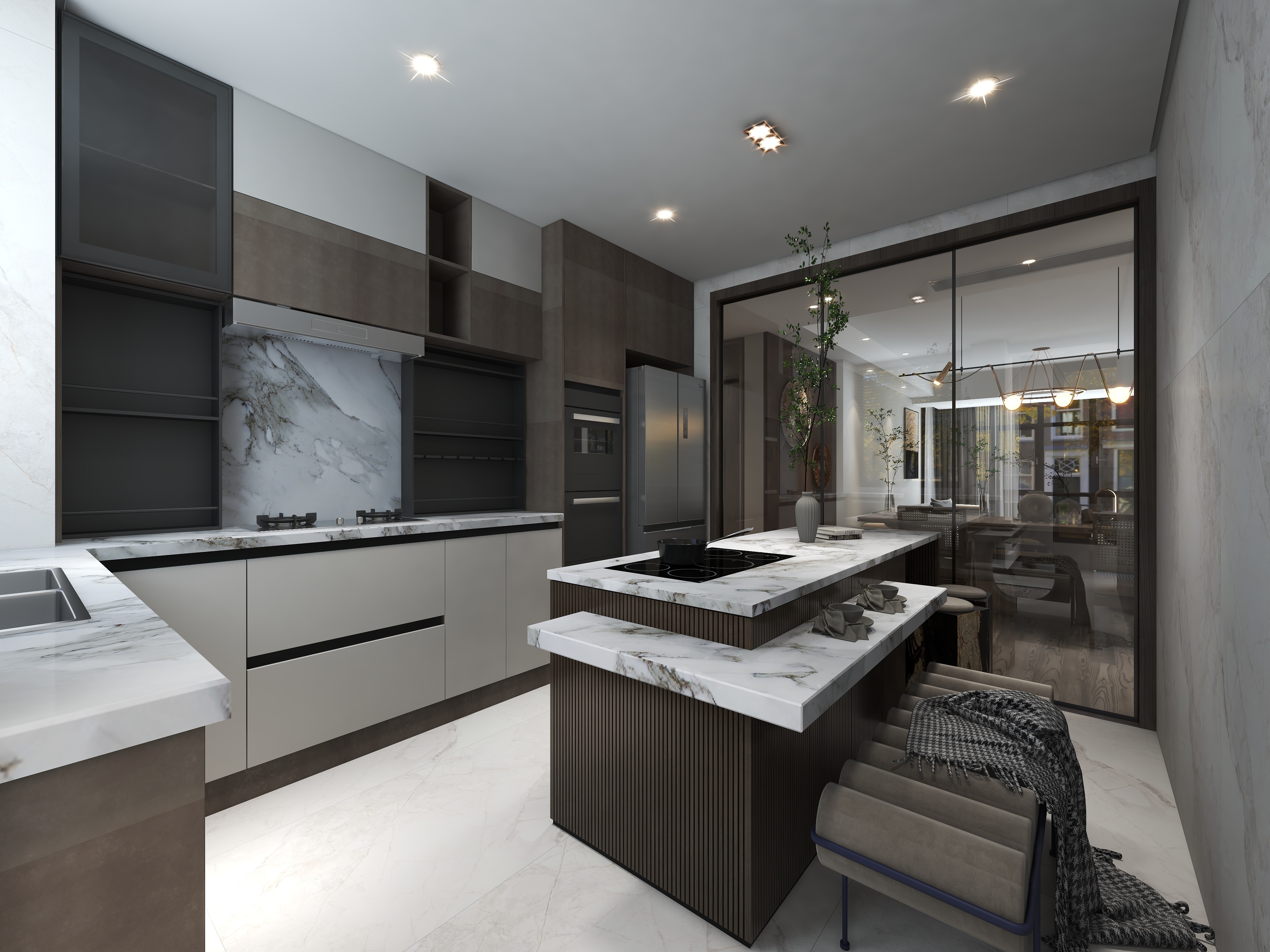 当中采用了灰色系列,黑白灰在整个空间当中平衡的搭配让整个空间的气质变得更加轻奢,同时,营造整个空间的整体氛围。朴实、纯粹的材质与简约和自然。极致舒适的画面贯穿每一个空间,让每一件物品彰显艺术陈列的视觉。餐厅和客厅设计师打造开放式的空间,让整个空间变得十分宽阔,同时也巧妙地利用了小空间变大空间的设计方法