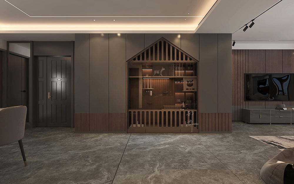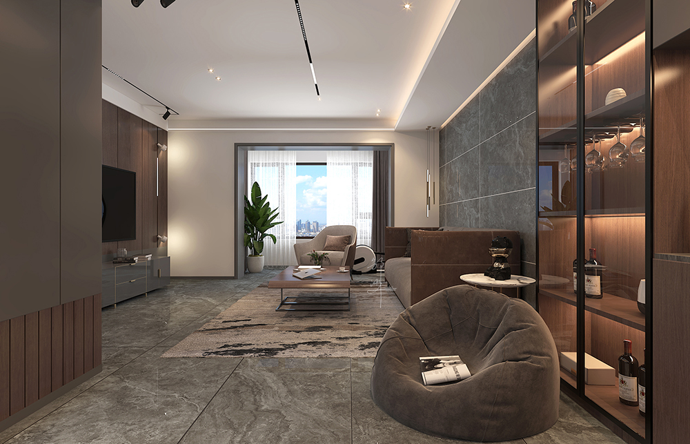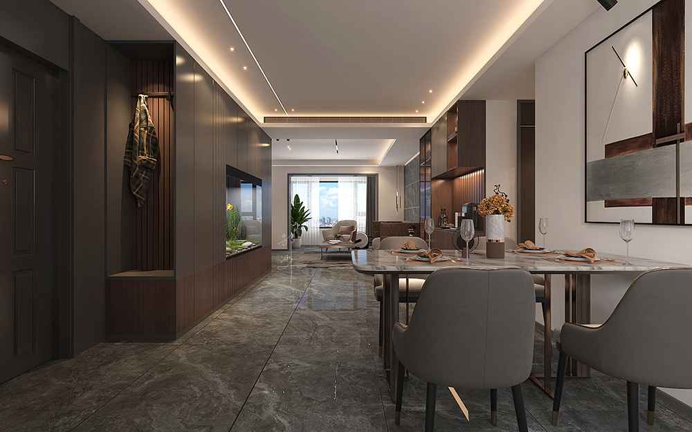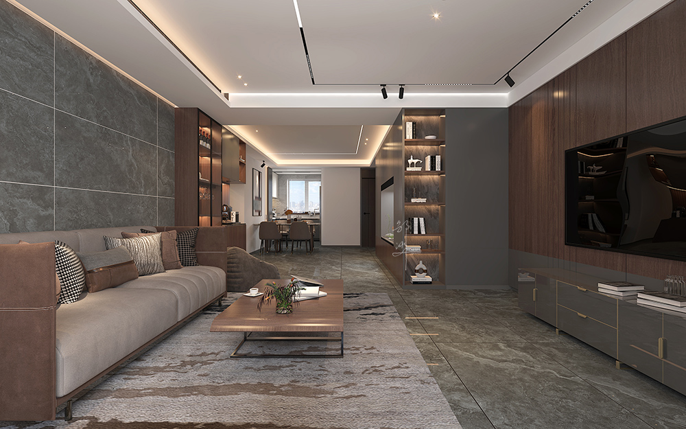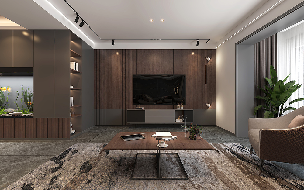 本方案采用现代风格,整体色调为深色系,看似简洁的空间却极具设计感与高级感。棕色、灰色搭配效果凸显高级。理石背景墙搭配一张布艺沙发和深木色茶几,让整个空间变得更加灵活,层次感也更加丰富。地面采用理石铺贴,搭配棕色的地毯,打造一个大气而高级的现代空间。