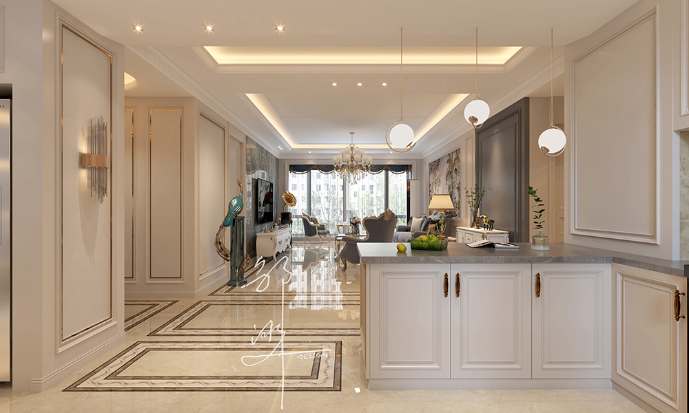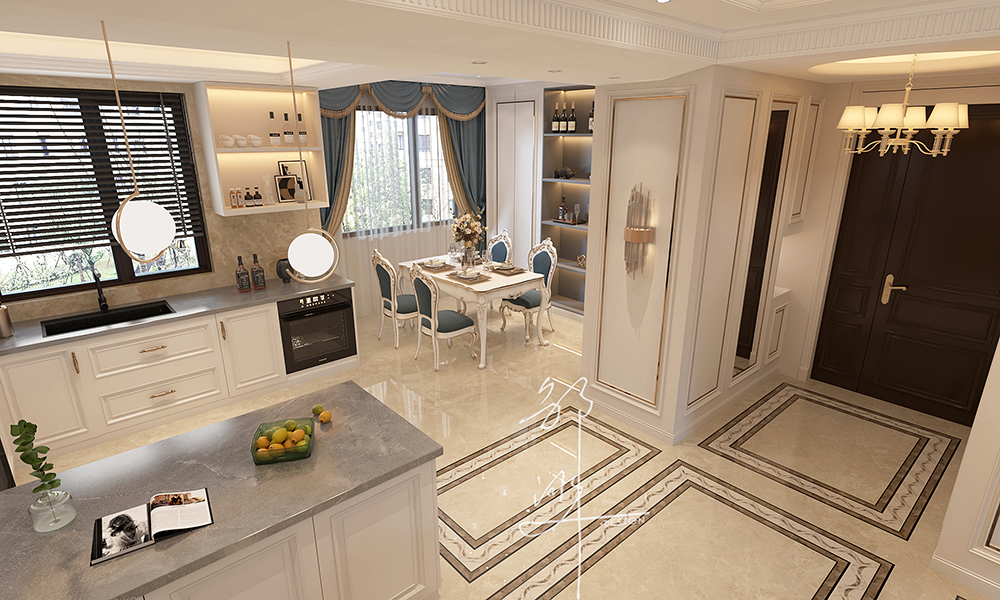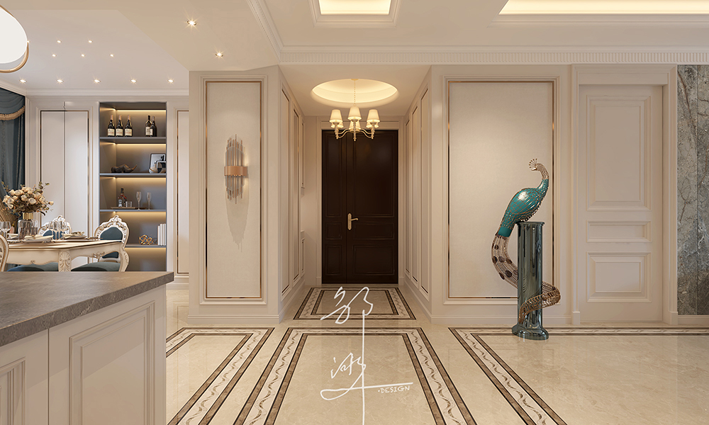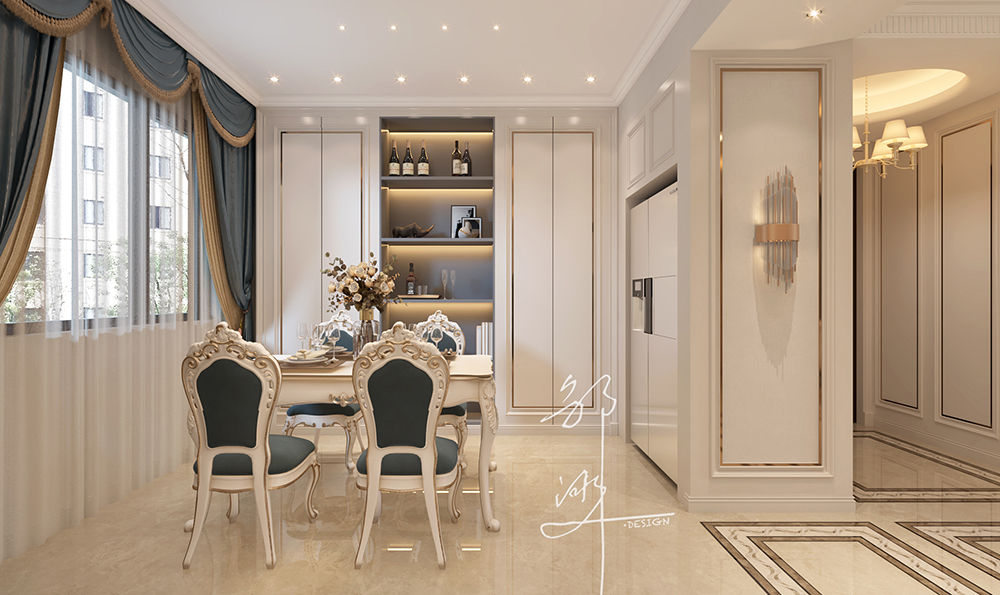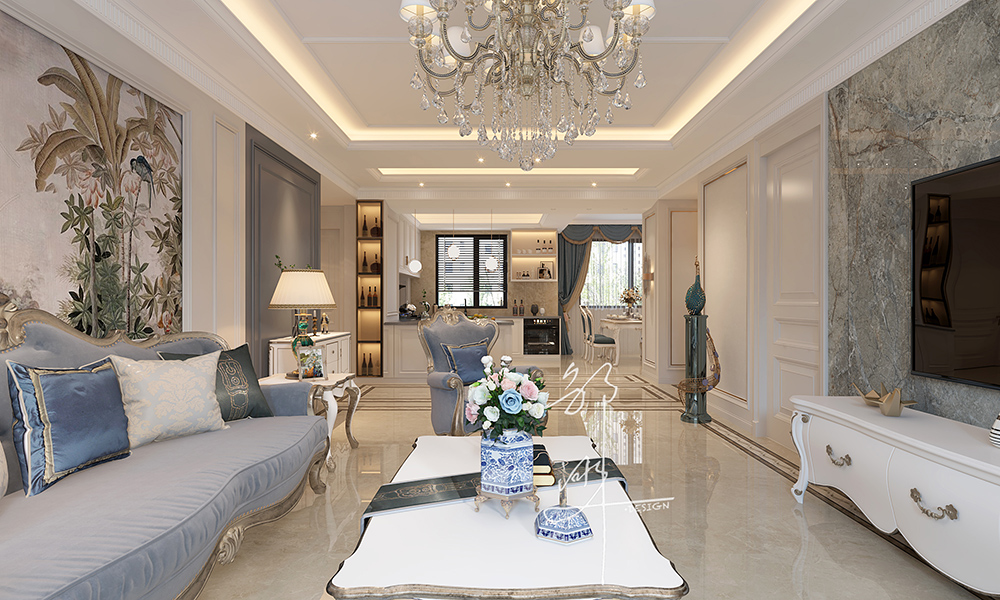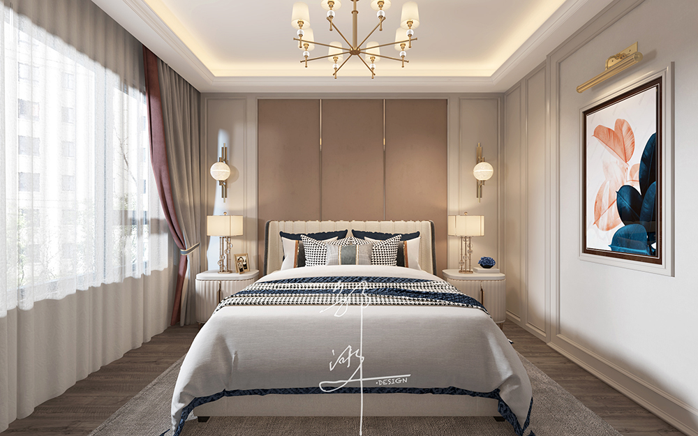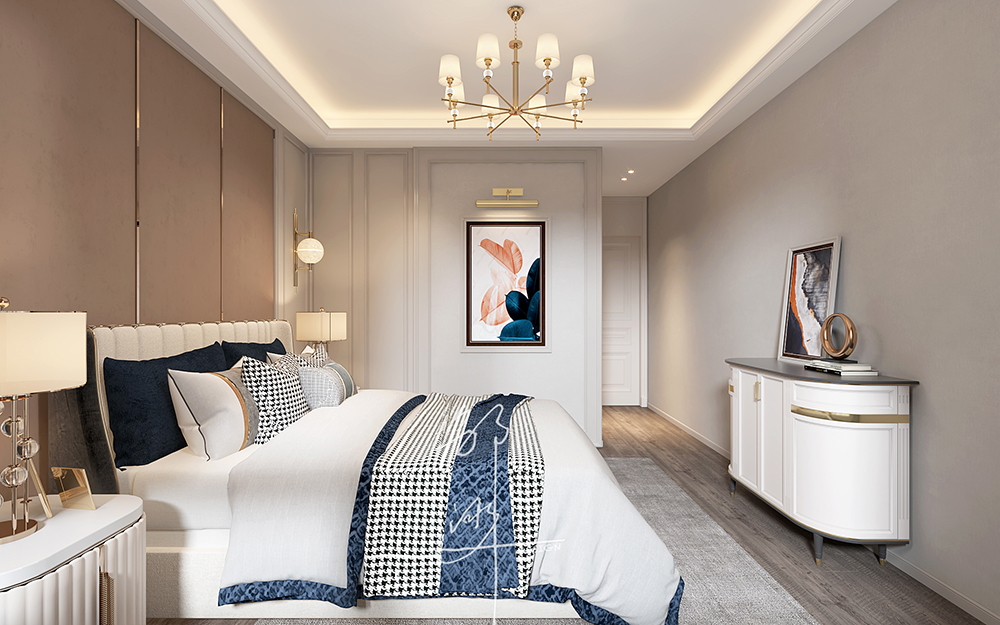 本方案采用法式轻奢风格,主要为奶油白色,软装点缀一些蓝色,再加上金属材料灯具的点缀,看似简洁朴素的外表之下却折射出一种贵族气质,这种大多通过精致的软装元素体现。法式轻奢风格演绎精致优雅,栩栩如生的造型,表达出优雅清新的韵味。整体布局和谐,干净纯粹、贴近生活。