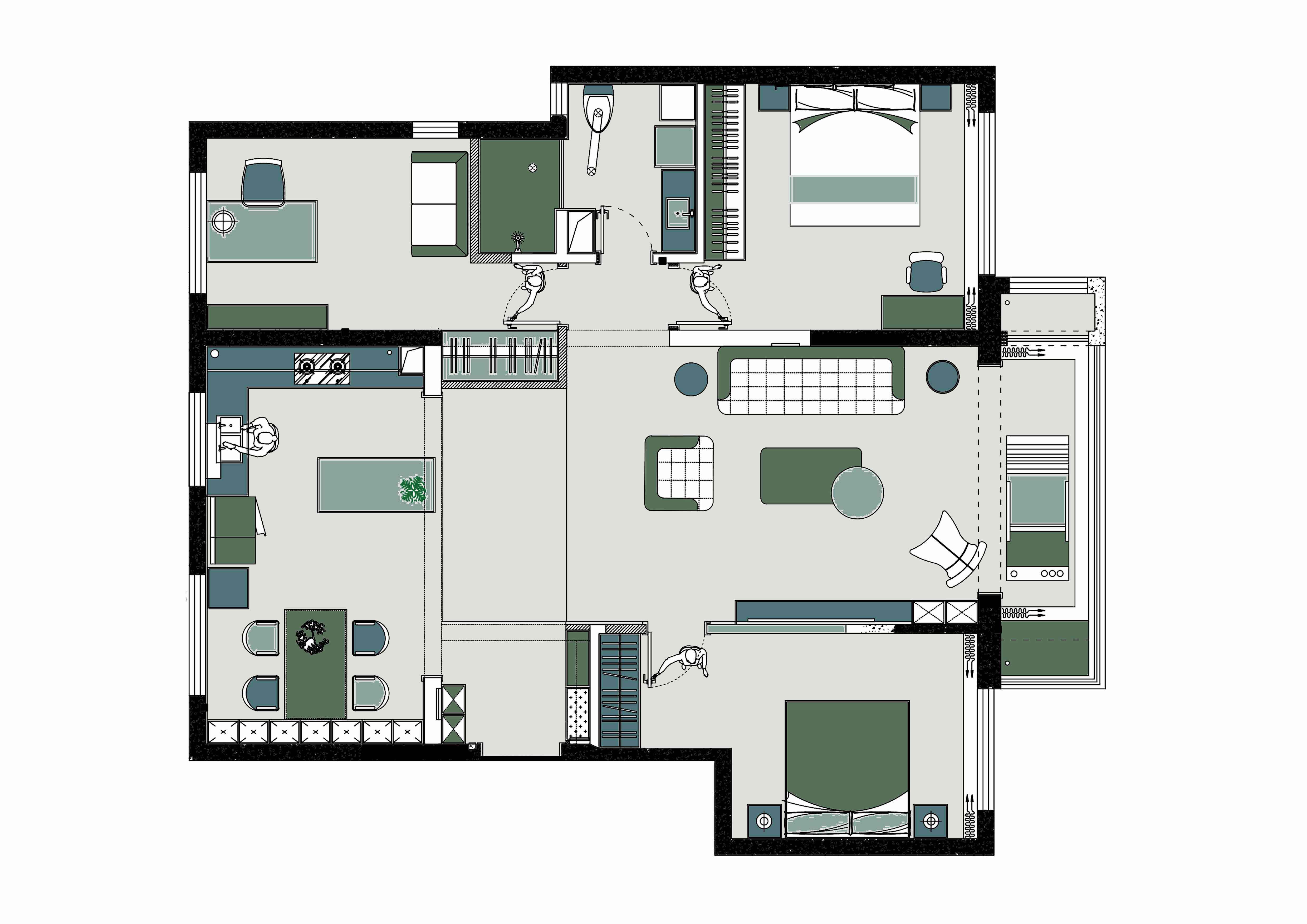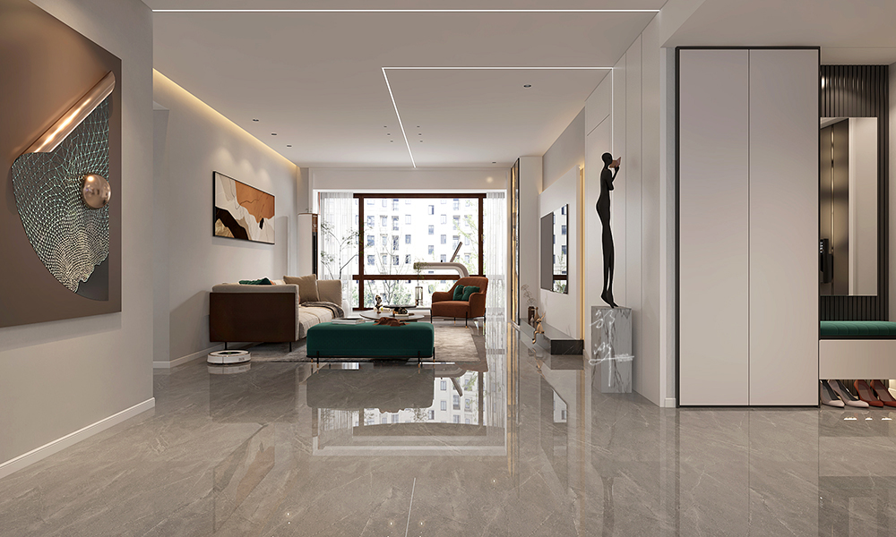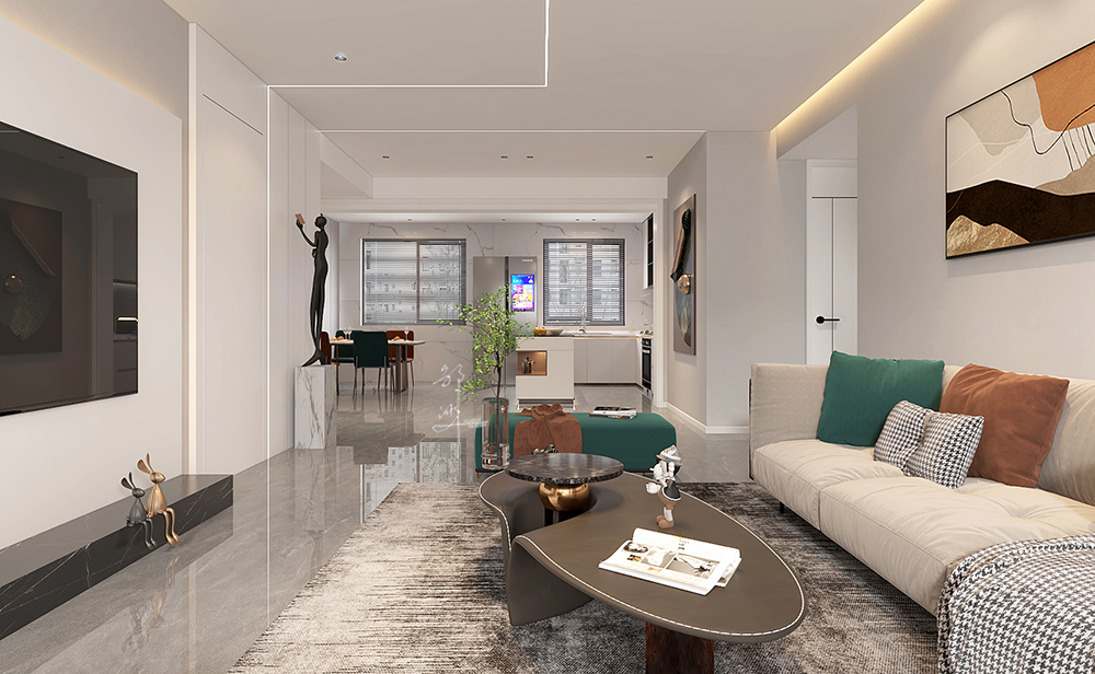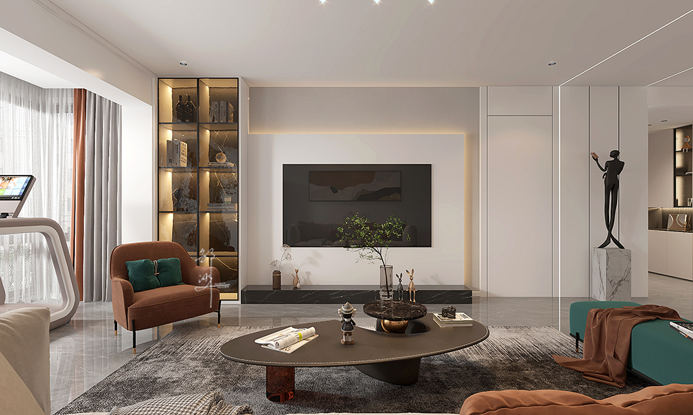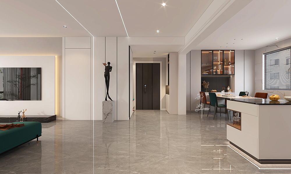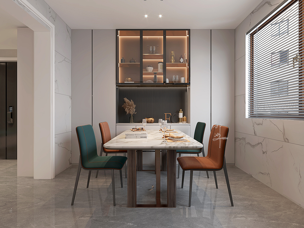 本方案采用现代简约风格,以白色作为主色调,空间更加通透明亮,软装装饰点缀一些棕色、蓝绿色,显得空间大气、沉稳,并且跳色的餐椅打破了纯白色的安静,凸显出空间内的活跃和大气。有刚有柔、有曲有直,各种线条和几何形体点缀,使空间没有那么死板,多了一分活跃。