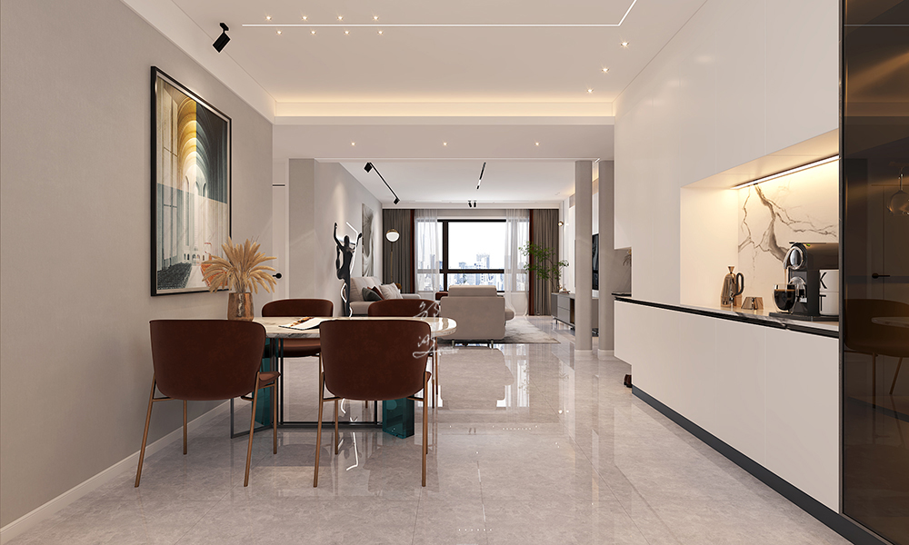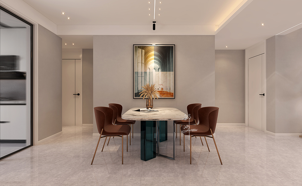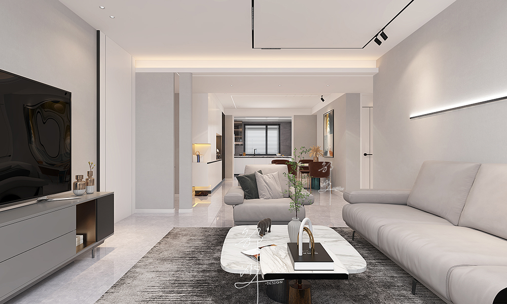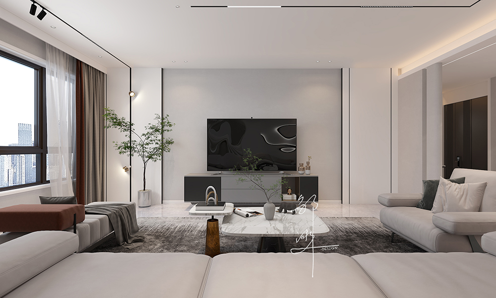 本方案采用现代风格,大体上以灰白为主,简约而不简单。整体灰白色调,软装上多谢颜色点缀,注重家具摆设,美观时尚,受很多人的欢迎。整个屋子搭配优雅又轻快,不死板,红色椅子和金属架子点缀整个空间,使得该空间素净优雅。设计中所用线条以及摆件配饰中的几何线条,使得空间看起来简洁明快,对比鲜明。