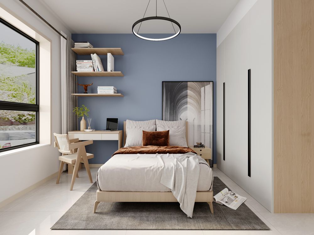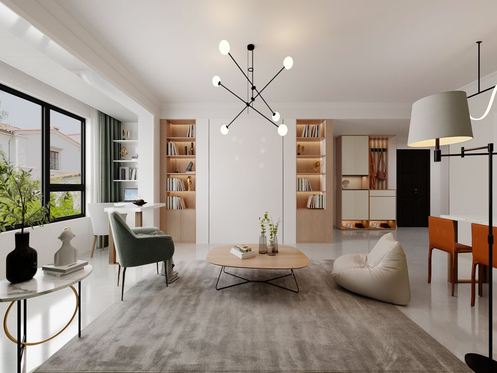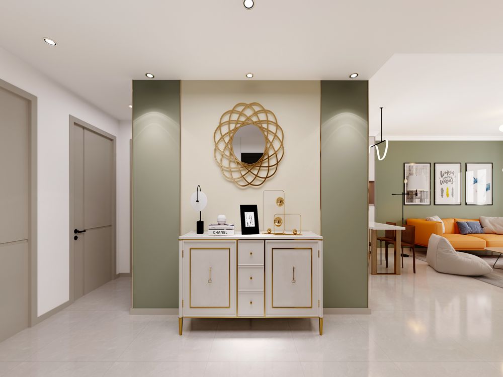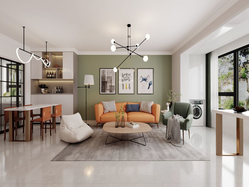 此案属于现代北欧风格,北欧风格注重人与自然的有机结合,绿色的墙漆使整个空间充满灵动,亮色家具点亮整个空间。