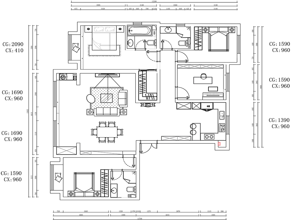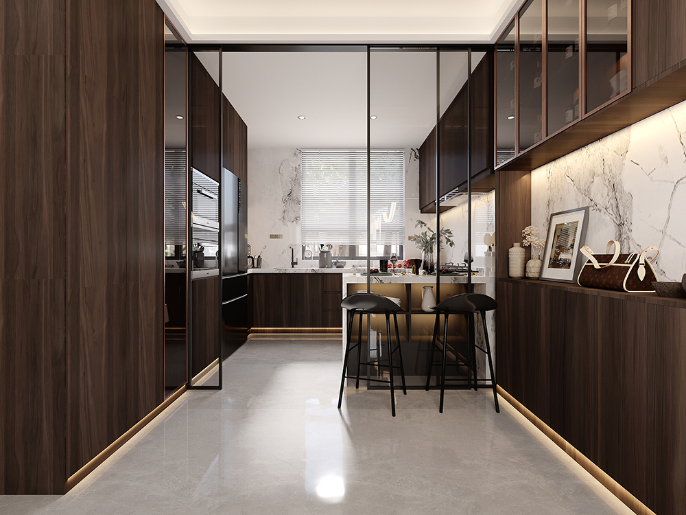 石家庄业之峰装饰远洋晟庭190平米现代风格装修设计,应业主要求,在沟通中了解到,业主喜欢现代风格,新颖一点的设计。后期软装过程中,团队选用了大量金属色的配饰,通过明亮的金属色系与深色系的木制家居,来形成高对比度的色彩空间,让人眼前一亮。