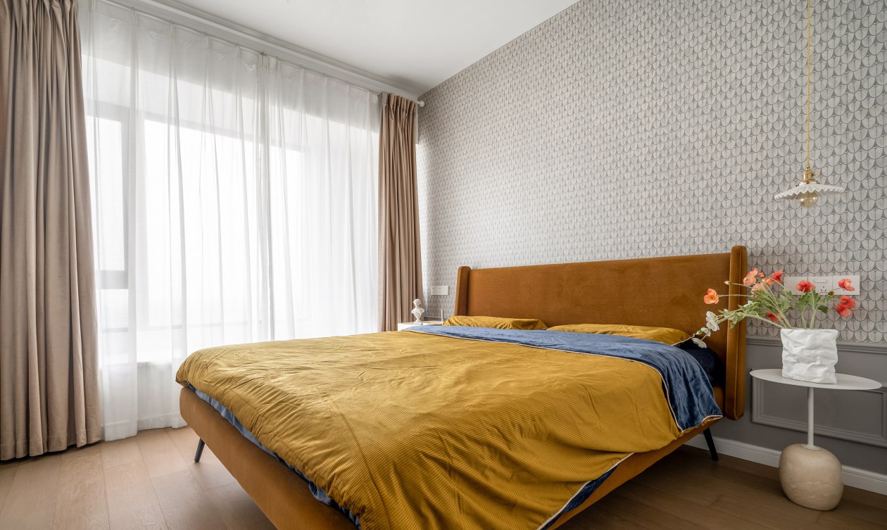 3:主卧以姜黄成就业主的典雅气质素雅的墙布与石膏线护墙碰撞,不对称的床头置物布局充分展现业主内心的个性与不羁,也催生一场又一场甜甜的梦