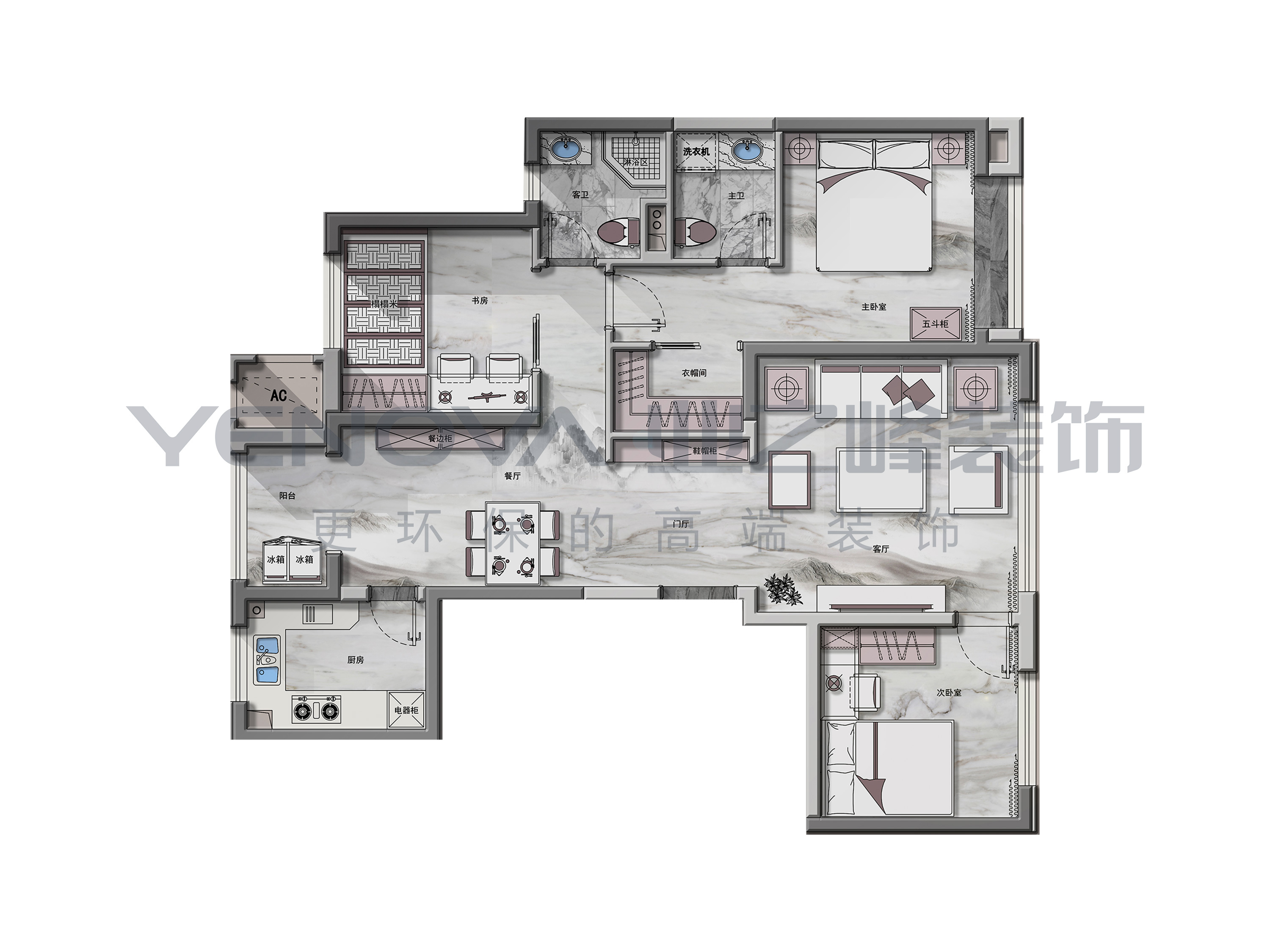 把传统的结构形式通过重新设计组合以另一种民族特色的标志符号出现,表达对清雅含蓄,端庄风华的东方精神界的追求 又不失家的温馨, 室内多采用对称式的布局方式,格调高雅,造型朴素优美,色彩浓厚而成熟。中国传统室内陈设包括字画、匾幅、盘景、古玩、木格栅、博古架等,追求一种修身养性的生活境界。