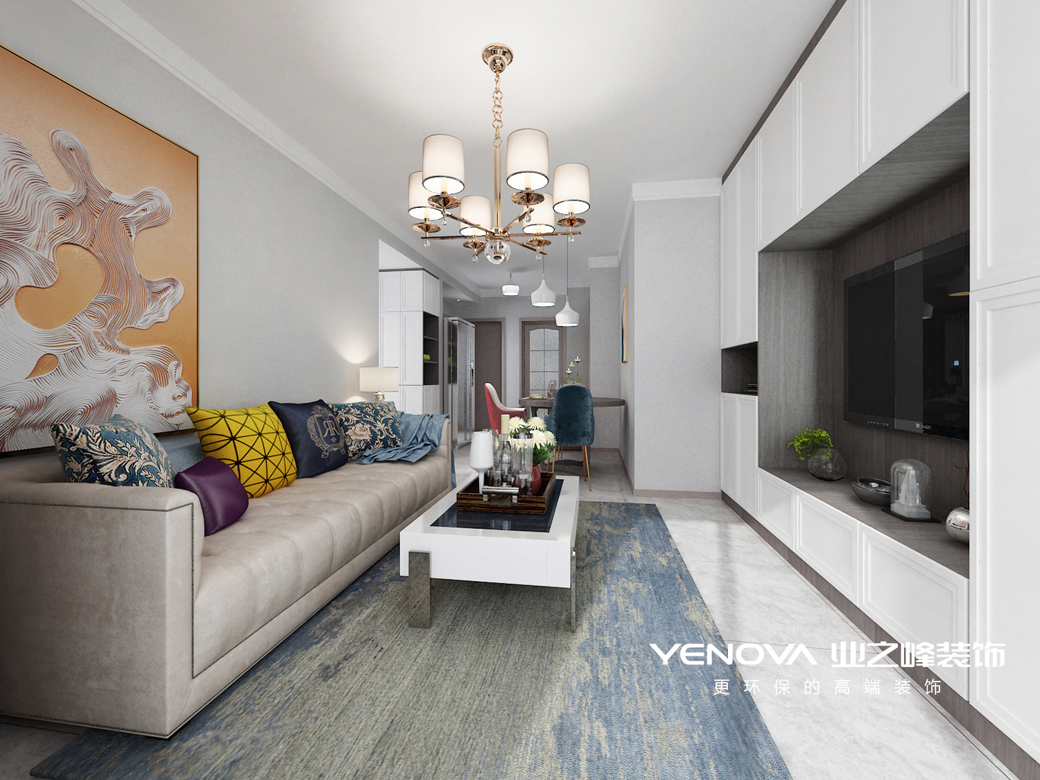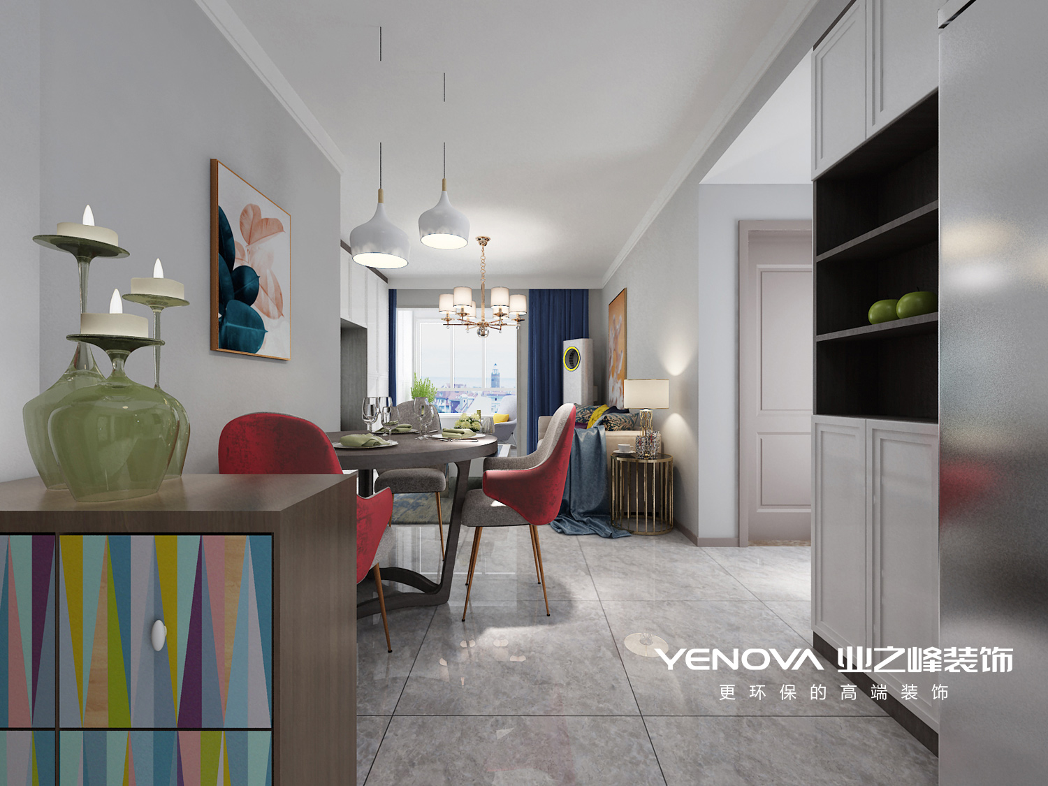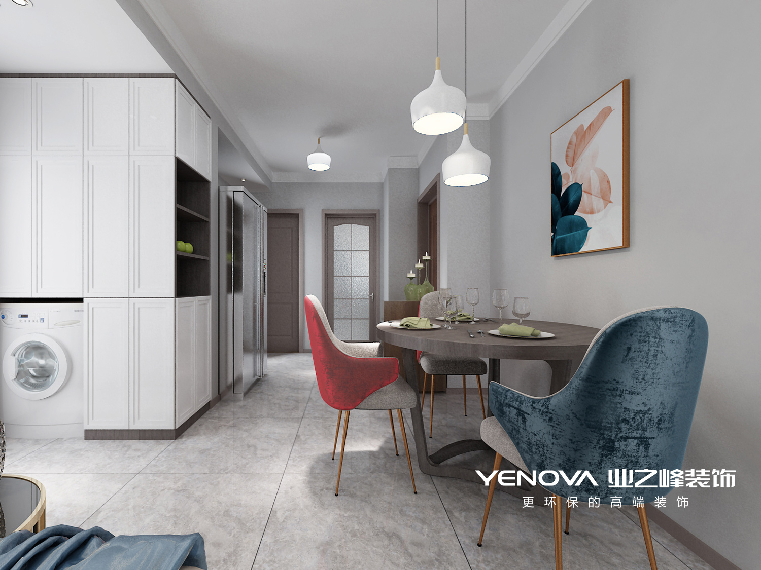 客厅区电视墙定制柜体的运用,满足后期多变的储物需求,地面整体采用瓷砖,利用瓷砖光面的反射,增加整间居室的亮度明度,厨卫主要以功能性为主,满足基本日常使用的情况下,用色彩表达对生活的憧憬和向往。