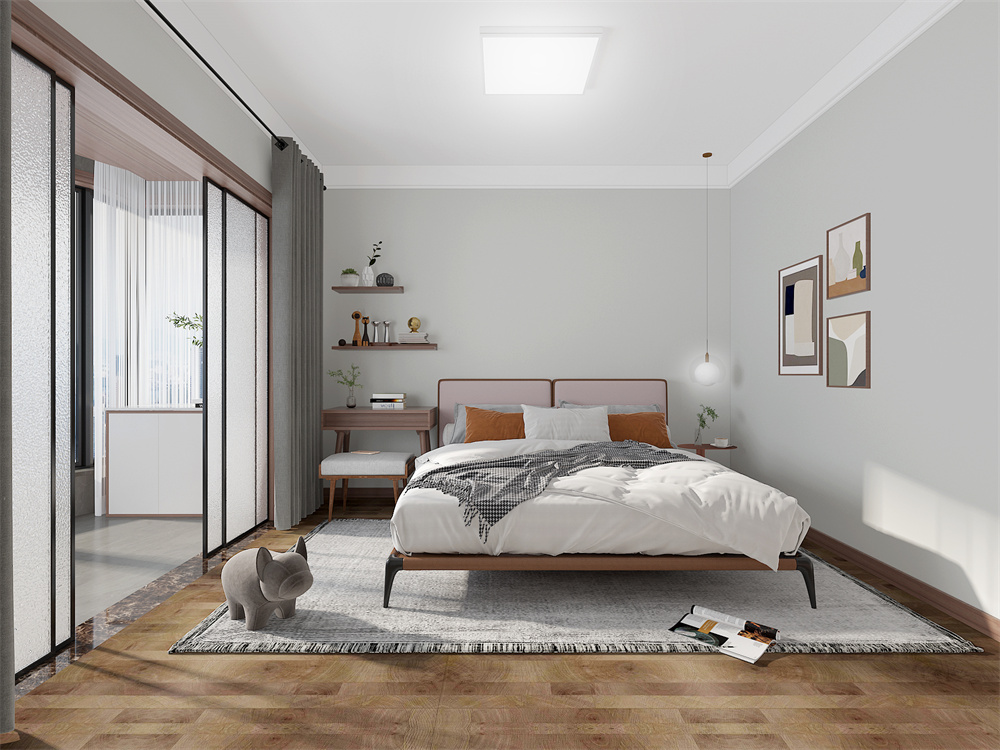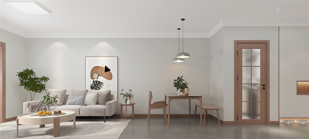 木材是室内装修的灵魂,富有设计感的固装柜在优化储物空间的同时作为材质过渡的桥梁,将内门和垭口的木色与墙面的纯色嫁接调和;通过电视柜的镂空处理让电视柜兼具实用的同时更加灵动;入户柜和过道柜统一做分体设计,地柜悬空处理添加灯带,以解决门厅空间和过道空间采光弱的问题。