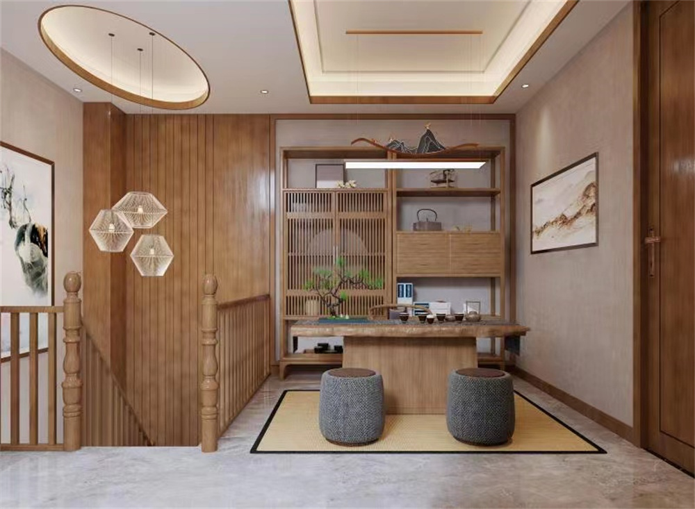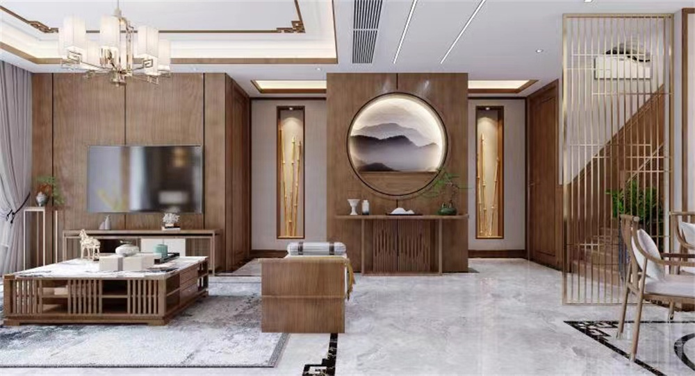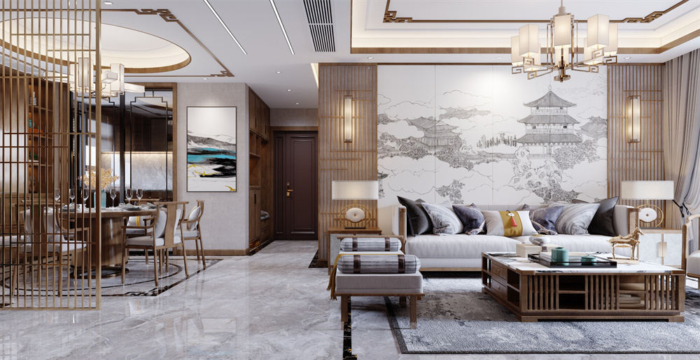 中国传统居室非常讲究空间的层次,金属的隔断、对称的壁龛和入户的照壁增加空间层次感和韵律感的同时将中式内蕴的优雅,庄严表达的恰到好处。
