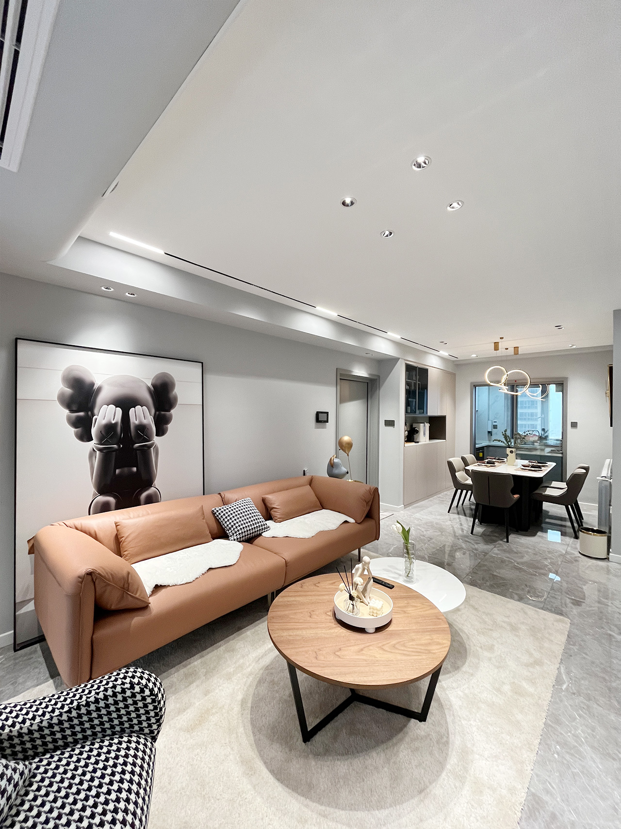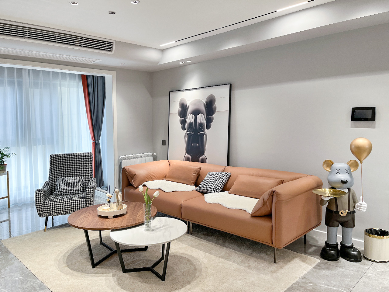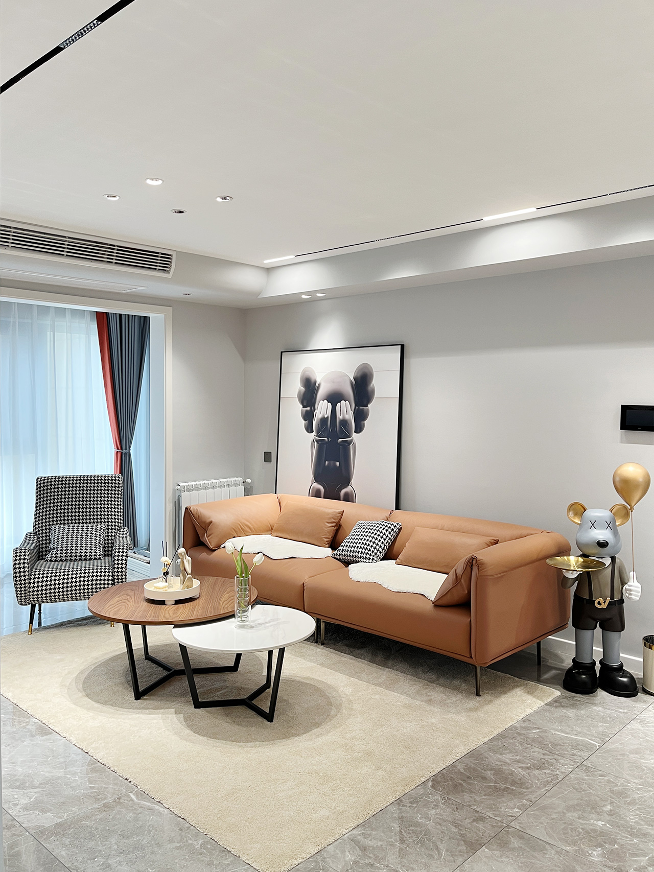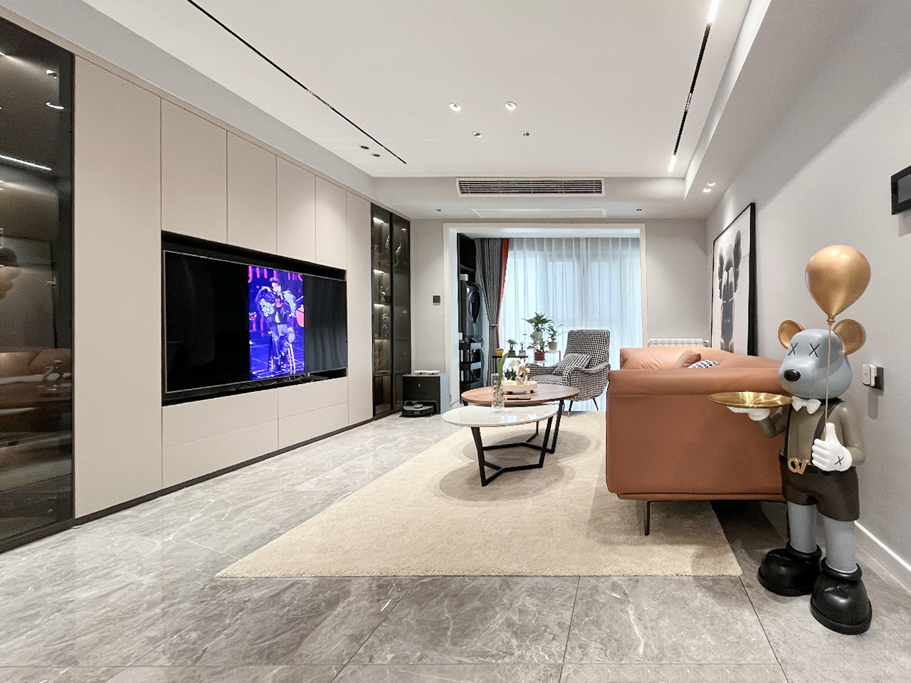 生活的理想是为了理想的生活!本案整体硬装走向是现代极简风格,全房黑白灰为主调点缀亮眼的橙色系,活泼而又干净利落。爱马仕橙色系沙发+组合茶几色调跟随空间主色调搭配,和谐统一!