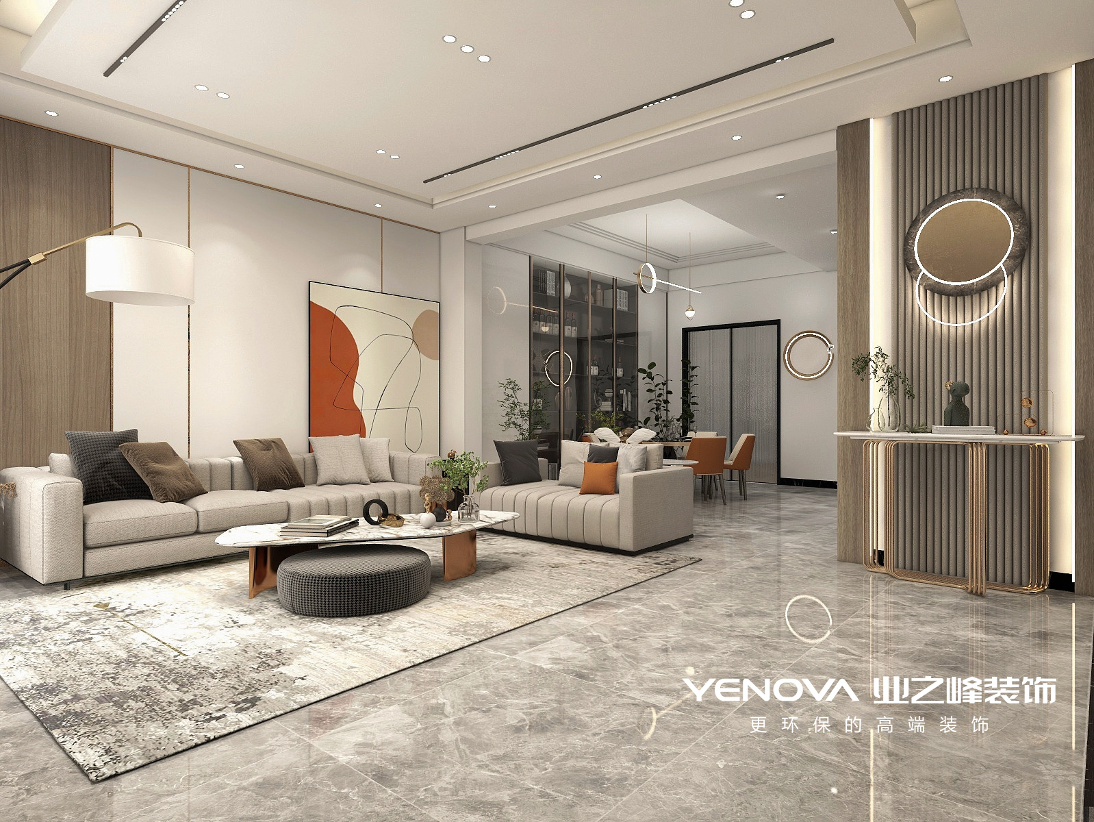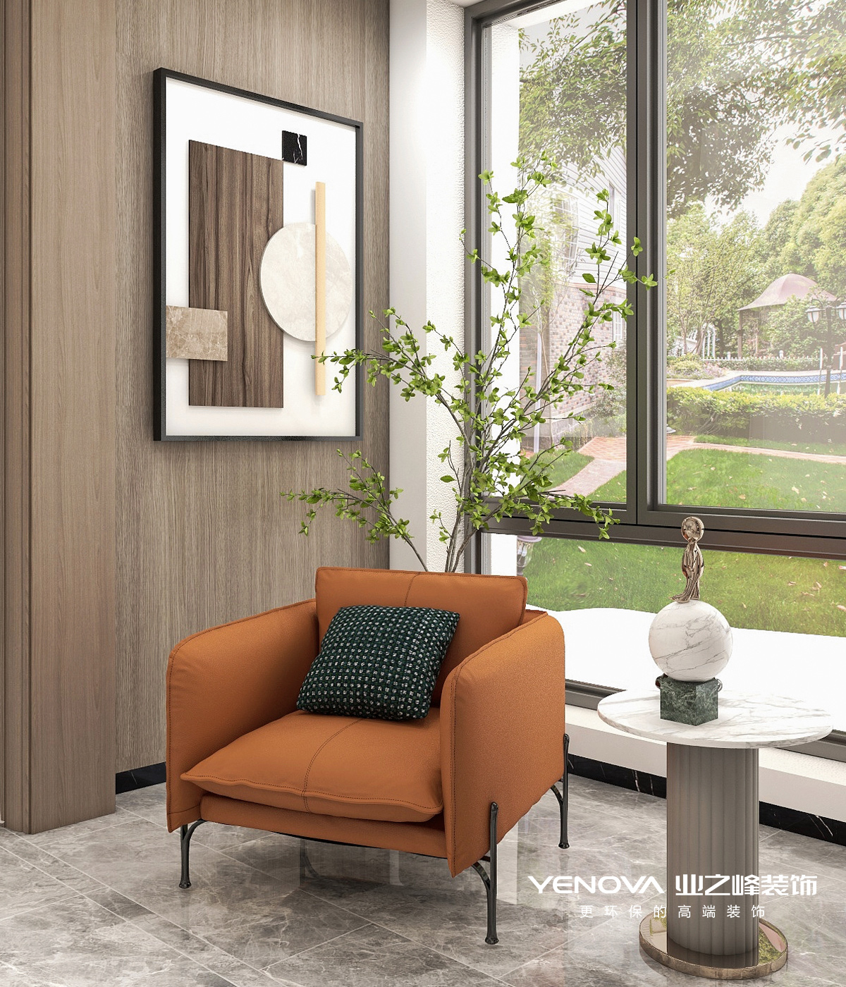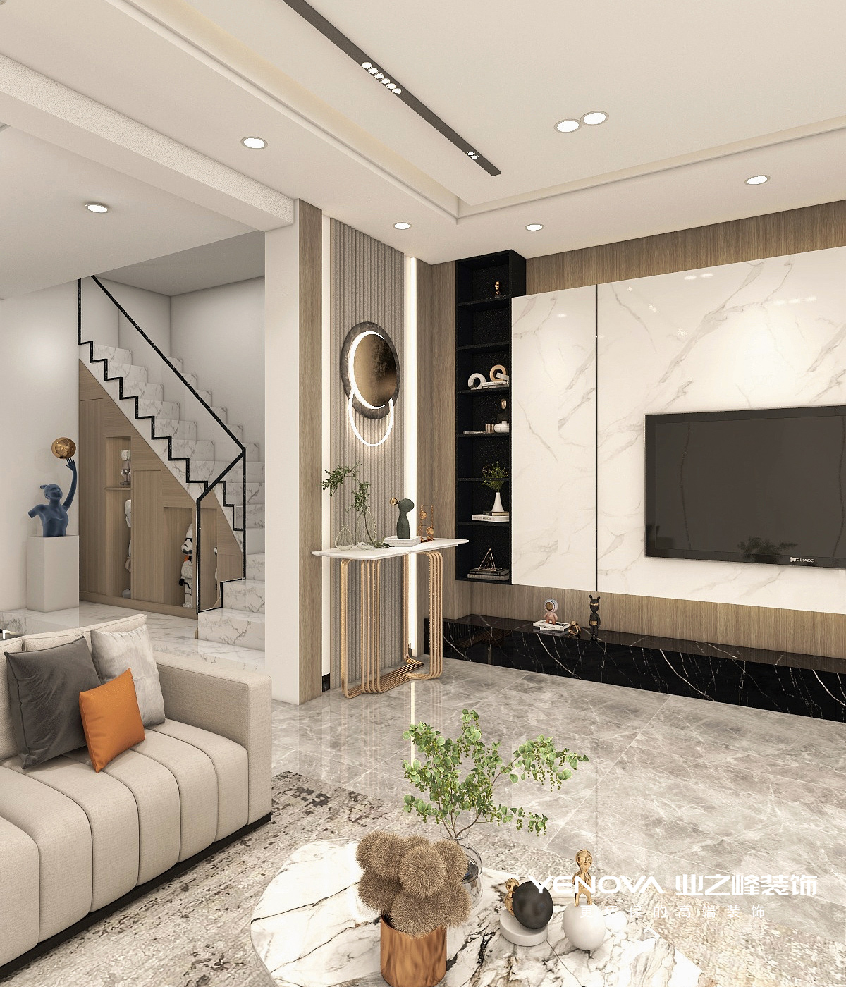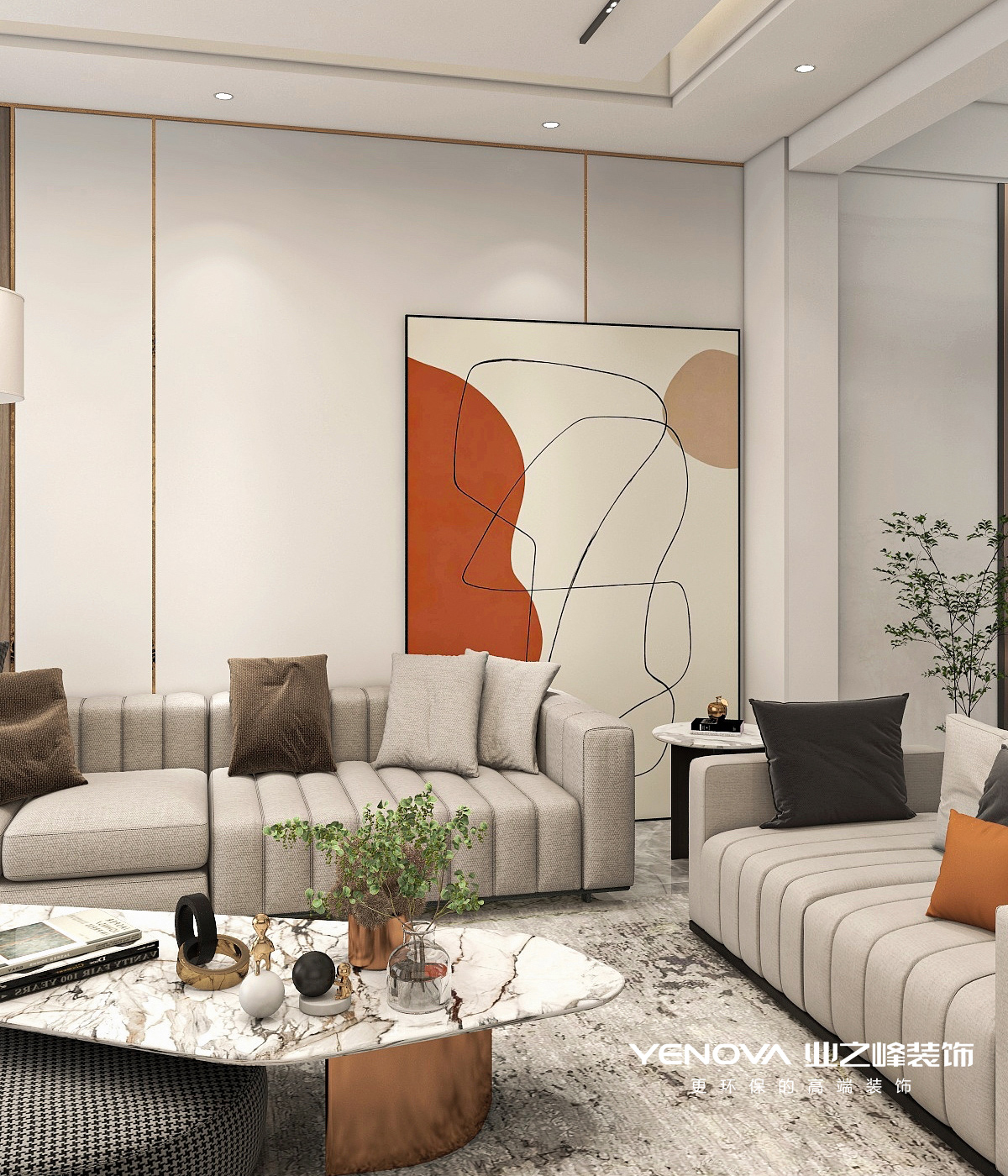 本案的色彩搭配是家居空间的基调,轻奢氛围的体现,需要合理搭配色彩,才能展现出丰富的魅力。驼色、象牙白、奶咖、碳灰、黑色等都是轻奢风格中常用的色彩,可以营造出空间的高雅调性,质感更为饱满、时尚。化繁为简,是轻奢风格的另一大特色。在空间布局上,轻奢风格强调留白处理,简约而有考究的布局强化了美观和实用性,不再拘泥于复杂的造型和繁复的雕花凸显精致和轻奢,令空间简约而不简单。所谓轻奢,并不是一味追求质感而忽视生活的舒适度,而是在有所取舍的基础上,利用设计手法营造出家的温馨。线条勾勒的空间,巧妙设计凸显艺术气息,家不仅高雅美观,还舒适温馨。现代轻奢风格的家居空间中,饰品的选择也是非常有考究的。灯饰、摆件、挂饰等等多选择金属、玻璃等材质的,强调质感的体现,视觉呈现上更加高级。