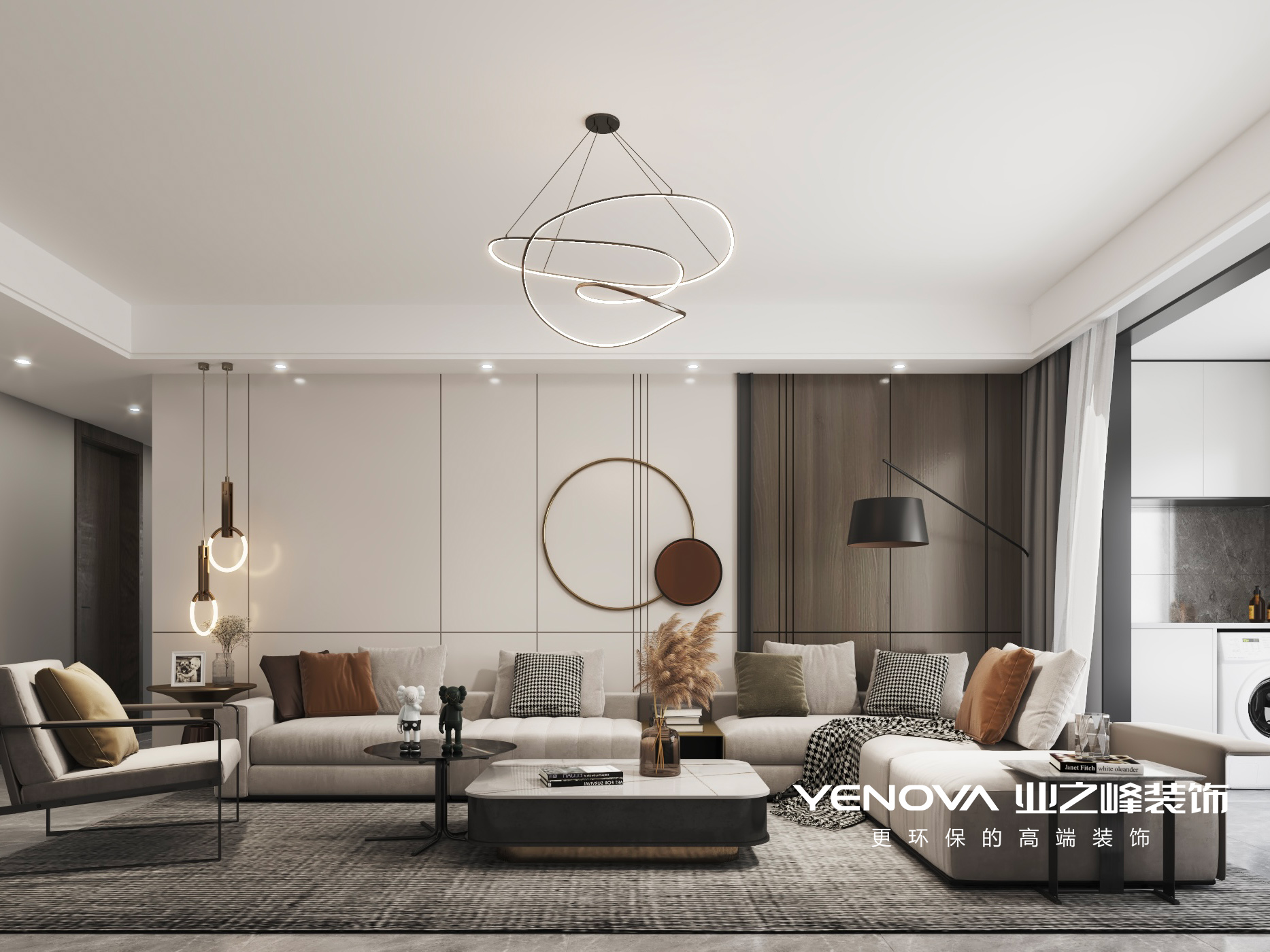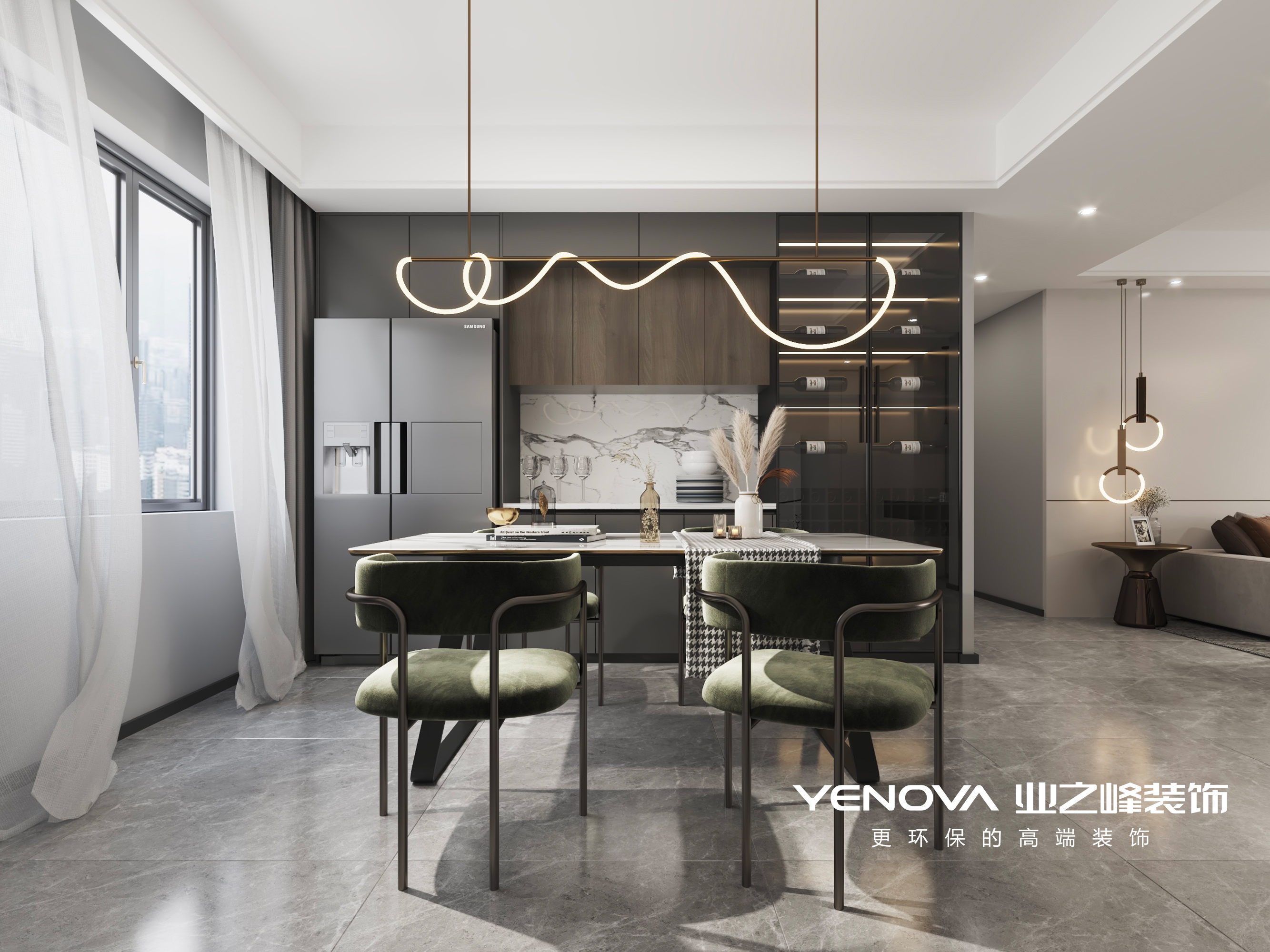 根据客户需求,本案是围绕现代风格为主题,现代简约中带着时尚和温馨。本案客餐厅采用灰色地砖,搭配深灰色定制整体储物柜,将冰箱从厨房拿移出,放置西厨的位置,动线明确,又回应了灰色和木色搭配。展示柜并未全封闭,用玻璃格子,让空间在视觉上宽阔又具有功能性。客厅则搭配了白色家具,点缀些驼色软装。家具带有些金属材质,增加空间时尚感。