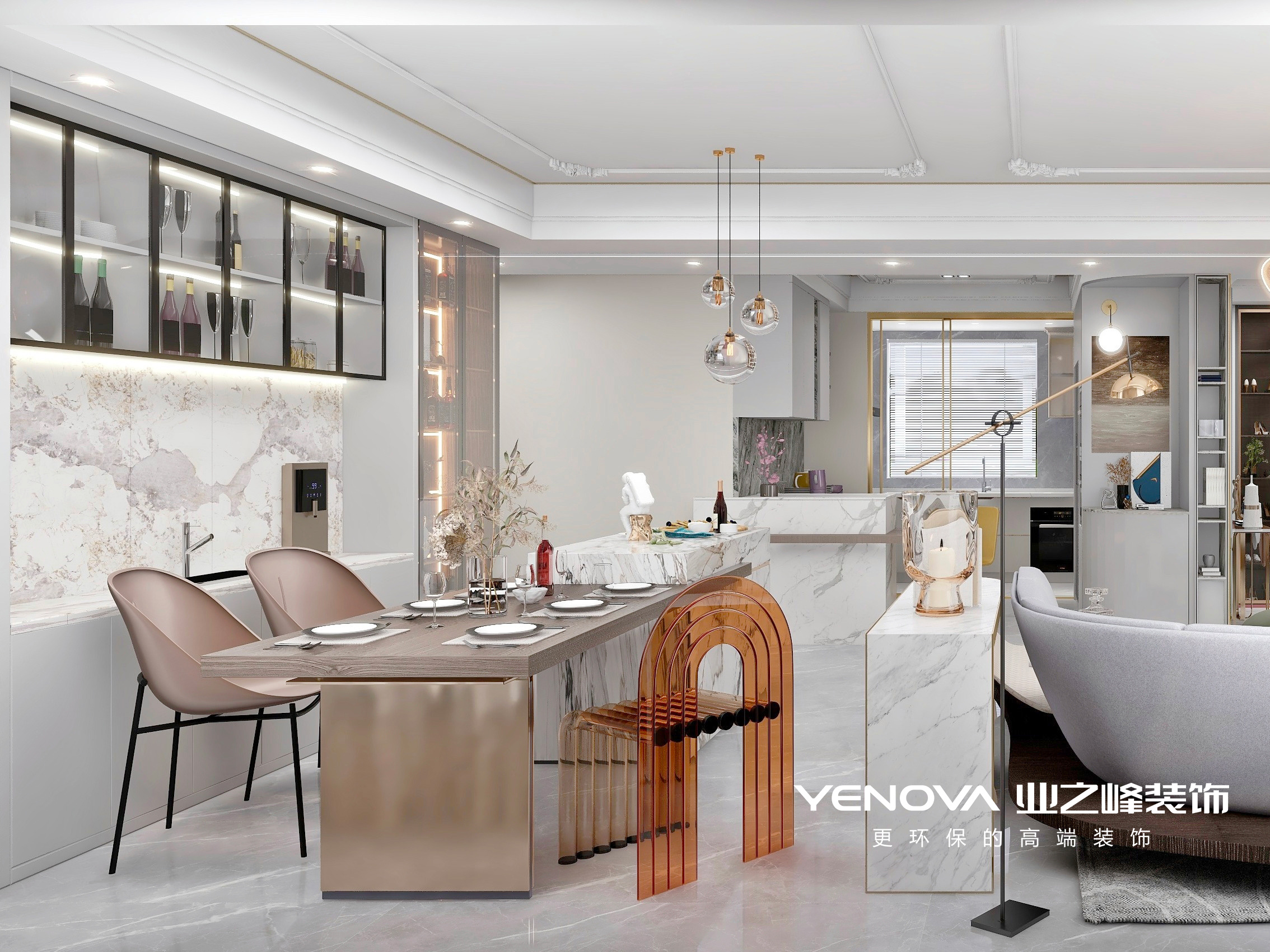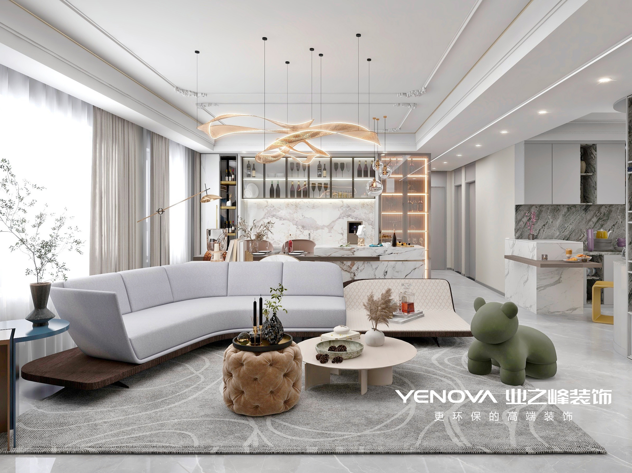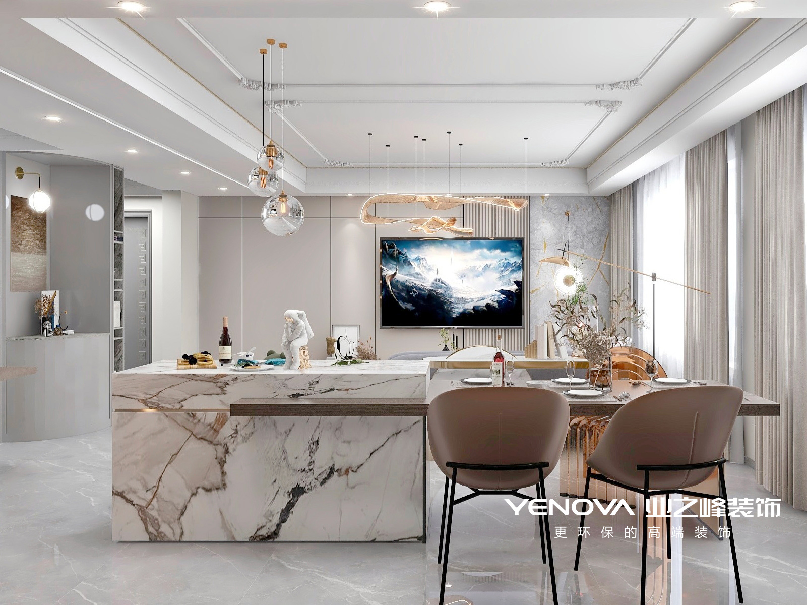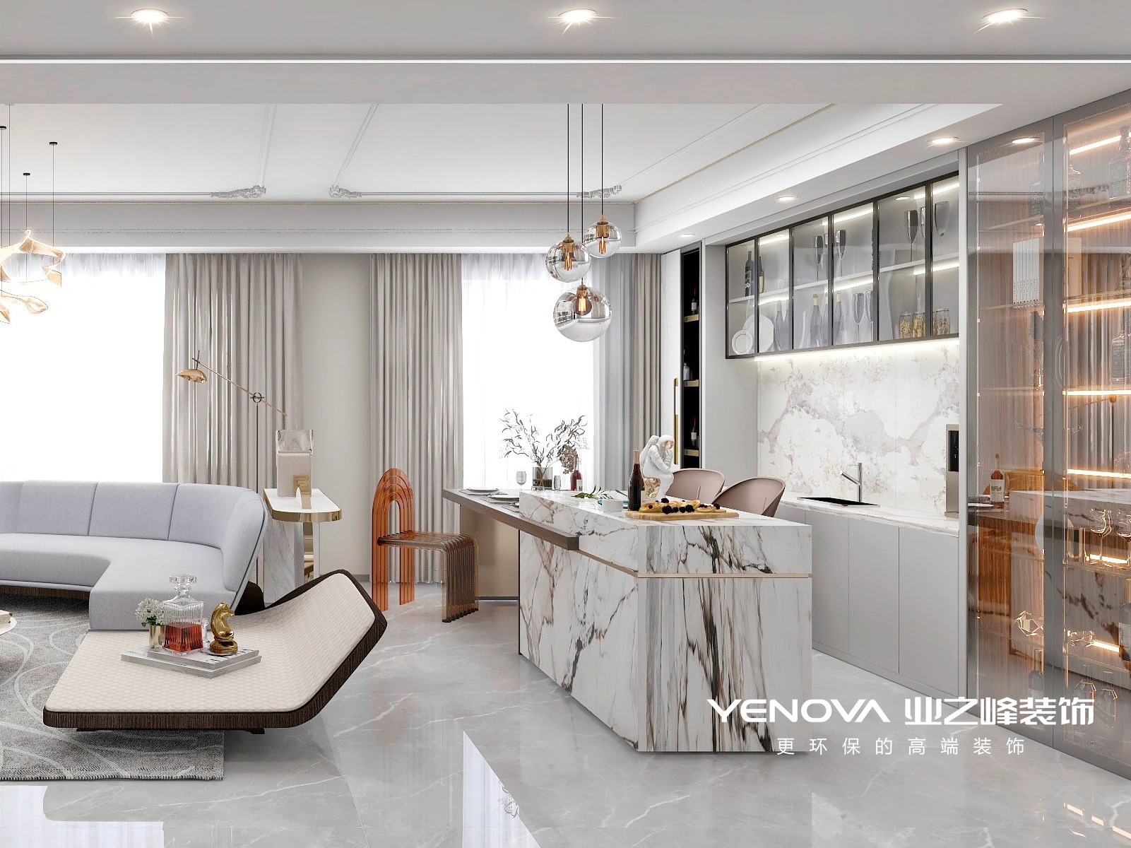 通过与业主交流,得知业主比较喜欢轻奢风格的感觉。业主不喜欢太过明亮的颜色,喜欢低调的色调,最好是纯净一点干净的颜色。所以我们会在装饰以及选材的材质上透露出干净又不失轻奢。主要通过色彩和配饰上的搭配来展现轻奢。客厅运用米白色为主色调和一些金属线条的点缀,体现出了精致,低调和内敛的气质。客厅吊顶中采用细小的雕花,轻奢中又带一丝细腻之感,西厨与中厨的结合,以及吧台的运用,让整体画面感丰富,不再那么单调卧室运用米白色,浅灰色和象牙白色系,整体色调统一,木质的背景墙以及转角衣柜让人感觉舒适又安逸。吊灯和基础照明不需要过多的装饰,简约大气正体现了业主的需求。