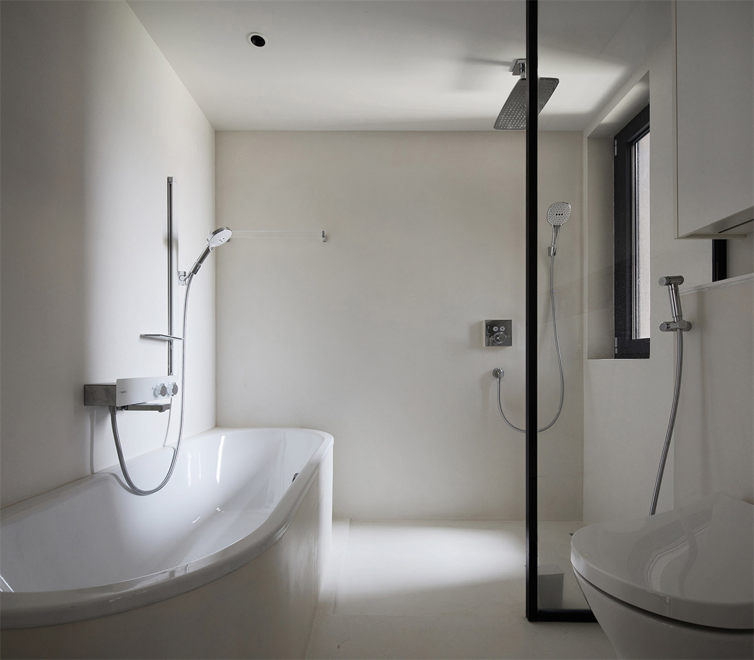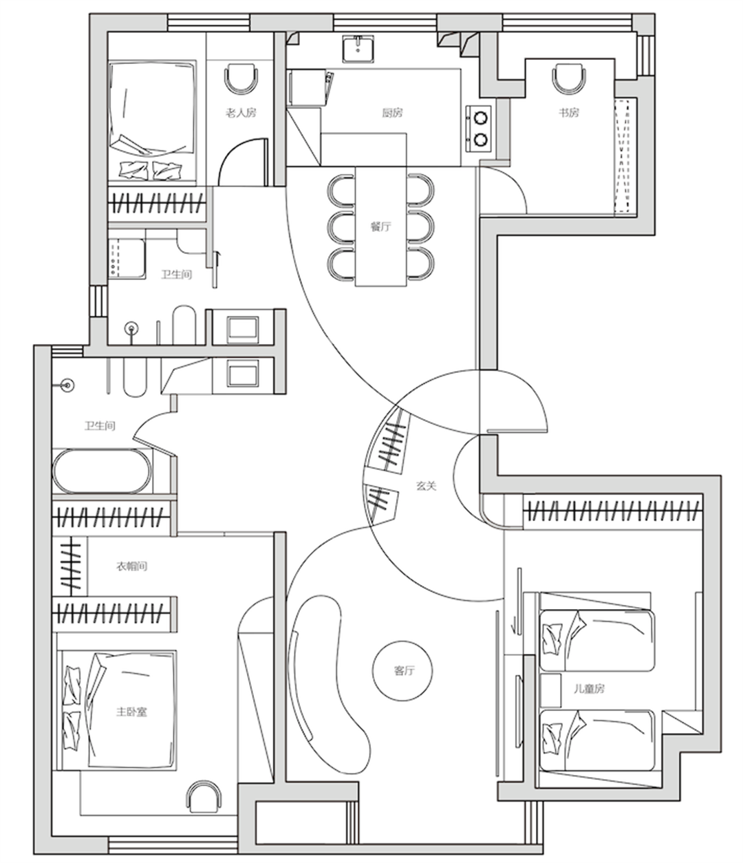 圆形自古以来都给予我们团圆美满的视觉联想,因此我们以圆形为基本型置入空间中,将其切分构建出大中小三个体块,彼此之间相互排斥却又相互融合与构建,在空间中建立某种特殊的次序将其组织与串联。“法则并非源于自然而是人类心灵的建构”,亲密关系的形成与关键纽带的存在密不可分,此方案的空间构成理念同样遵循情感逻辑走向。由北至南指向老中幼三代各自活动区域,以弧线引导相应动线的同时,构成客餐厅结构界线。我们试图于空间中心位置构建三代共居的情感桥梁,弧形轮廓中的切口设计,作为一家六口情感沟通的概念载体,由此产生的切口实现内外场景交互,成为共生相融家庭关系的结构表达。