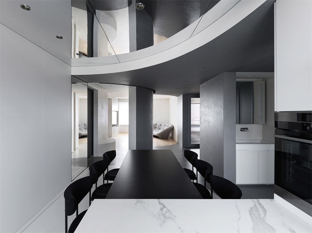 白色地面对应弧形吊顶形成开放式餐厨区域,浅色系运用呈现明亮跳跃的空间氛围。岛台加强厨房与餐区互动的流畅度,操作台面增加,烹饪与用餐场景融为一体。选用深灰色的餐桌座椅与周边灰色区域形成呼应,岛台式设计解决一家六口用餐需求。顶部与墙体的镜面材质拉伸视觉空间,弧线得以闭合。