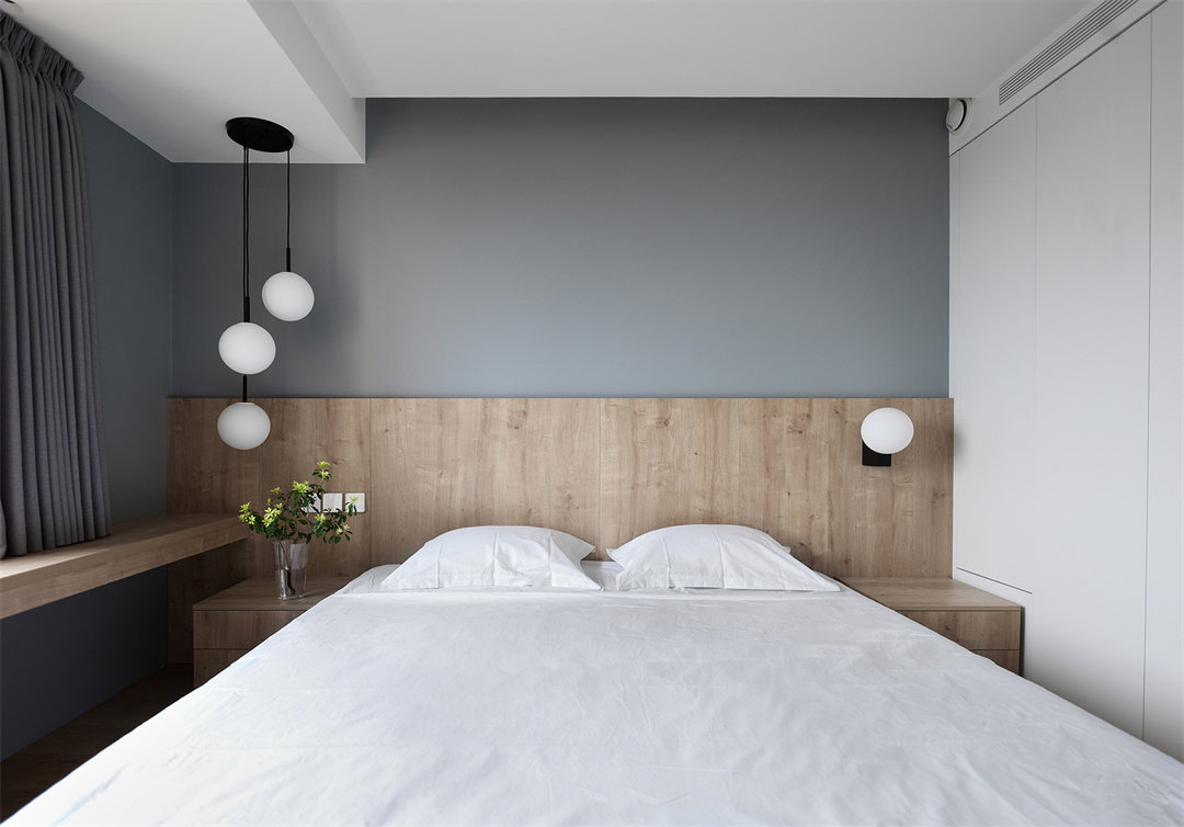 私密空间同样沿用木质元素,靠窗延伸出平台以提供梳妆、阅读功能,最大限度引入自然光线。步入式衣帽间承载收纳功能,柜体内部暗藏灯带提升使用便捷性。不规则球形吊灯是空间灵动的存在,暖光给予屋内温馨安静的质感。
