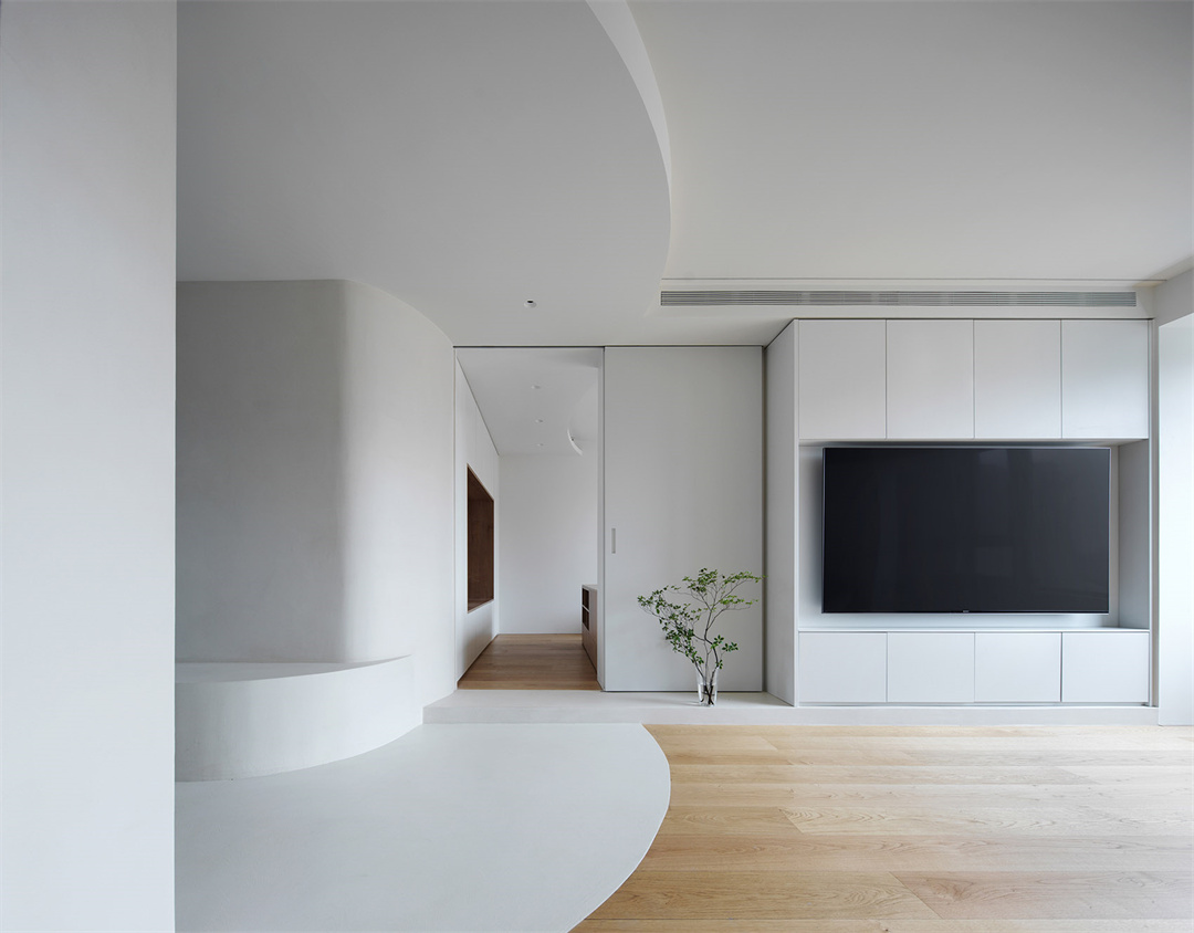 南侧客厅置入异型沙发,打破方正空间的秩序感,同时留出足够空旷场地以满足孩子们自由跑动的需要。客厅视角看向北侧,沉静私密的灰调空间与象征活力的白调区域形成对比。柜体电视墙提供储物功能,儿童房推拉门嵌入其中,门体闭合后窗框露出,视觉层次多样。