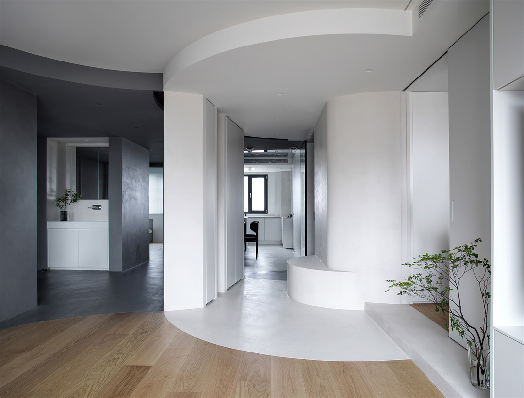 从玄关进入,可以完整看到整个空间的色彩形态构成,正对的圆弧柱体被设计为玄关柜,便于日常收纳。穿鞋凳由墙面延伸而出,延续弧形元素,是进入空间的过渡设置。镜面元素的运用打通视觉空间,反射作用下从任意视角均可看到重叠掩映的结构层次,是三代共居理念的具象表达。