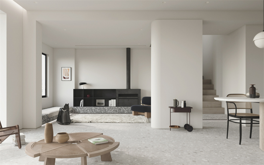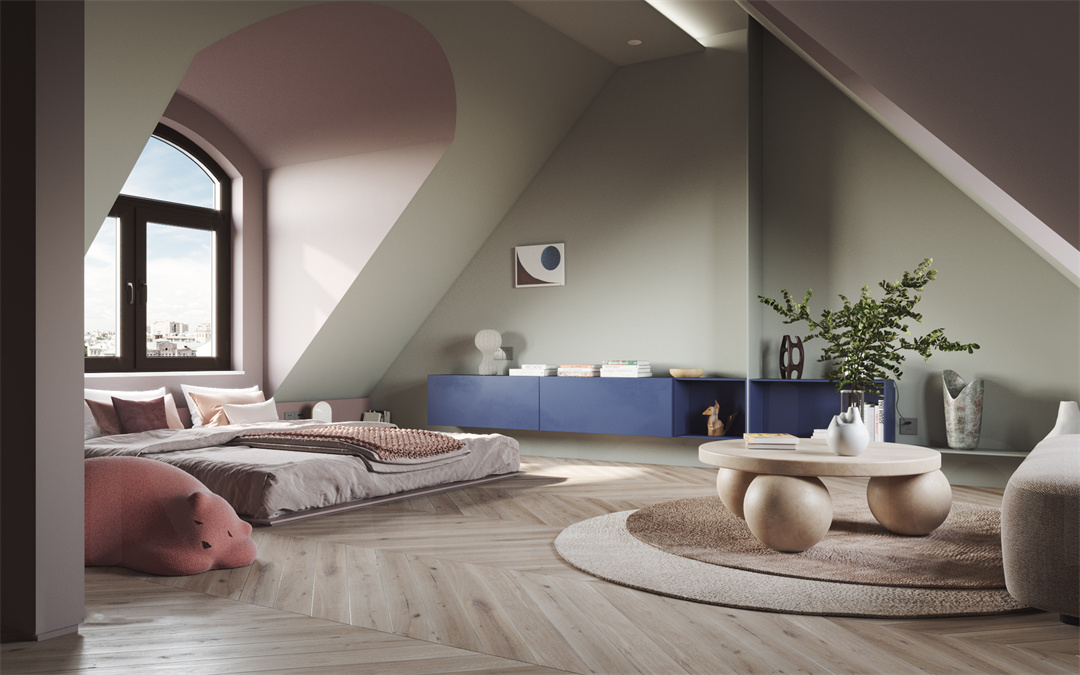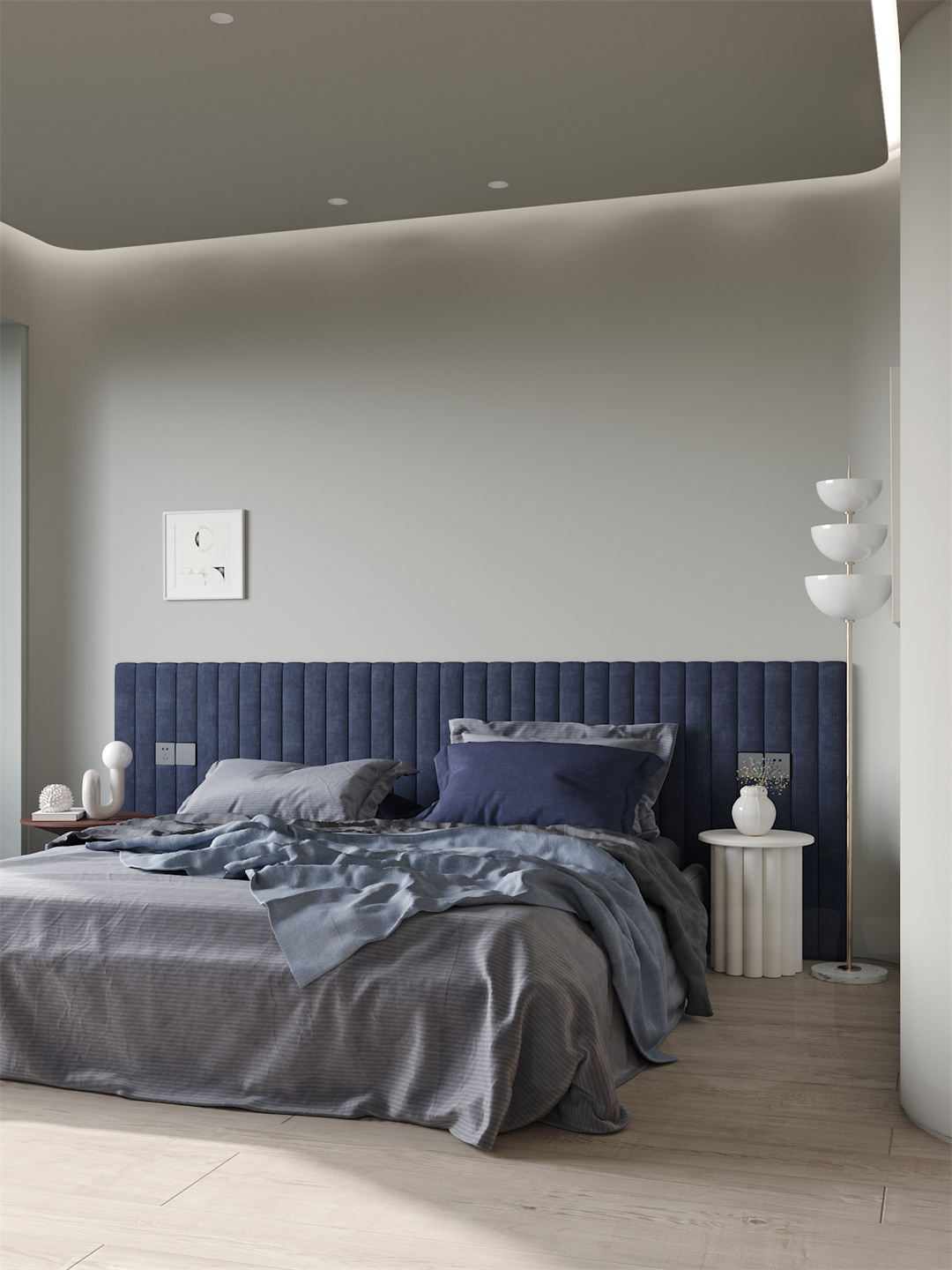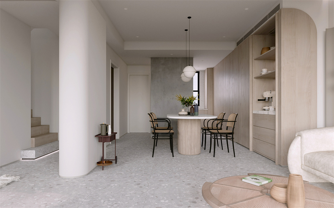 在“去风格化”的主流趋势下,我们避开软硬装营造的空间,而是斟酌结构之间的比例、层次、透视、感受,增进人与家的亲密关系。沙发后,用相对柔美的弧形结构处理了阳台的承重柱,视觉上扩大了客厅的空间,又契合了女主人的柔美与优雅;弧形的“卡其”用色又中和了一些男性空间的感受;原木色的家具定调家的亲切与质感,轻薄扶手的白色沙发和壁灯强化优雅。客厅与餐厅的联动。精心挑选的餐桌让整个空间既不单调亦不拥挤。餐厅。无论是色彩、功能性,餐桌、软装、球形吊灯都不失亲切与品质感,橱柜也别有洞天。整个空间相通相连,却不失神秘感和对空间的思考。副厅是让一家人精神愉悦的空间,在寒冷的冬日里围坐在壁炉旁或躺或坐,看书、休闲、交流,或许这才是生活中最美好难得的诠释,才是家的样子。卧室。灰色和经典蓝的结合让空间变得神秘、静谧;空间延续整体的弧形结构,产生直观的细腻感受;顶部圆角矩形状灯带增添整体层次感,同时足以在夜间温暖人的感官。书房迎合新时代下的新态度,脱离一成不变的古朴,成熟的色彩不会扰乱思考的过程,反而促进创意和思维乐趣的发生。阁楼在原结构的基础上发挥了最大的可能,保证结构层次感的同时也让两侧的自然光充分照射进房间;整体饱和度降低从而营造氤氲的氛围,无论是阳光和煦的下午还是华灯初上的夜晚,坐在沙发/床上阅读或者休息都能获得极佳的身心体验。