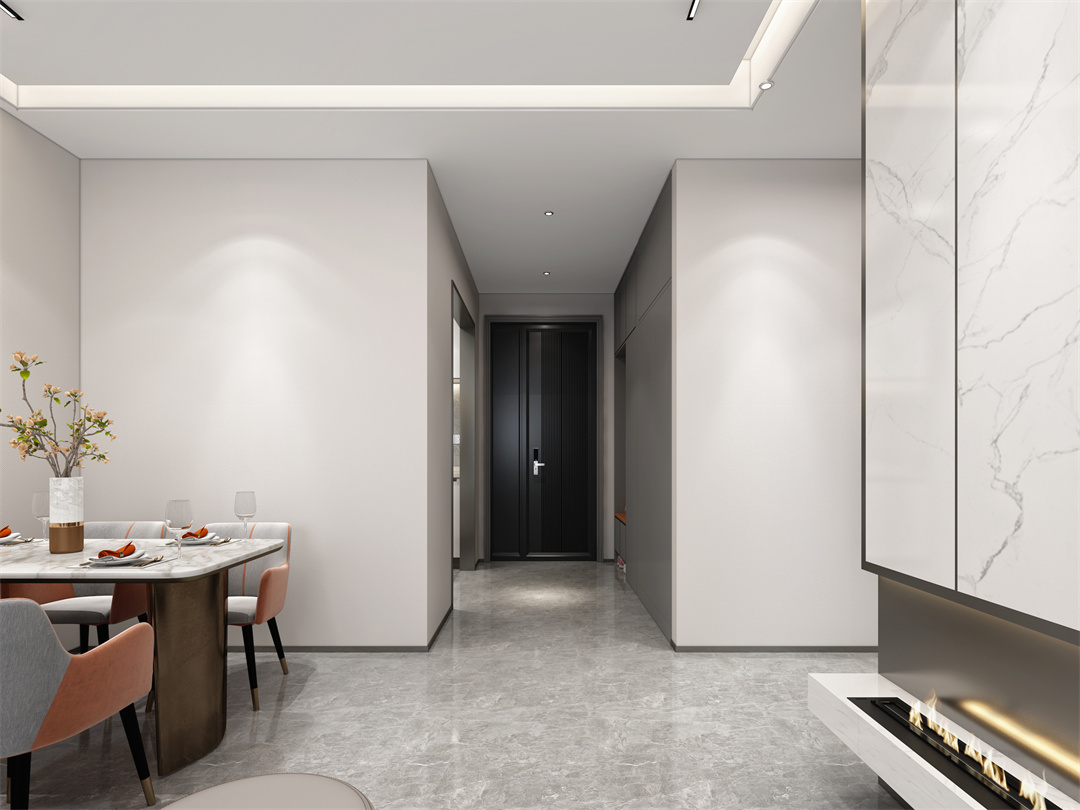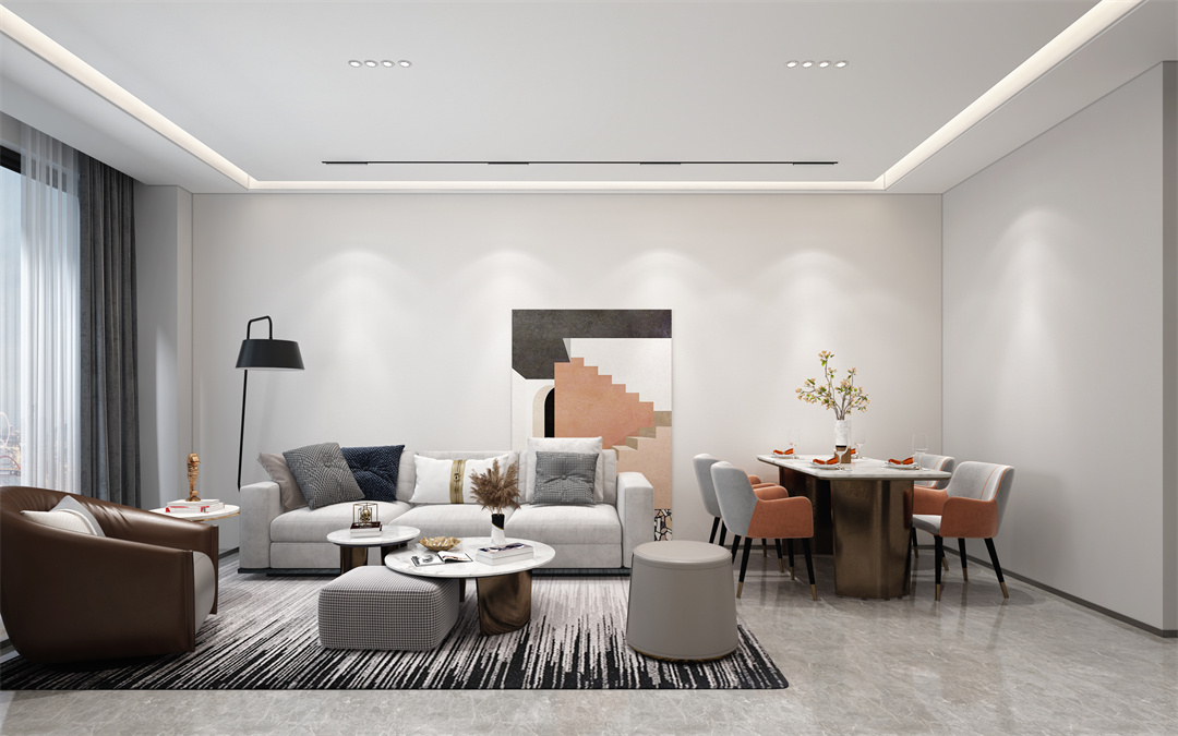 效果使用了黑白灰的主色调,以简洁的造型、完美的细节,营 造出时尚前卫的感觉。使用橙色椅子,挂画,在搭配一些绿色 植物为衬托,使居室充满惬意、轻松气氛。