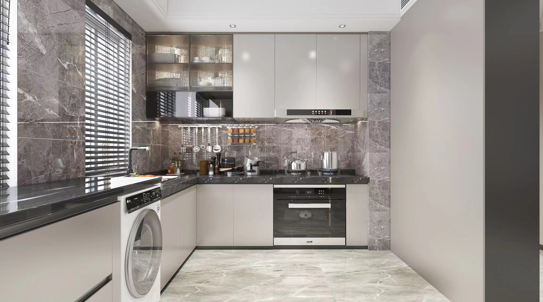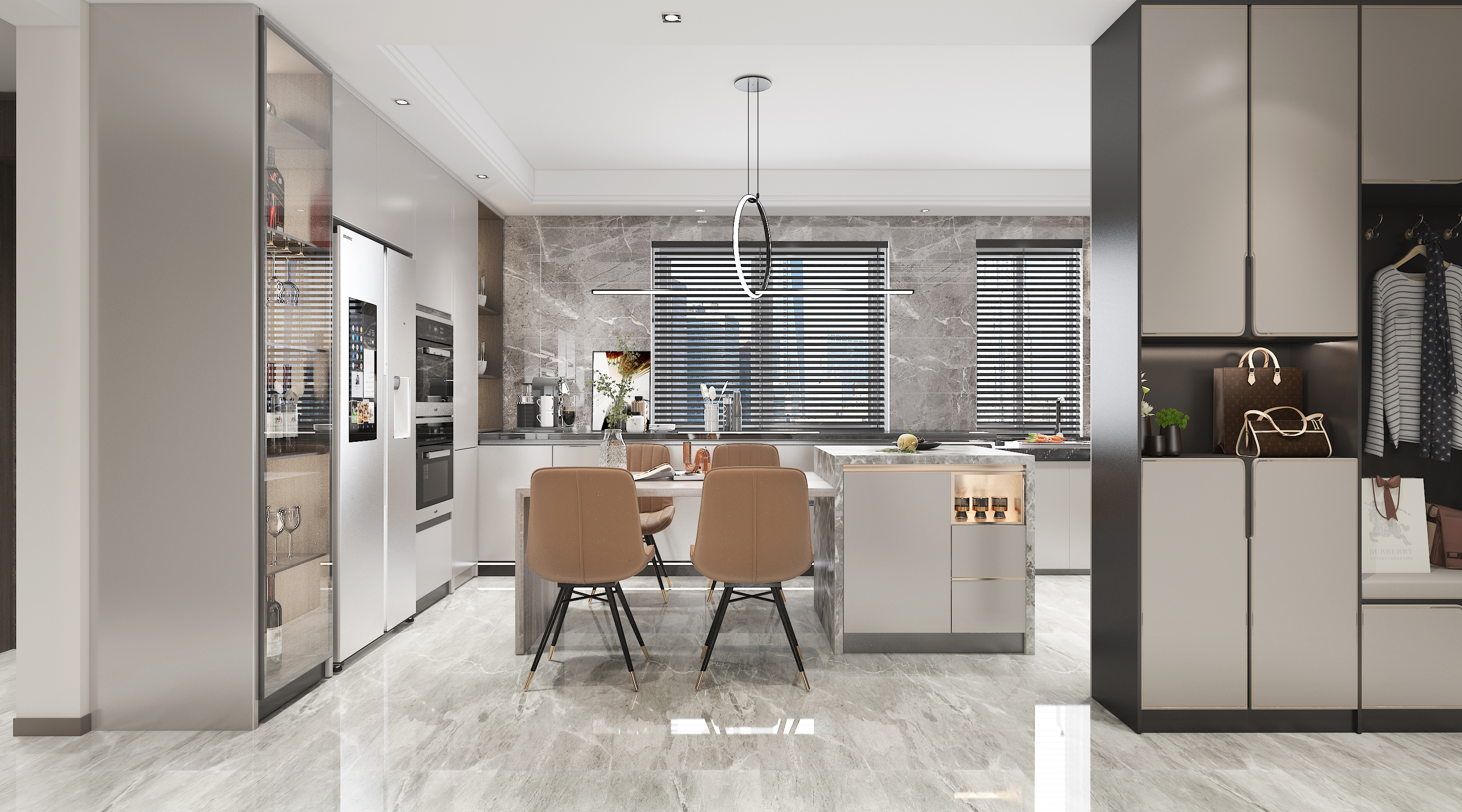 现代风格,采用开放式厨房,增加空间利用率,同时开放式厨房的砖用的纹路会深一些,给人一些硬朗的感觉,但同时客厅暖色调基础相结合包括卧室采用比较柔和女性点的颜色搭配。会使整个空间变得时尚感十足。
