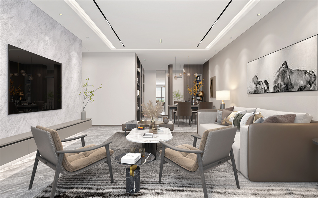 线条简单、装饰元素少,现代风格家具完美的软装配合,让空间 看上去非常简洁,大气,一个安静,祥和,用看上去明朗宽敞舒适 的家,来消除工作的疲惫,忘却都市的喧闹。
