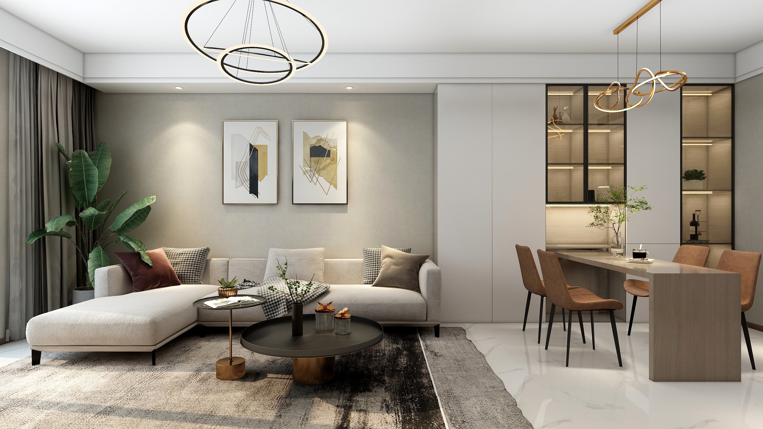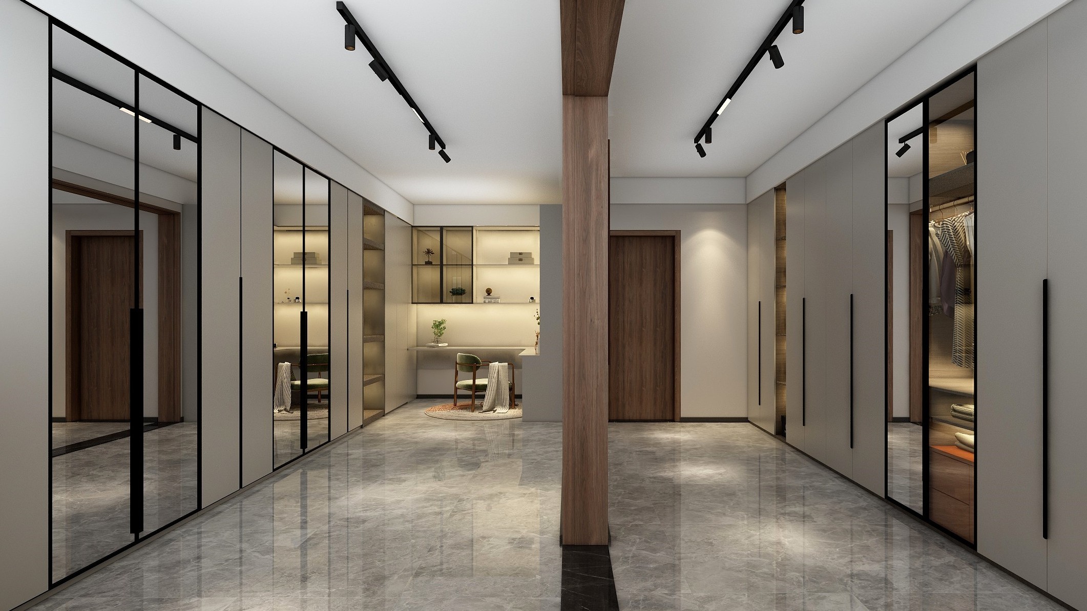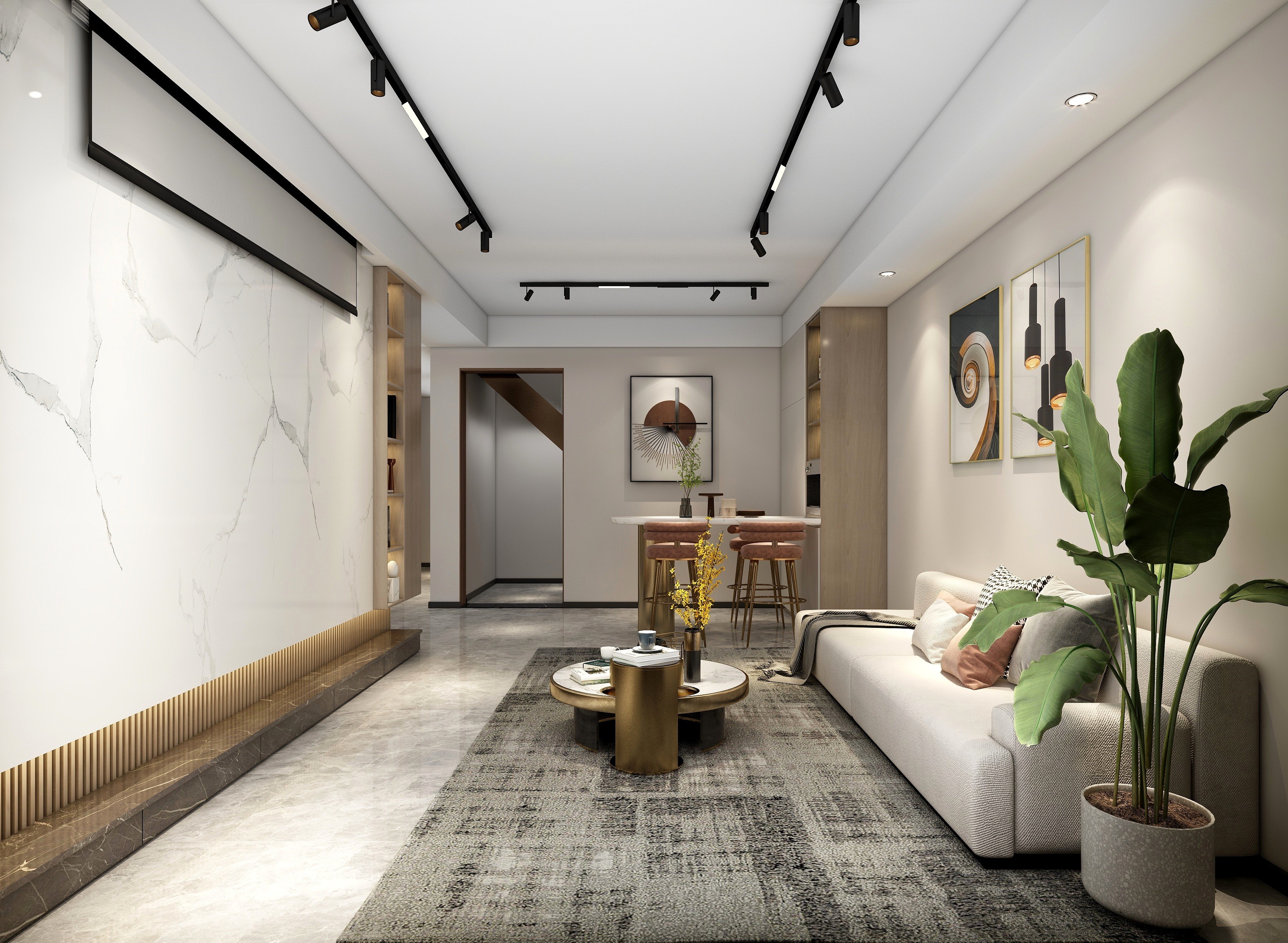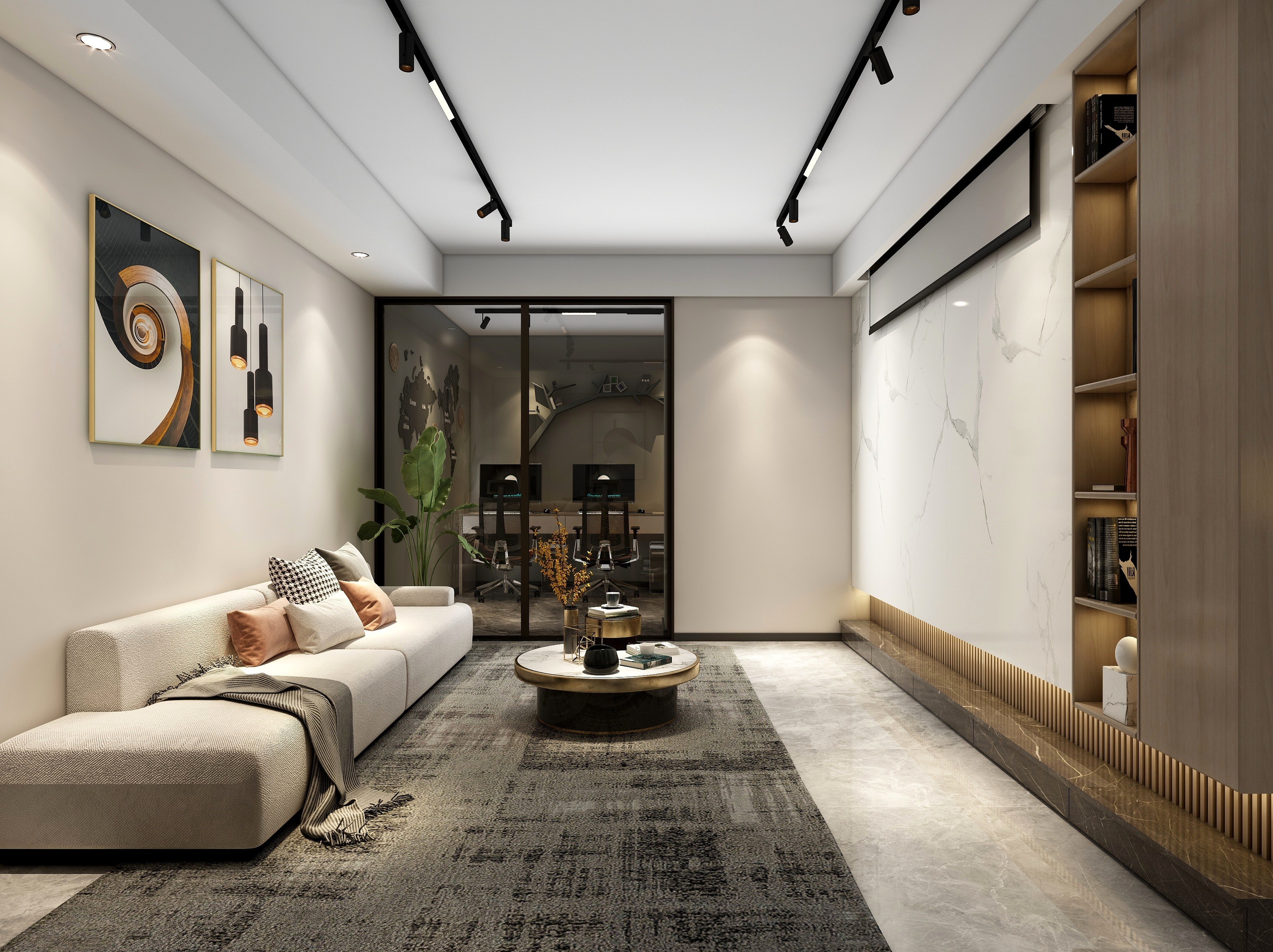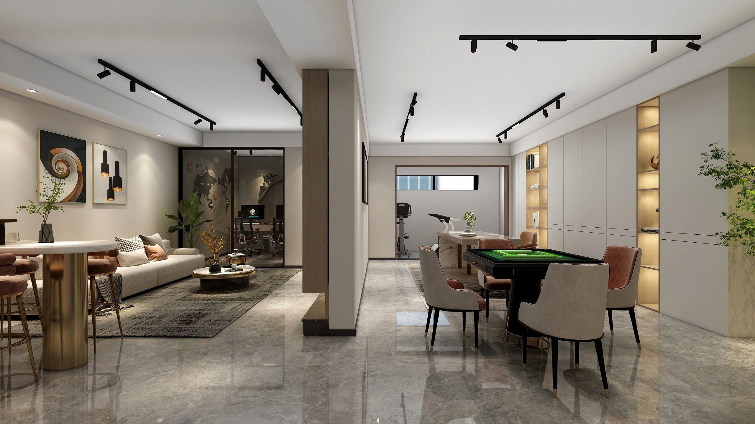 现代简约风格,次方案亮点主要在于功能性的运用,根据业主生活习惯和需求,布置了影音室,麻将室,电镜室,健身房,区域划分比较明显,灯光上由于有地下室的原因所以灯光会比较复杂,采用了比较多的明装轨道灯,增加照明亮度的同时提升氛围感,色彩用以暖色调增加舒适感,其余软装木作也没有采用造型,而是以简单大方为主。
