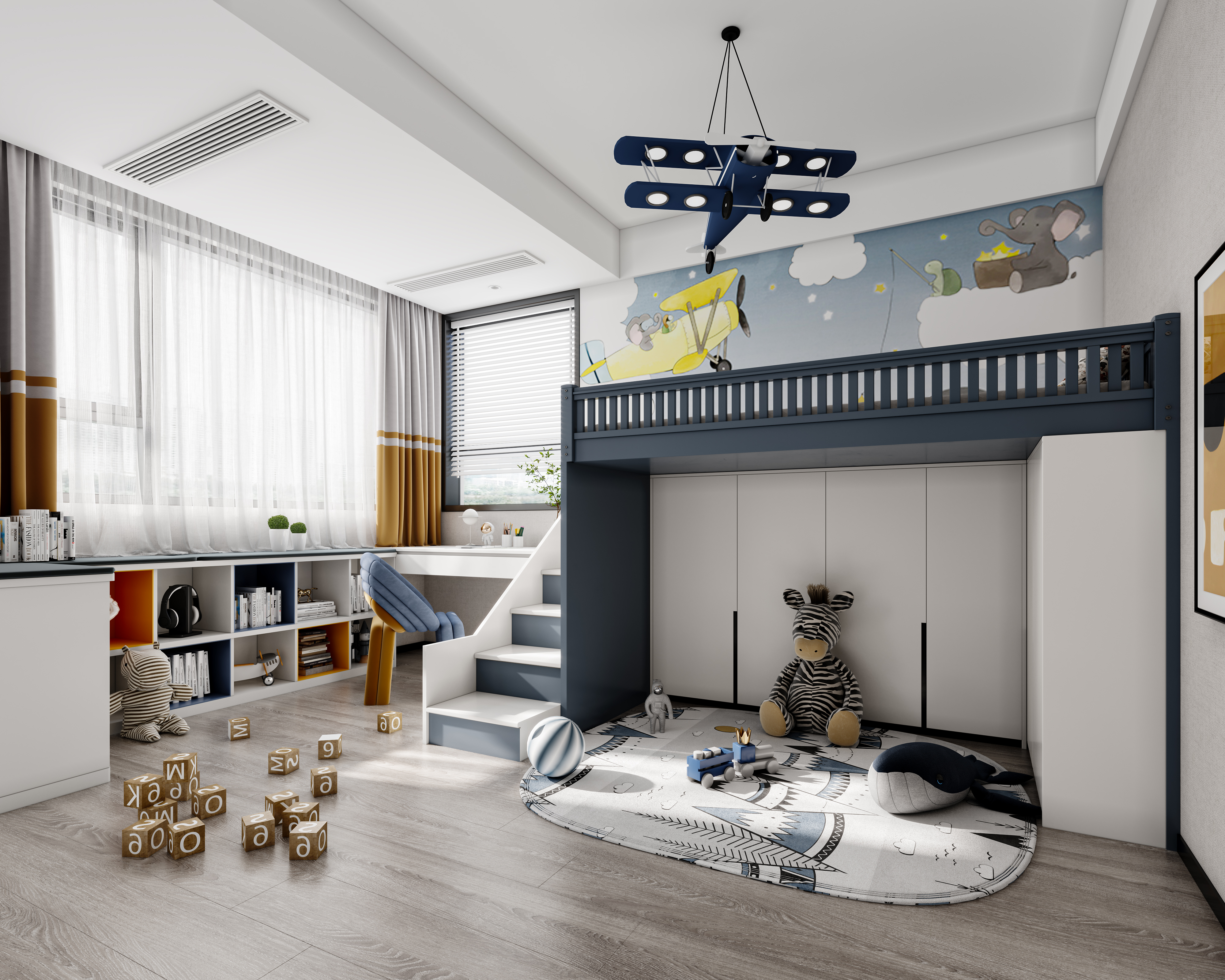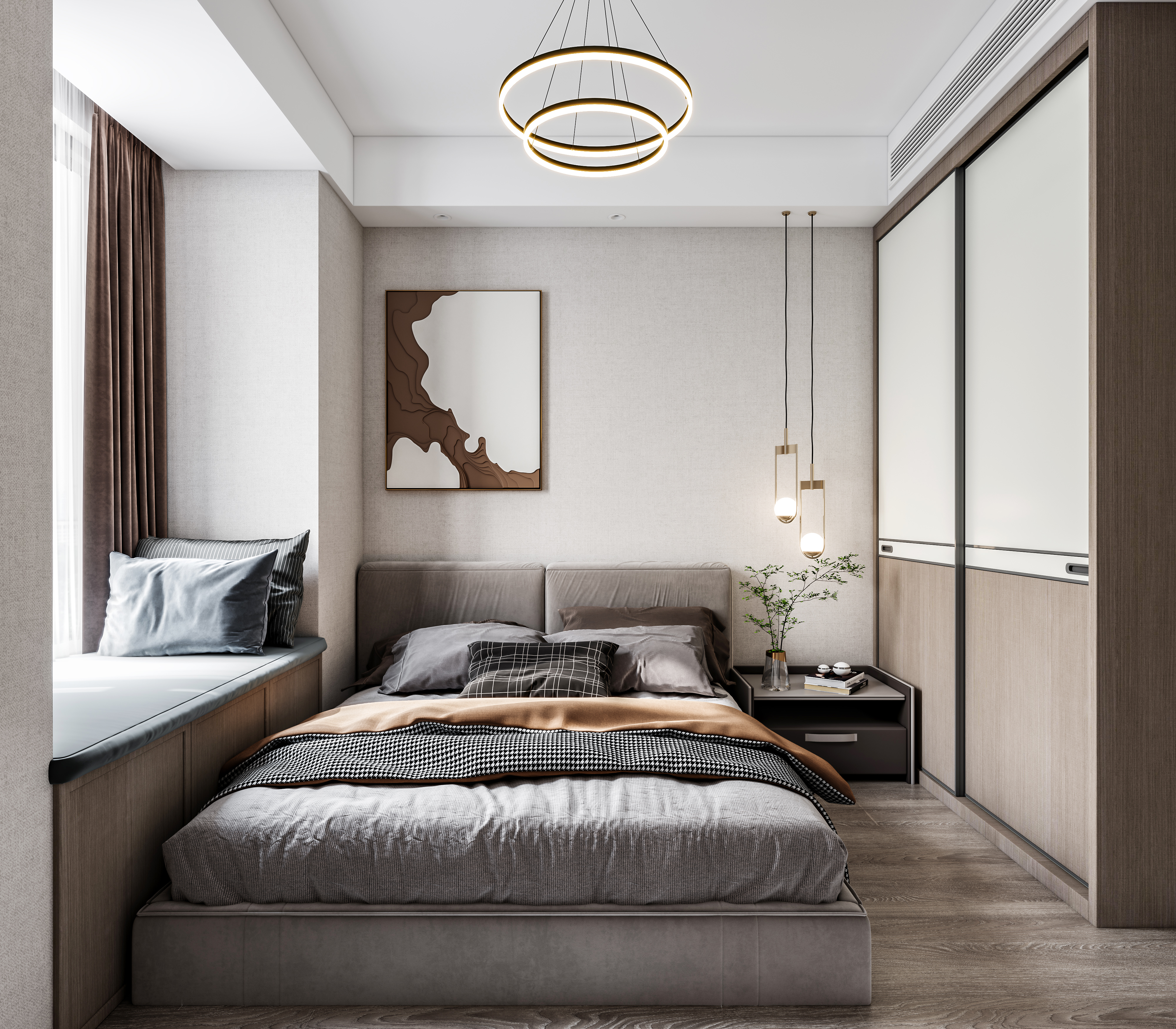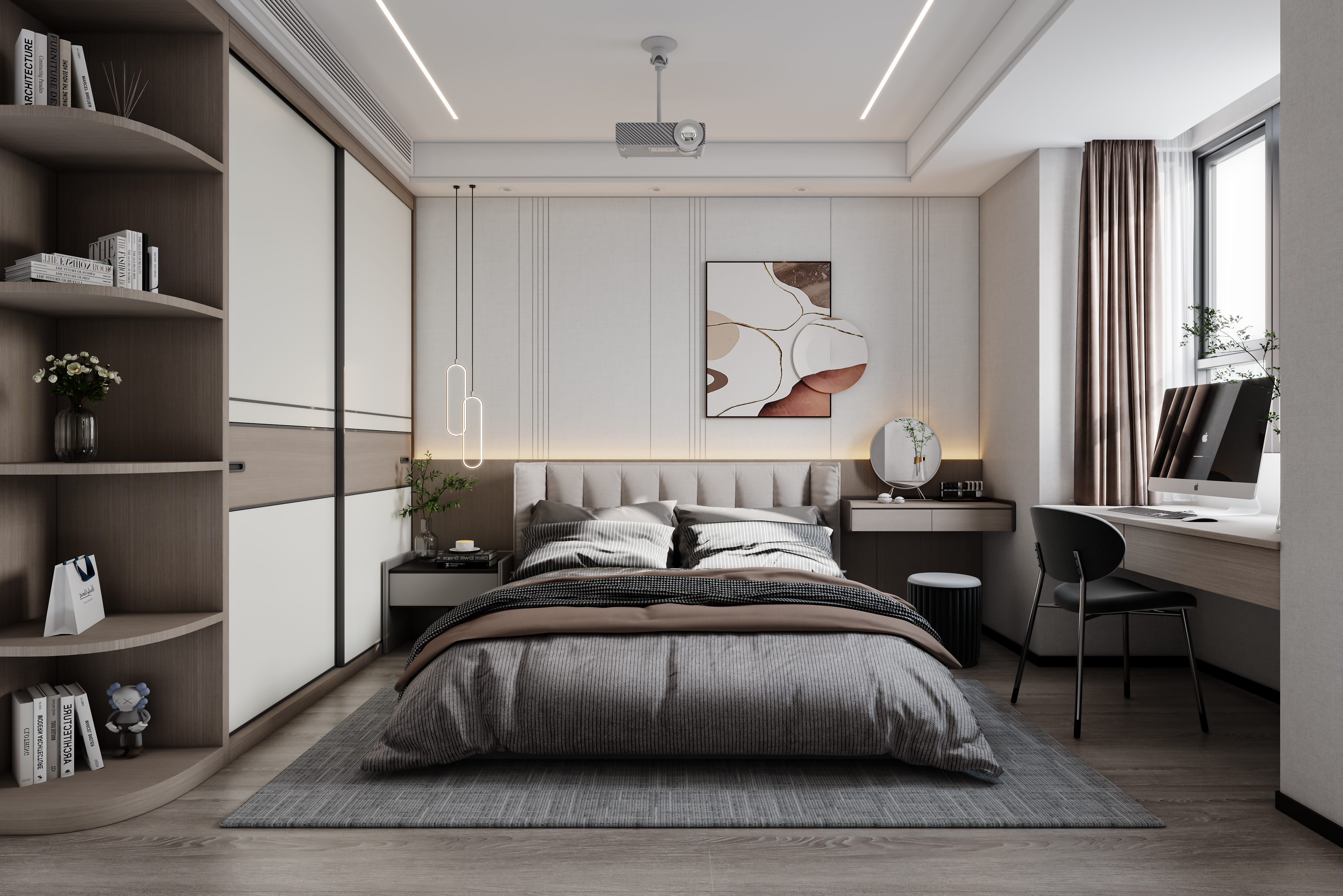 业主是两人都是上班人员,对生活品质要求比较高,特别对环保要求比较高,要求至少保留3个卧室,2个卫生间,喜欢暖色调、现代风格,稍微带点轻奢,要求简单的设计,但是又不失整体的效果,储物一定要多。客厅电视背景墙采用岩板+展示柜,体现出了客厅的丰富;主卧室的背景墙相对比较简单,采用硬包的手法,体现出了卧室的温馨感。儿童采用主题墙布,让孩子充满想象力。