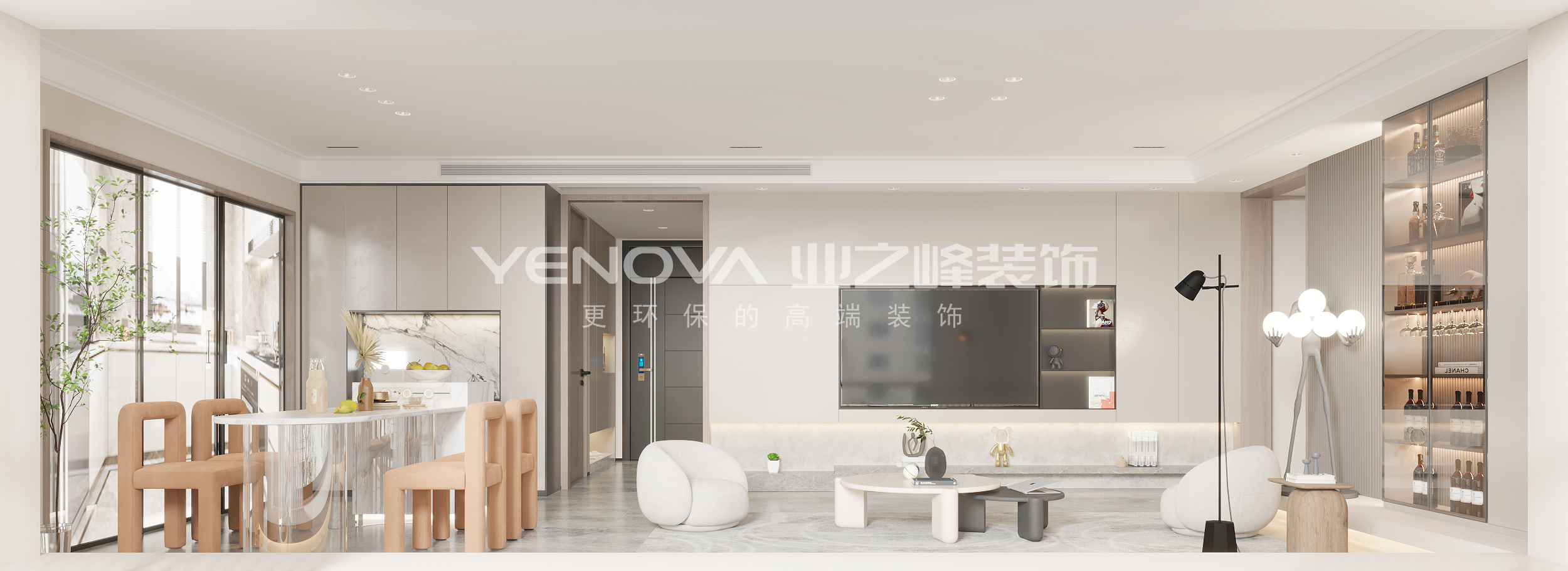 根据业主需求,定义为现代风格之家,采用中西厨双厨房的形式,客厅放上一体式餐桌岛台,与沙发毗邻,与客厅融为一体,增加家人之间的互动,有一定的趣味性!