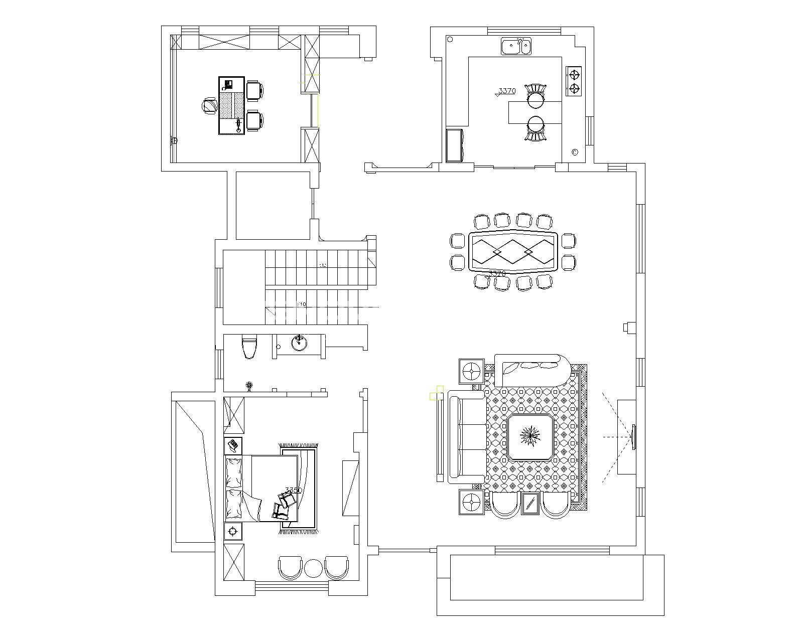 用线条勾勒的白描形式将意境烘托出;一层大厅考虑女业主的优雅时尚气质,采用了现代感的轻奢新中式基调,将香槟金属线条的时尚感与中式的古朴气质形成对比,同时纳入轻奢现代的客厅沙发与略带古朴的餐桌椅进行对比,形成有文化底蕴又不失现代气息的大厅风格。