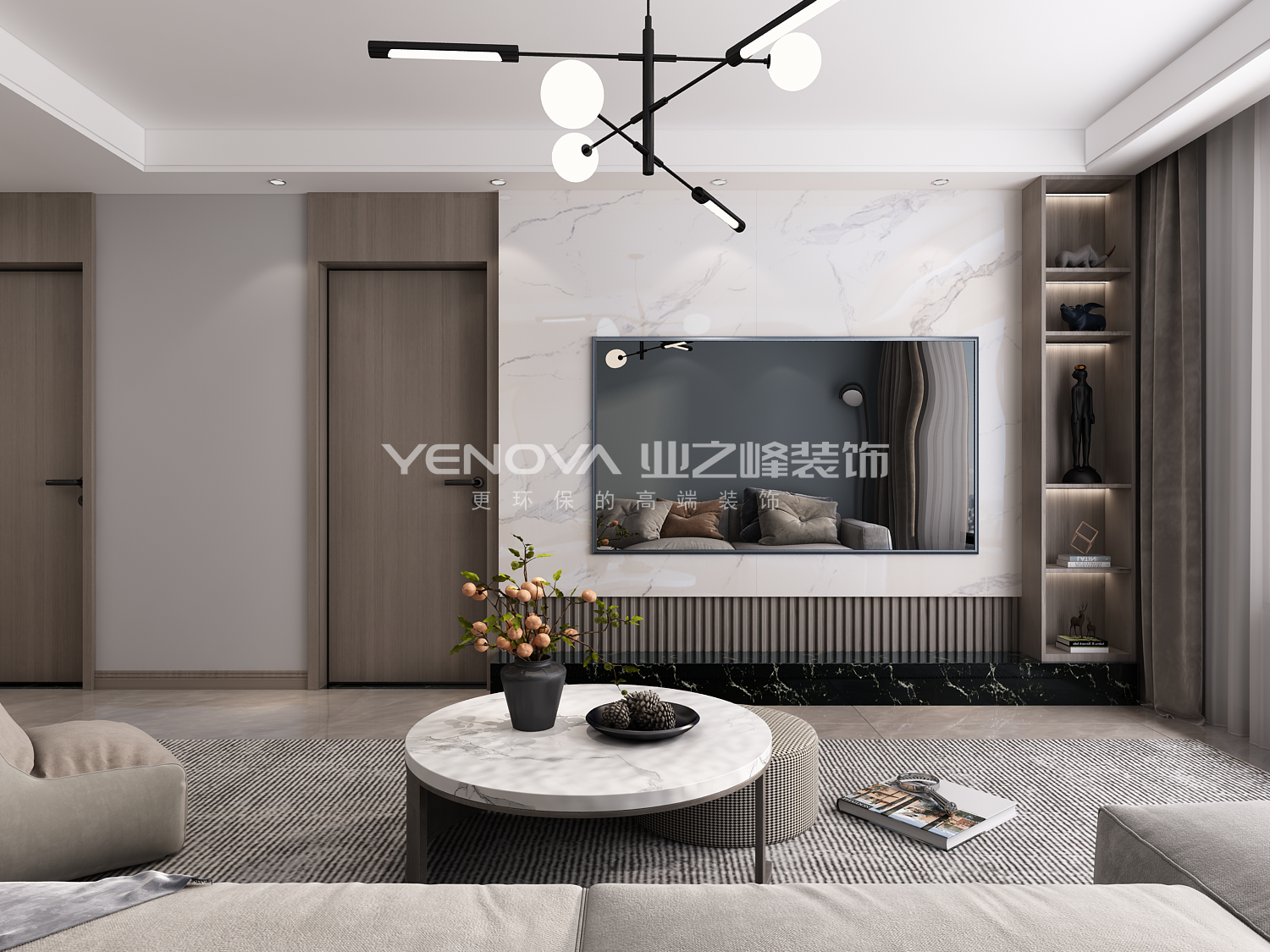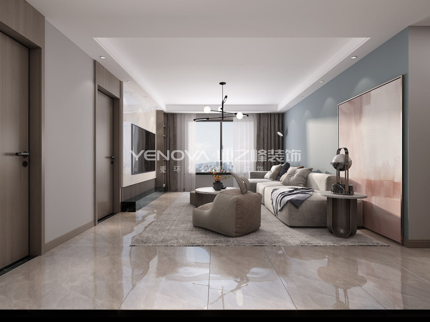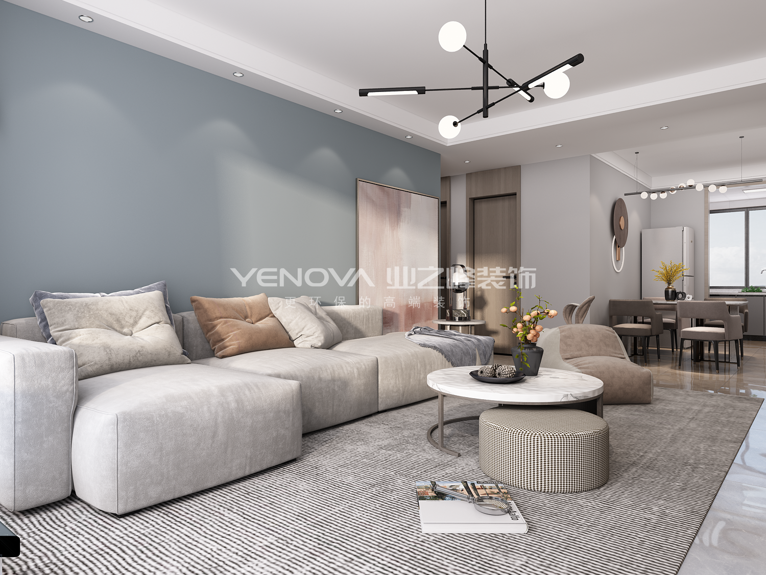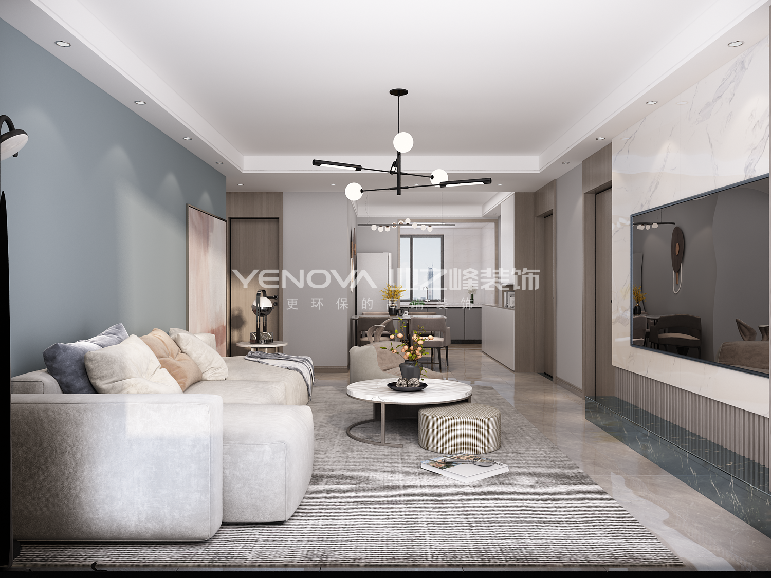 本案是现代简约的风格,同时也是一对新婚夫妇的新家,客户要求要现代简约的风格,但又觉得简约风格有些许冷清,和客户反复沟通得如下方案,入门口左手边是客厅,客厅影视墙主体是大理石,下是格栅木板,整体搭配简洁大气体现出房主超高品味,入门右手是餐厅,与餐厅相连是一个开放式厨房,在视觉上扩大了空间。让房间整体显得更宽敞大气。这套方案整体以浅灰色和浅木色为主,墙面为浅灰色,但在背景做了个蓝色设计,会让整体浅灰色墙体加个亮点不会显得冷清,这套方案也多做了柜子,解决客户说东西太多、没地方安置的烦恼,多数做的是木板门除了影视墙的门板,这样为了显得家里更简单、简洁。