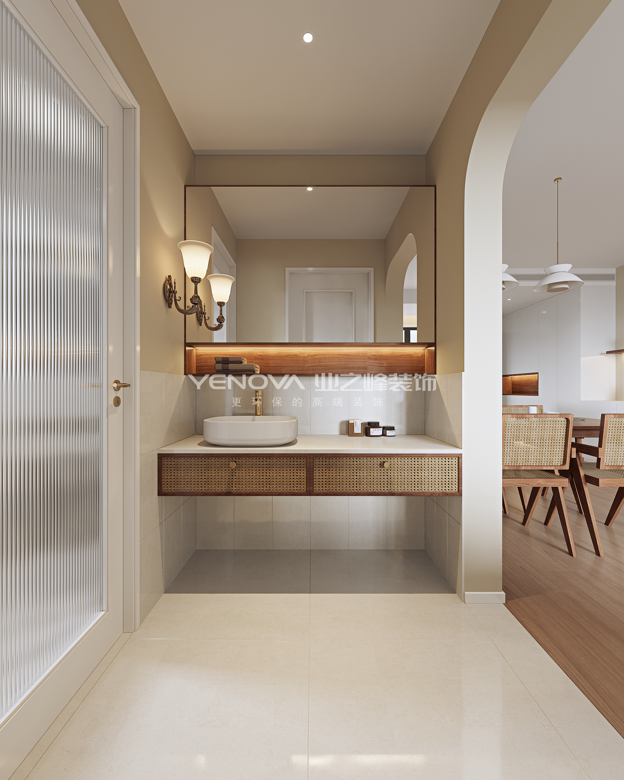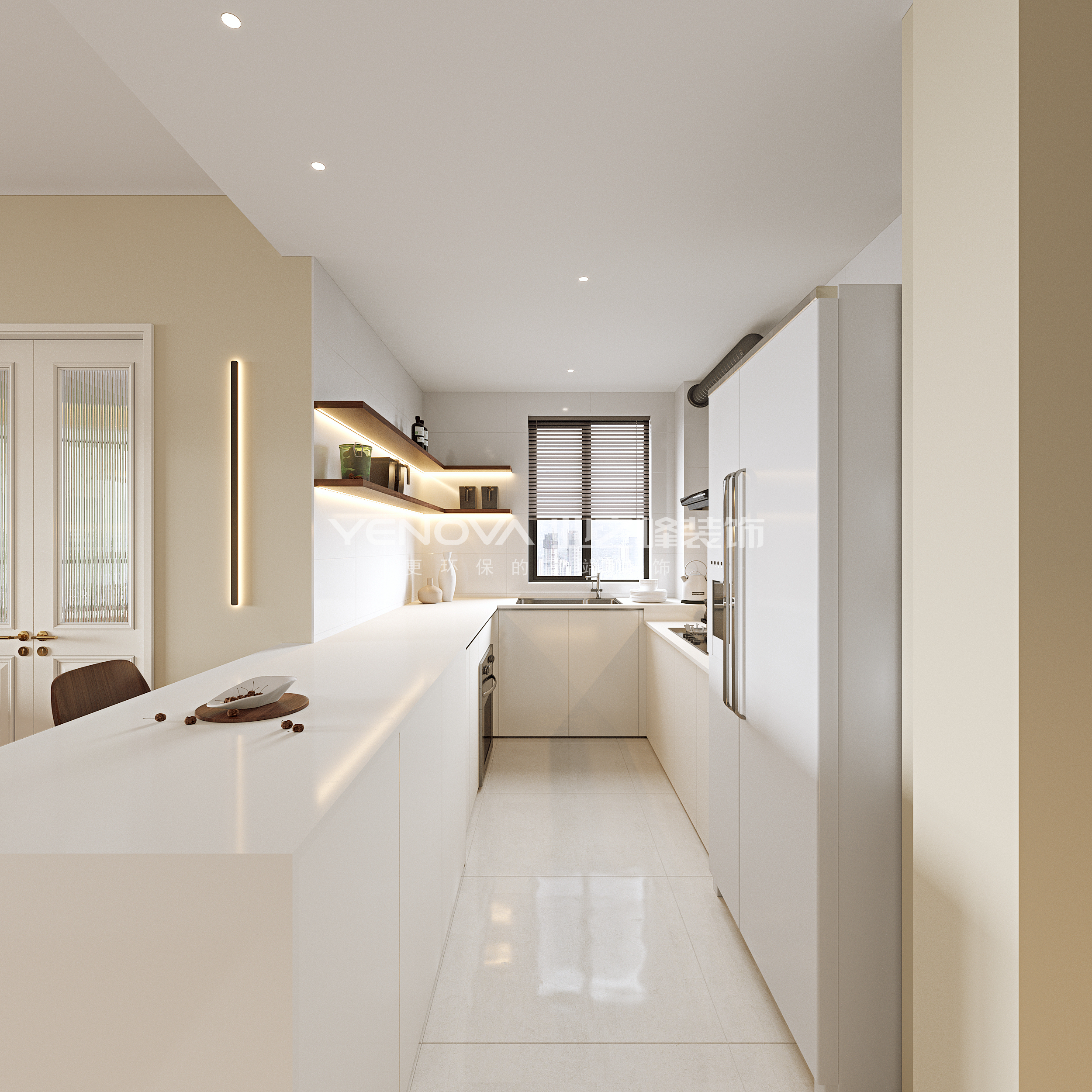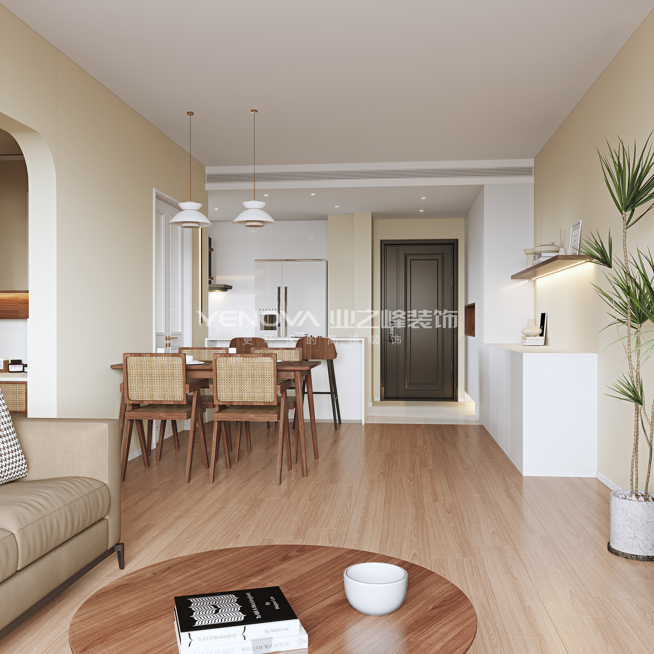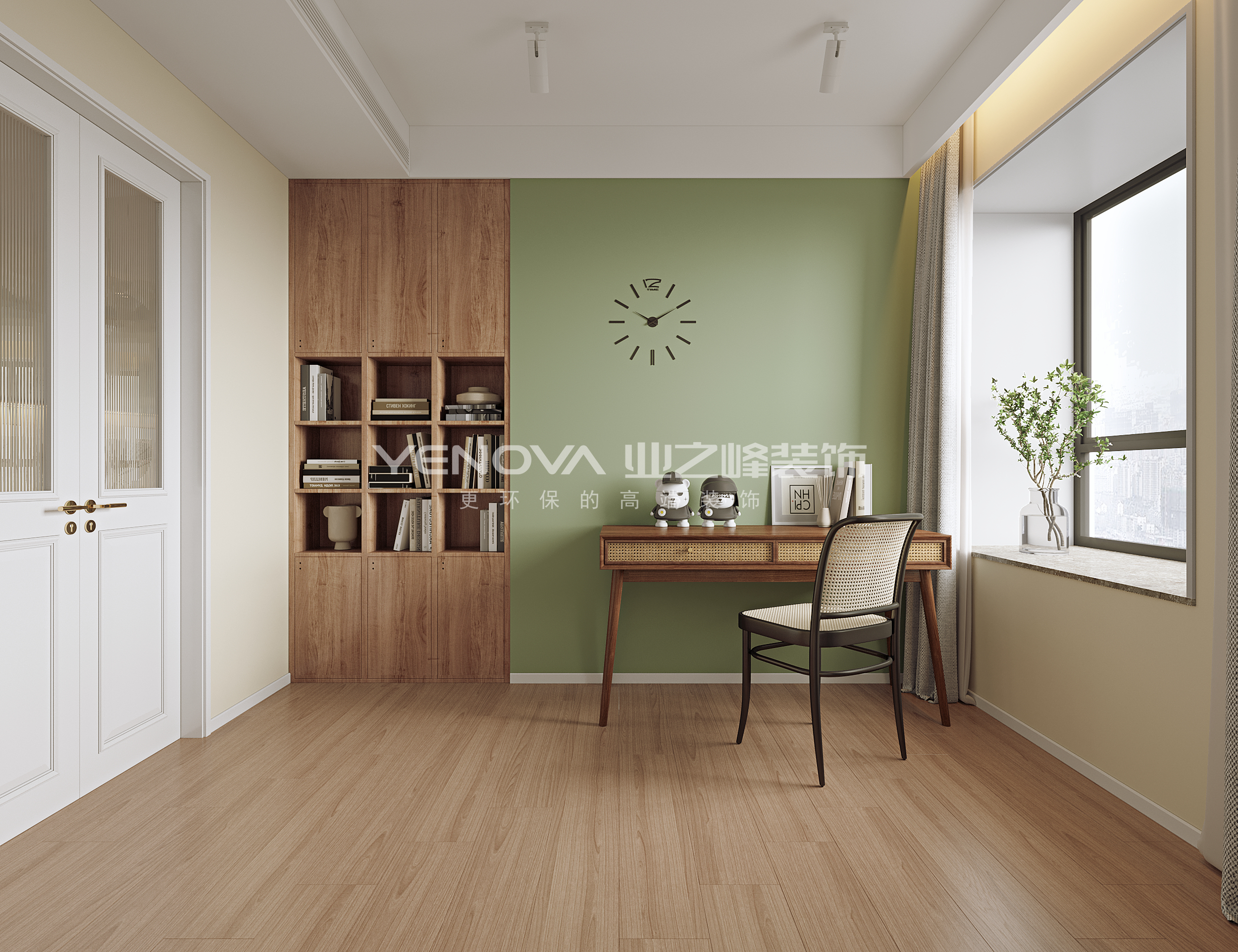 本案业主是一位90后女孩子,独立居住。喜欢北欧的小浪漫,本案入户处打开厨房、通透玄关处采光,厨房地柜采用高低柜连接,提高灶具与菜盆使用舒适度,地柜延伸出餐厅成为岛台,加以壁灯点缀,可以在这里享受咖啡与阅读、品尝美食、惬意愉悦。打破规律改变了书房原有的开门方向换到餐厅的位置,原有的书房门便增加了干区的功能,原有阳台洗衣机得以挪到卫生间,使得功能区分更加明确。书房书桌位置用墨绿色乳胶漆调和,空间复古有趣,赋予美感,在这里享受下午茶的惬意与阳光下的阅读。主卧室全屋奶咖色乳胶漆、搭配复古垂钓灯、一门到顶大衣柜,空间简约而具有功能性、复古而雅致。