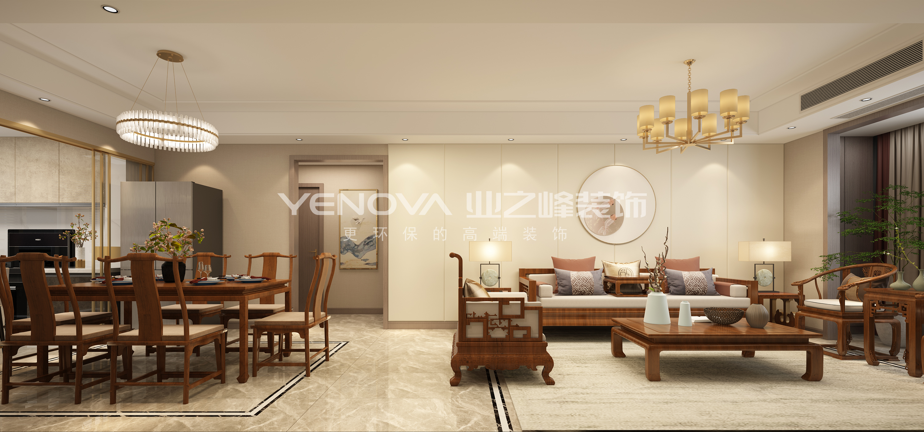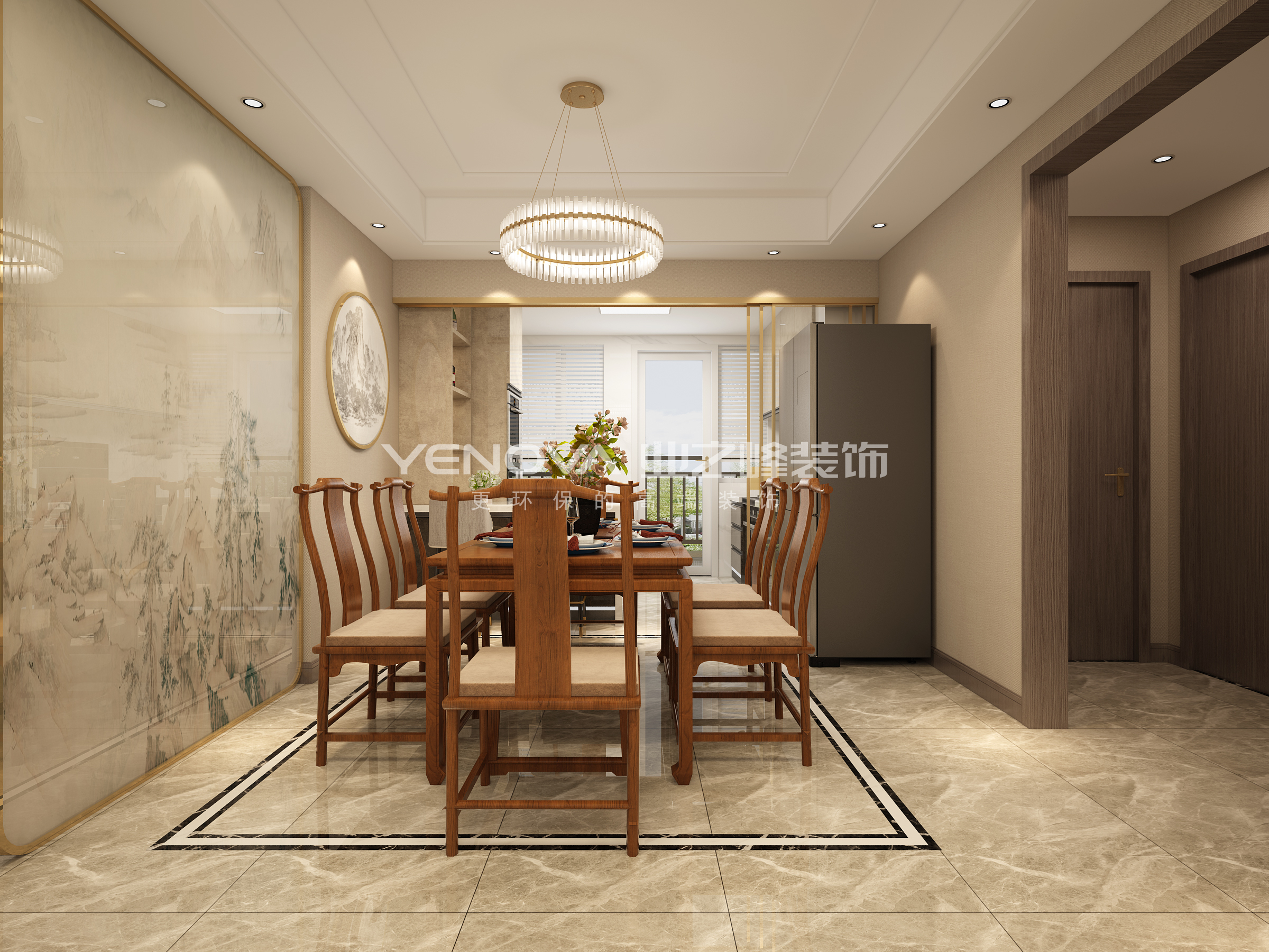 本案是一个三口之家,业主喜欢中式红木带来的传统质感,整体优雅知性、红木家具清幽而典雅。入户玄关处通高定制鞋柜、增强储物功能性,进门设计中式唯美意境艺术玻璃、既起到隔断作用,提高空间私密性,也将空间的风雅意蕴铺满,延伸入内。厨房台面延伸至垭口区域,既增加空间储物、也起到岛台的功能性,厨房联动玻璃推拉门,开放式与封闭式场景相切换,使得居住有了更多的可能性。餐厅雅致的吊灯与中式唯美典雅的餐桌,让生活富有美感。客厅延伸中式红木家具的雅致之感,沙发背景设计硬包与线条的结合,搭配中式装饰画,电视背景大理石与实木墙板结合。现代与中式气韵并存,沉稳厚重,意犹未尽。