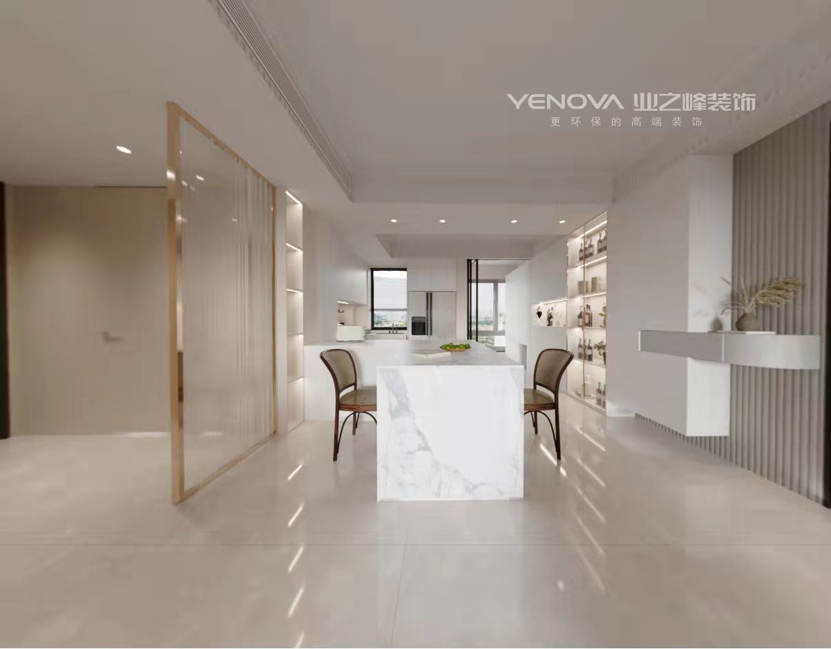 厨房采用了开放式,加上现代化的橱柜以及岛台式餐桌,并将洗碗池调整位置,保证良好的采光。