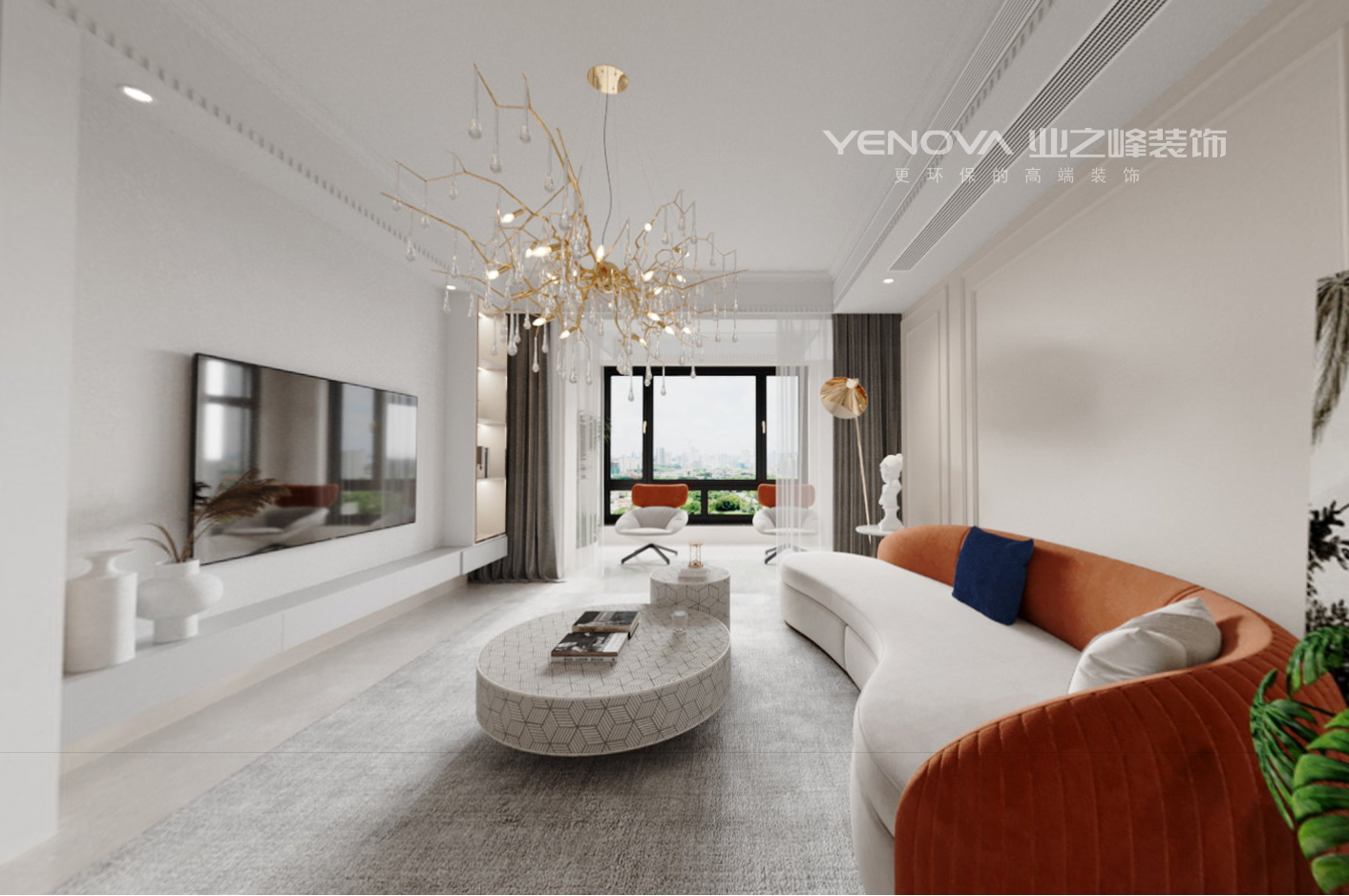 客厅为了保证吊顶的统一性,特意加长沙发前后两面的吊顶以保证出风口。整体色调多以高雅灰与哑光白为主色调进行构造,搭配纯色家具,加入充满活力的绿色植物,雅白沙发来进行点缀,打造整体客厅温馨自然的整体氛围感。