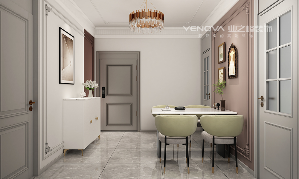润都锦园的户型从整体布局来看,运用的法式轻奢风格,采用了对称式布局进行设计,同时也结合简单的几何线条与浅颜色进行搭配,使得整体呈现淡雅低调的视觉感。从颜色上看,运用浅色系作为主色调,例如乳白,象牙白等颜色,同时也搭配金属条等亮色进行点缀,让整个空间更加舒适柔和,也突出视觉层次感,为空间增加了温度。