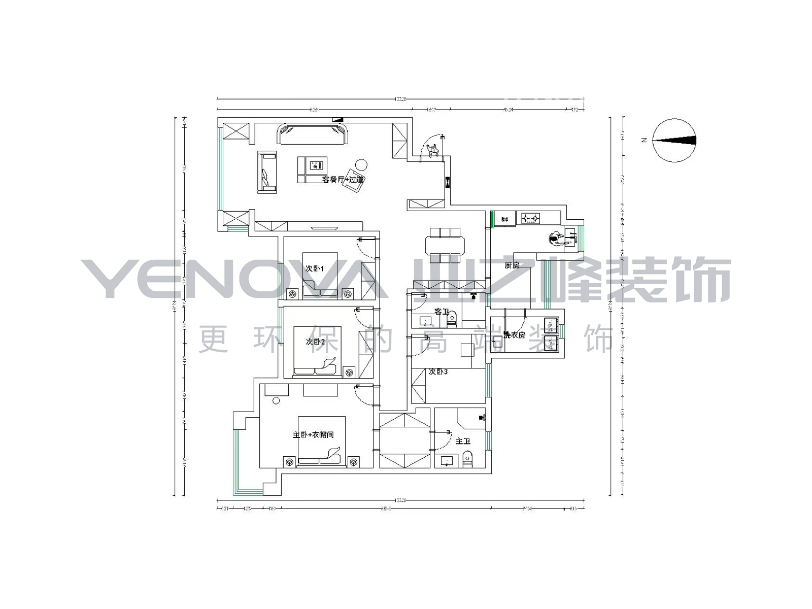 本案是五口人居住的三代同堂案例,整体户型的流线较为简单、实用。餐厅、客厅、过道空间形成独立却又完整空间,空间功能分布合理。各个房间动静分区较为合理。 主卧、客厅的采光比较好,客厅有个大阳台,相当惬意。