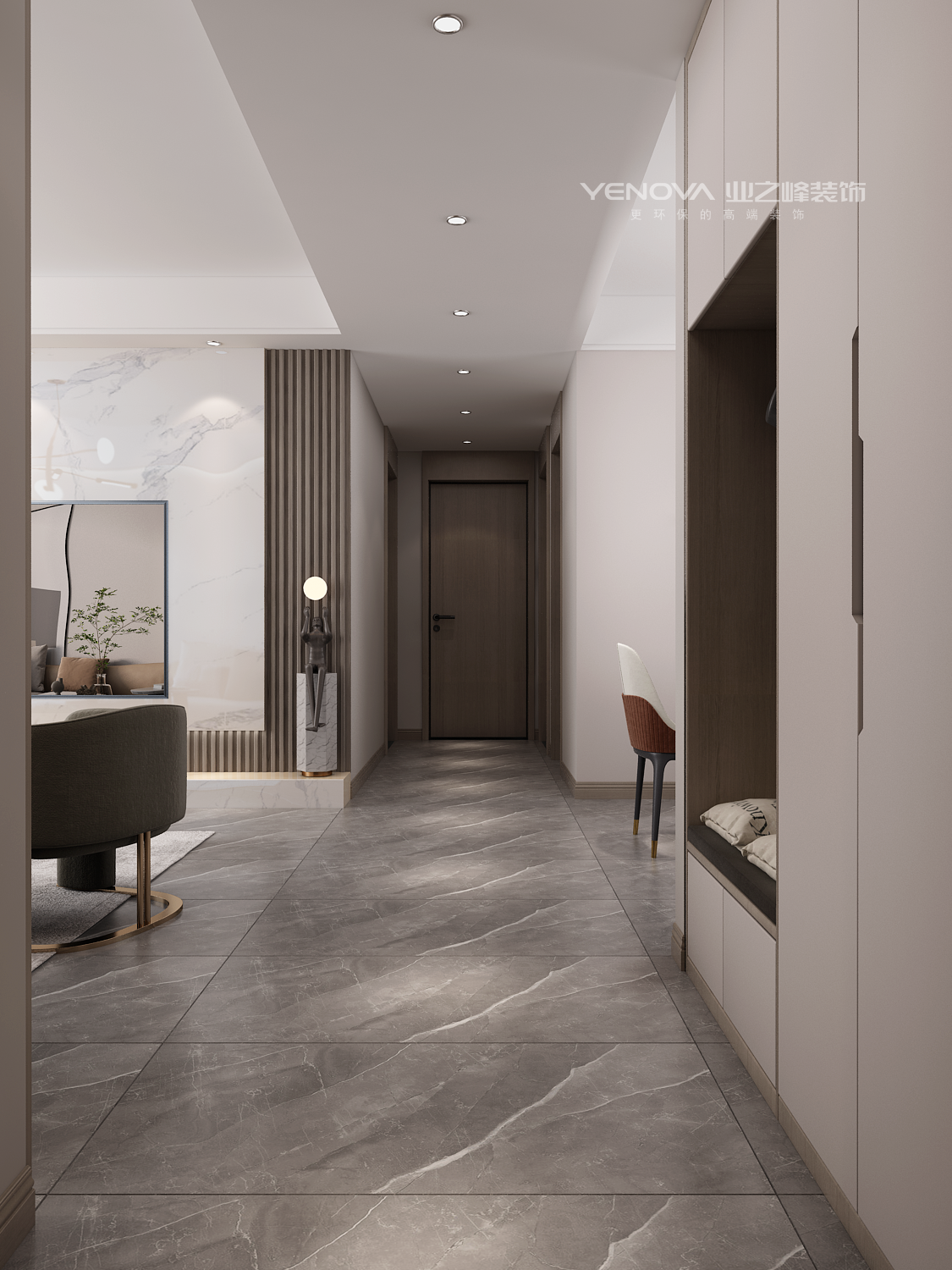 本案是一对新婚夫妇,要求要现代简约风格的装修,根据两人要求成立了这套方案,一进门右手边打造了衣鞋柜一体,还携带了换鞋凳下层放鞋,侧柜挂衣物,让入门得到最大的方便。本案设计主要以方便,舒适为主,在客厅影视墙做了个大理石的石材,让整个空间彰显大气,影视墙上有一列展示柜可以放一些摆设和藏酒等。在客厅做了少许氛围灯,让整体空间的调色更温馨。