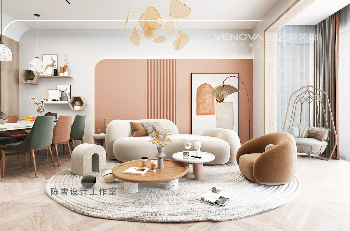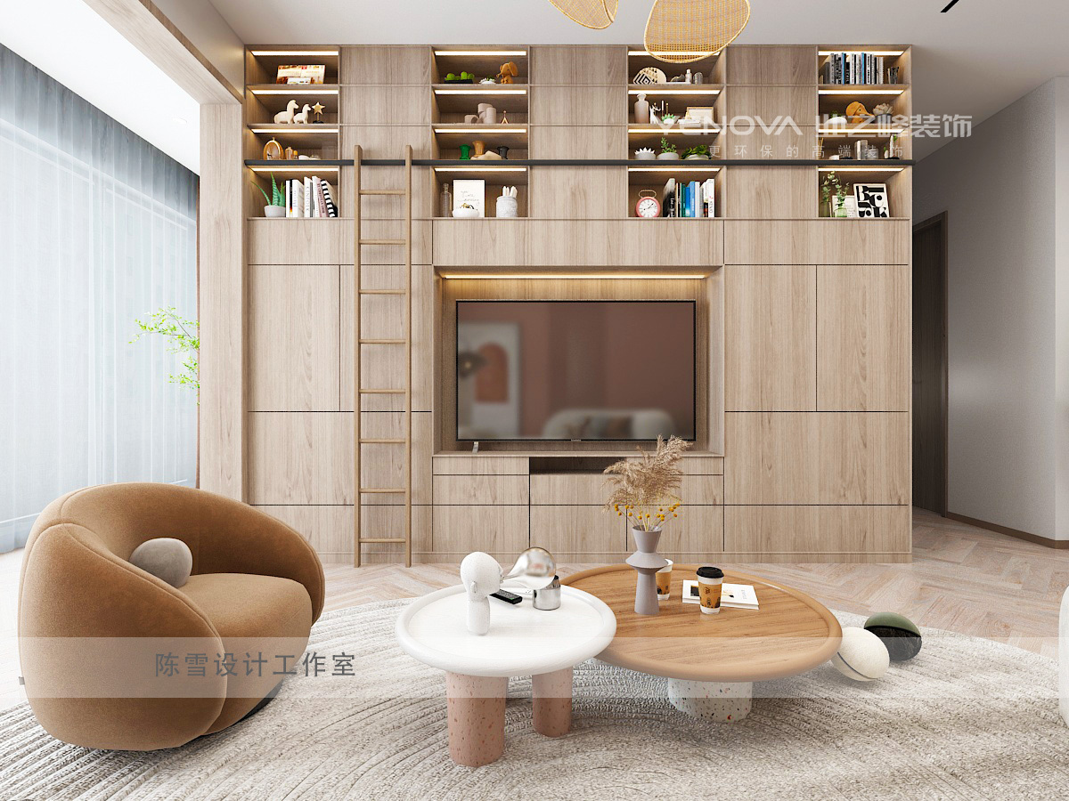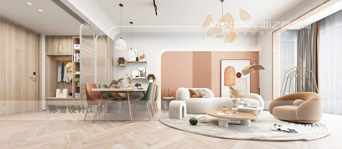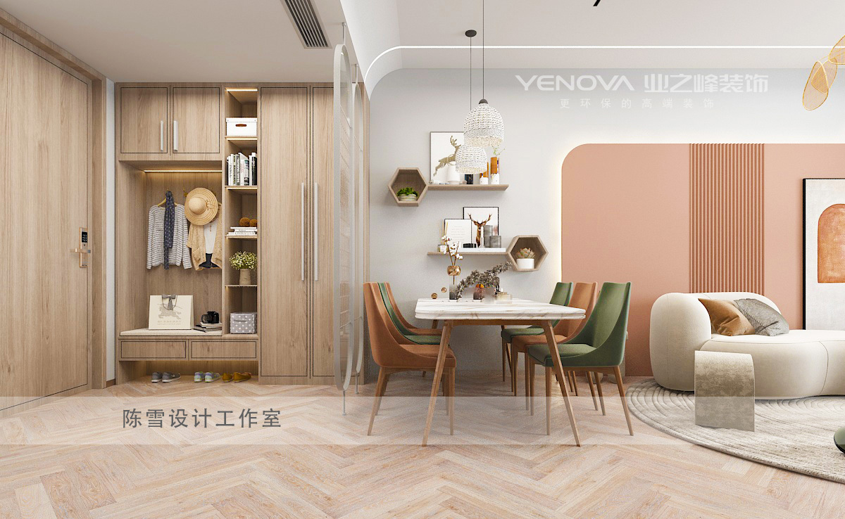 本案例为现代风格,业主作为婚房,温馨,以原木色为主,业主喜欢亮色,沙发背景墙用亮色提亮,客厅做弧形吊顶增加层次感,门口玄关设计,不遮挡采光的同时也保证了隐私。