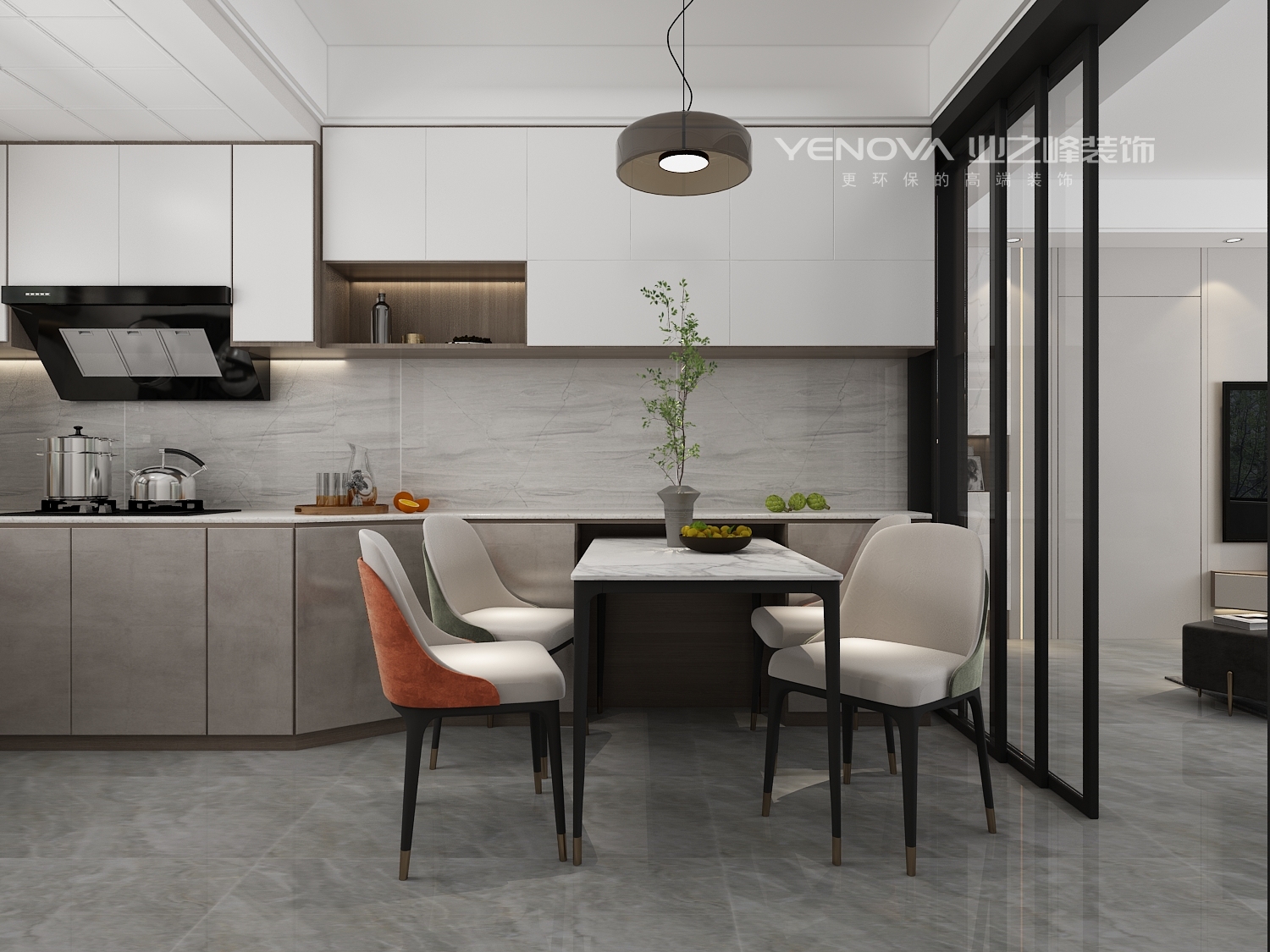 一半烟火,一般清欢,锅碗瓢盆交响曲,柴米油盐酱醋茶。厨房相邻餐厅,推拉门可开可合,让中餐和西餐的空间使用自由转换。 柜体以浅色系为主,辅以原木、玻璃和金属材质,温润明亮,穿插深调,彰显高端品位。充足的收纳和操作台面让空间的合理利用和简洁有序相得益彰。