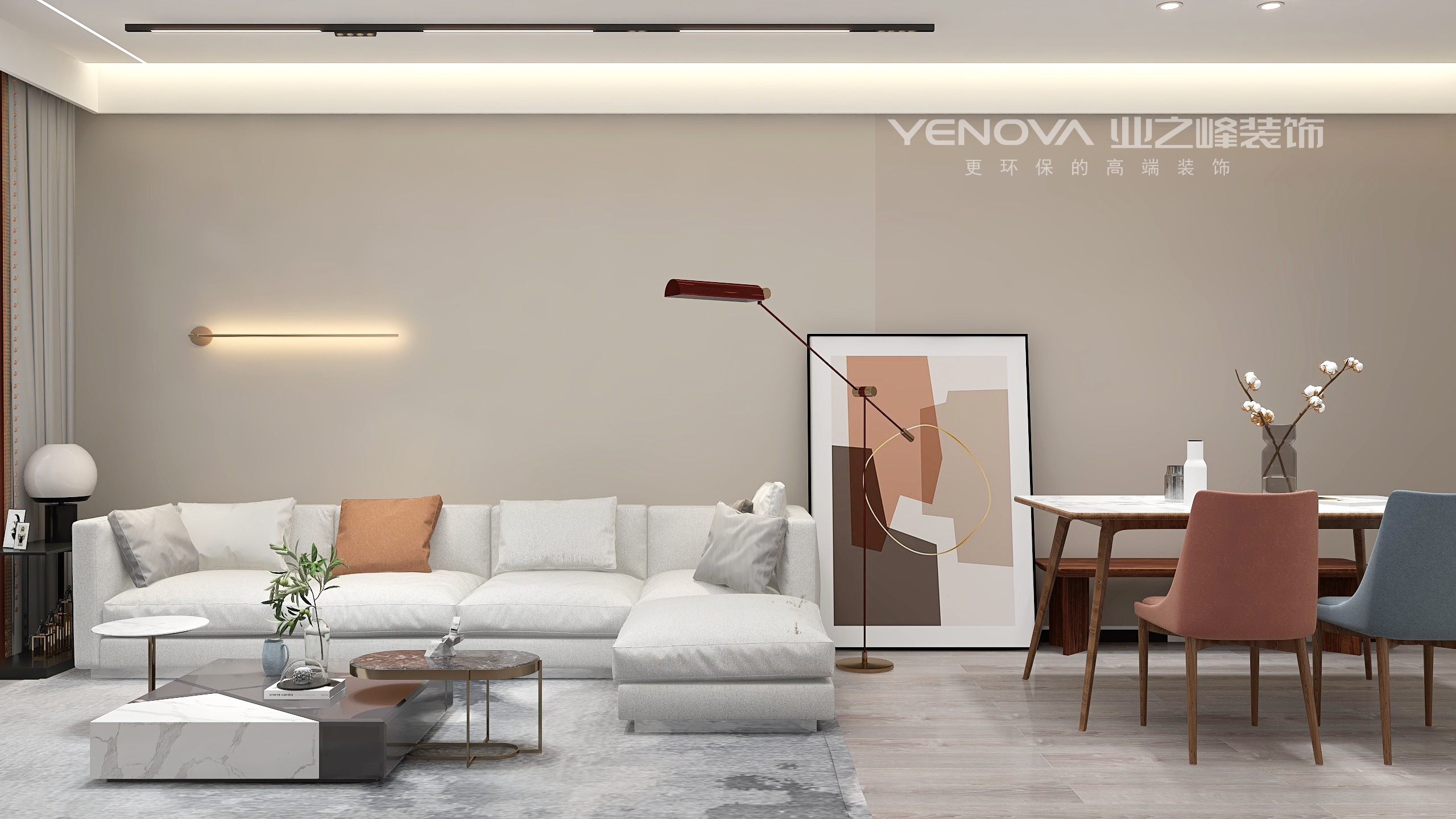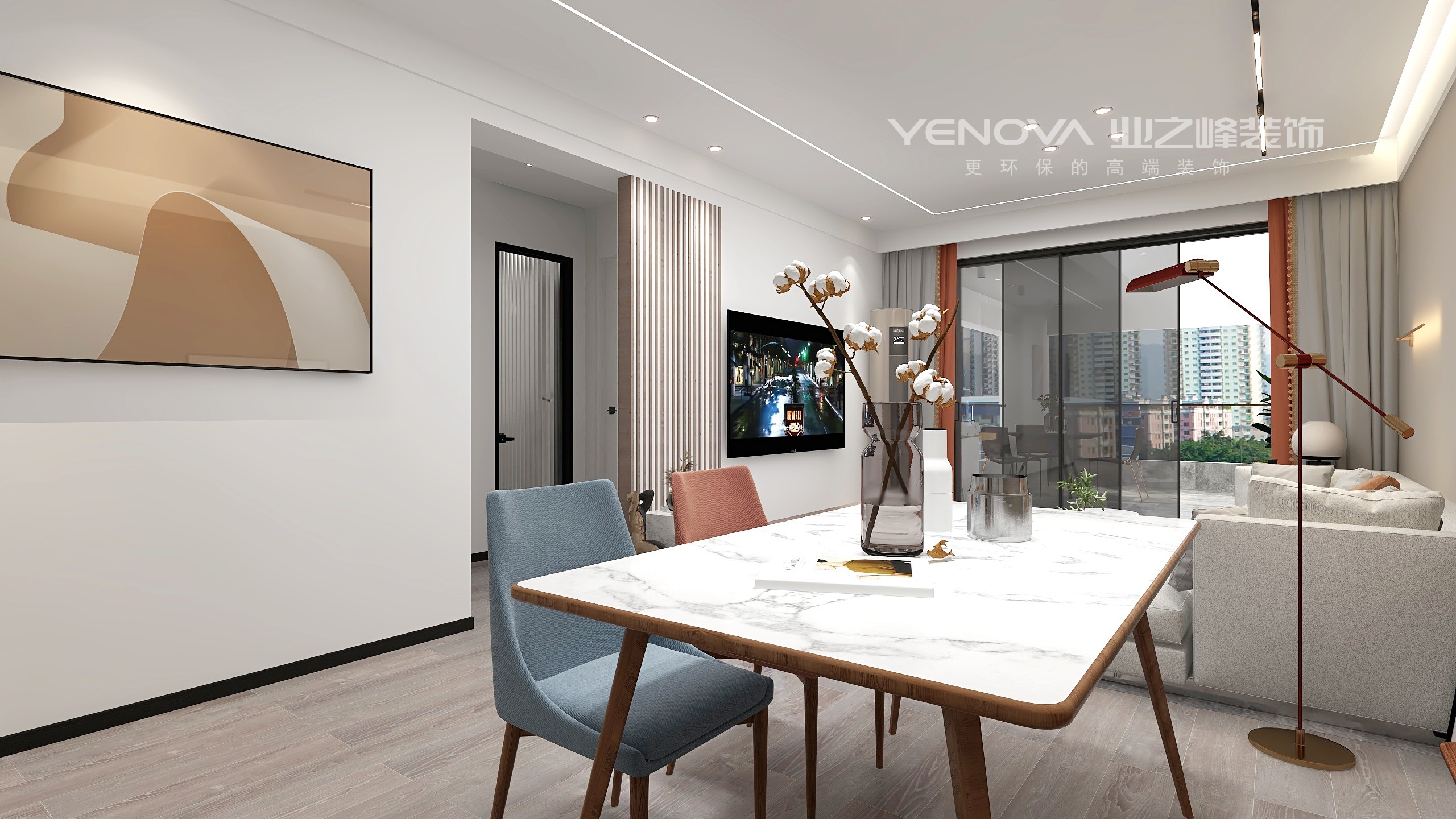 客餐厅空间没变,天花造型采用的是无主灯设计,以灯光搭配上墙面色彩的分区,凸显出现代风格的气息,电视墙以简单的白色搭配成品线条,电视墙显得不在单调。