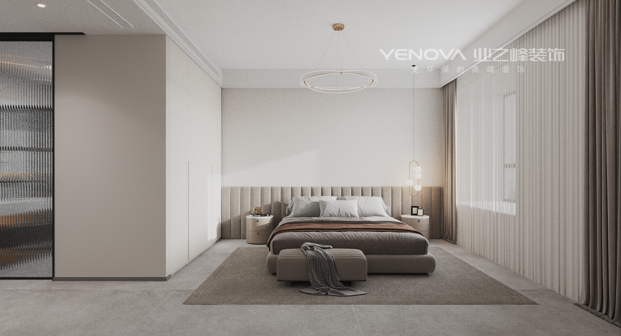 原始户型为四室两厅格局,厅的面积较大,可容纳主人会客与用餐。居住人群是一对夫妻、老人和小孩,孩子的房间需要一个供学习的书桌,还要有孩子娱乐玩耍,可以活动的空间。根据客户需求,结构方面进行微调。进门入户做鞋柜、餐边柜,空间规整,节约空间。客厅空间的线条勾勒出墙体,同色的碰撞以深浅形成艺术美感,线状的灯光与茶几的绿植给空间添加了小情调。棕色的桌椅加上绿植的点缀,营造出温馨浪漫的氛围,侧面墙定制了餐边柜,部分设计为开放柜,具有实用价值。主卧室布置较为温馨,作为主人的私密空间,主要以功能性和实用舒适为考虑的重点。床头造型简约自然,边几小巧实用,也显得精致讲究。儿童房整体以粉色为主,没有较大的家具,给孩子留了较多的空间,提供孩子娱乐玩耍。次卧床头设计了隐藏灯带,旁边窗户那做了休闲椅,使空间更加温馨。