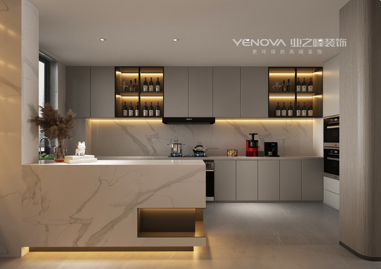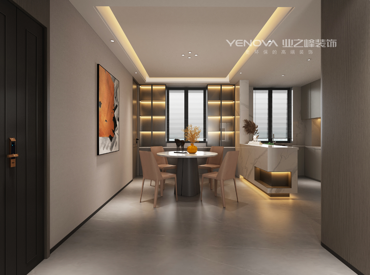 客餐厅以米灰咖为主色调,打造温馨舒适的居家氛围,木饰面烤漆板和石料三种材质碰撞,融合出简约质感,浮花石纹岩板背景墙和烤漆板花纹点缀得恰到好处,给现代简约风格的家增添了几分新中式的优雅自然。