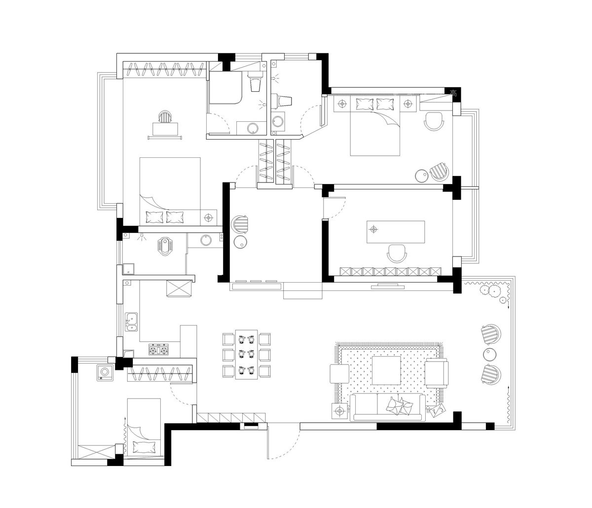 原有户型较为方正,共有四室,由于目前只有年轻夫妻二人居住,因此空间布局安排上可以更加灵活。同时所有空间采光都不错,卫生间均属于明卫,因此原有空间及户型都较为合理,在空间布局设计上不需要做过多的改动。