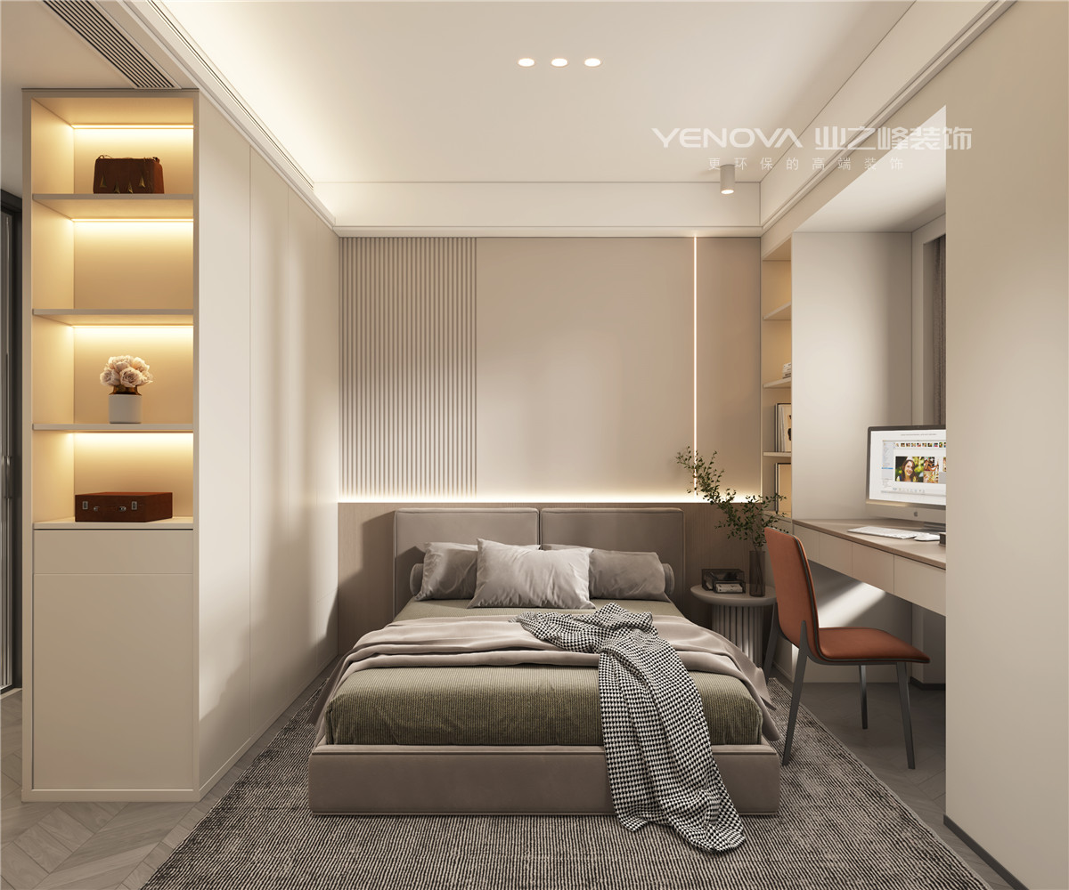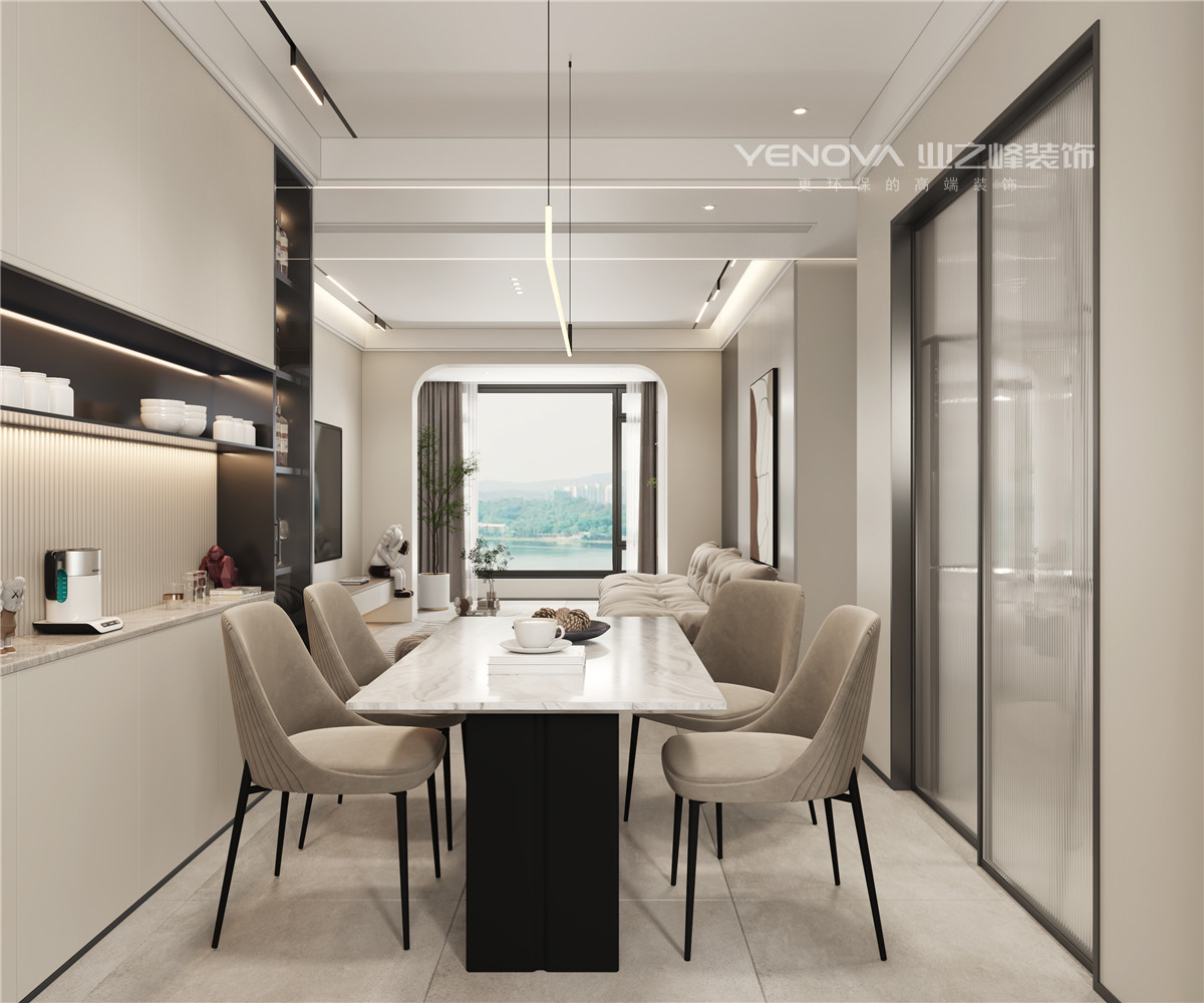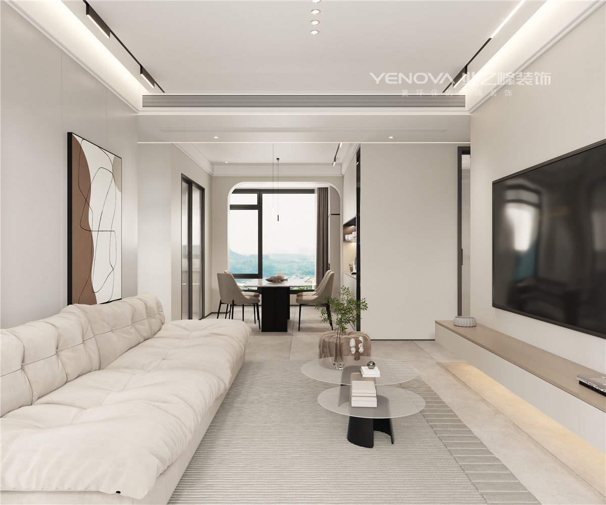 本案例主要以现代简约风格作为主题设计,客厅的无主灯设计放大了整个空间感,简洁的电视墙设计给空间足够的留白,弧形门洞软化了生硬的垭口同时让整个客餐厅空间得到了延伸,大量的点光源和线光源使得每一处细节都得到了完整的体现,简洁,明亮的设计理念展示无疑。