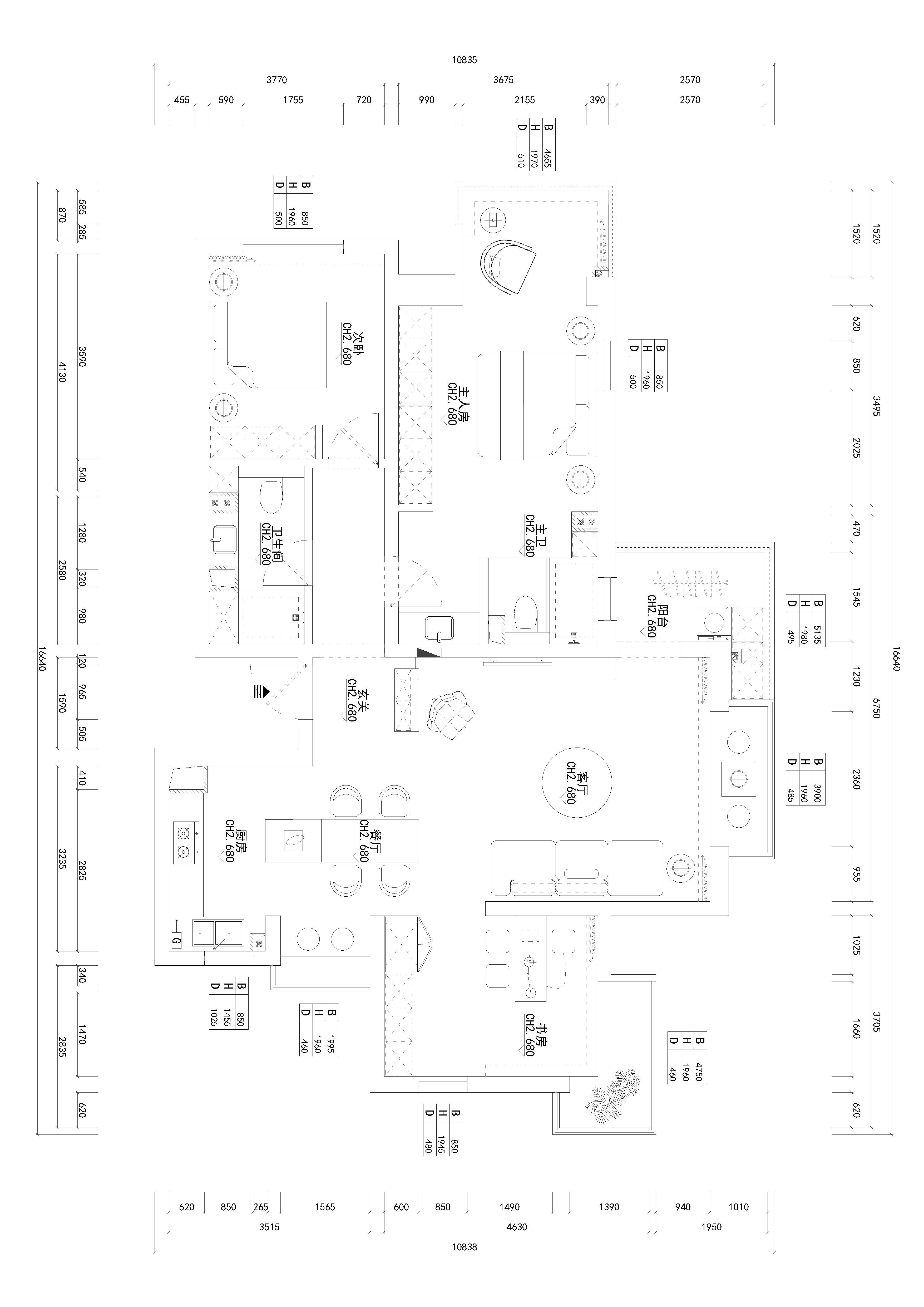 客厅:原始结构中客餐厅空间显空间局促不合理,故我将厨房空间打开,做餐桌岛台一体式,扩大空间视觉感。且做整体无主灯吊顶能够弱化厨房内中间的承重圈梁。原始结构中的洗衣房,我改为吧台区域,与厨房餐厅融为一体,增加房间功能性且体现生活品质。次卧我做了开放式书房,兼具西厨功能。客餐厅,厨房,书房共属公共区域,动线流畅,整体动静分离,不失大气。