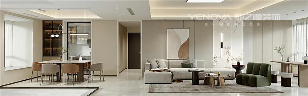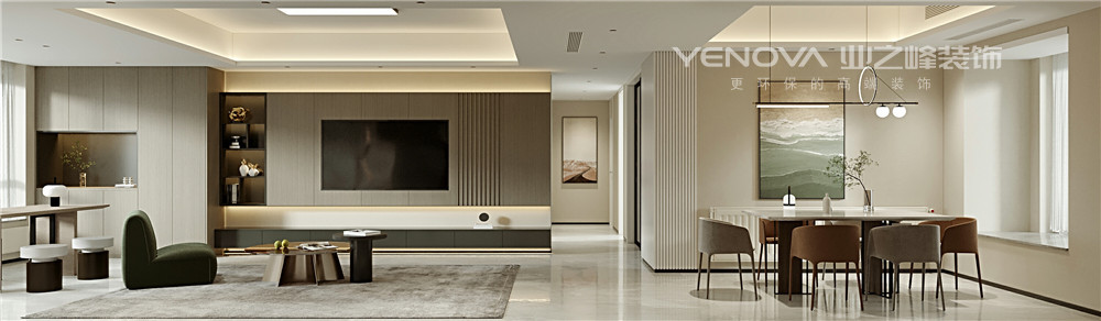 本案例为现代风格,顶面运用平顶及边顶,将空间与空间完美划分,浅沙滩色墙漆,米黄色地砖,尽显温暖。因休闲阳台与客厅贯通,将电视背景与柜体连接做造型,空间感更为整体,电视背景墙做悬空处理,上下两侧暗藏灯带,美观且不失高级感。餐厅,一副艺术挂画,加上格栅造型,简单的装饰,彰显淳朴且优雅的就餐氛围。