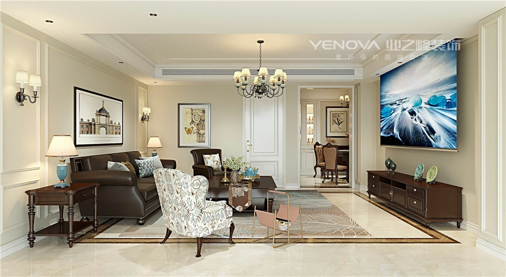 客厅以奶咖色为主色调,搭配深色家具,深与浅的搭配使空间显得端庄稳重。电视墙用艺术石材装饰,四周搭配萨安娜石材线条,让客厅更为华丽大气。