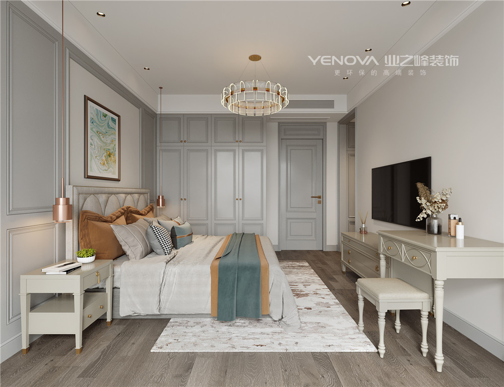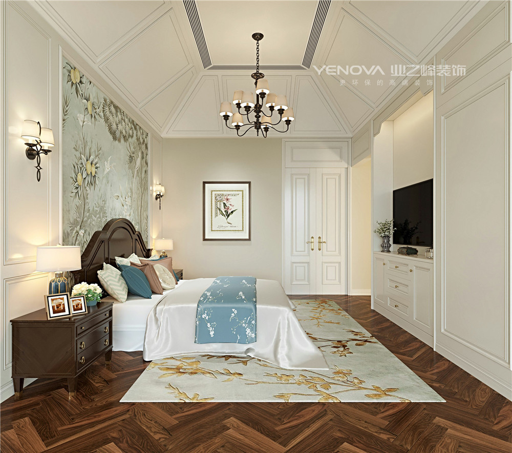 主卧墙面做统一的线条与颜色,添加小面积艺术墙布,天花做石膏板凹凸造型顶,面饰白色乳胶漆,让整体空间更具层次感,搭配上复古的吊灯,使卧室充满了美式的古典韵味。