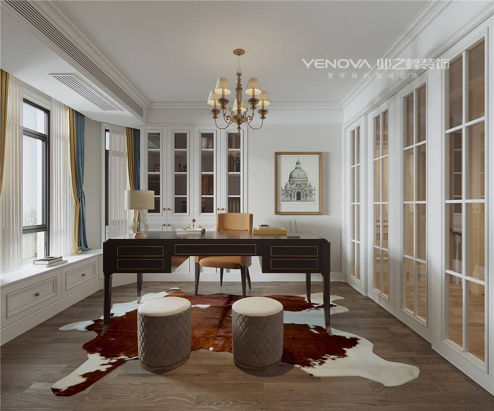 书房以白色为主色调,让空间更为轻松而不沉闷,深色的办公桌加上复古的吊灯,又平添一份稳重。大面积的白色田字格玻璃门让整个空间显得更为宽敞大气。